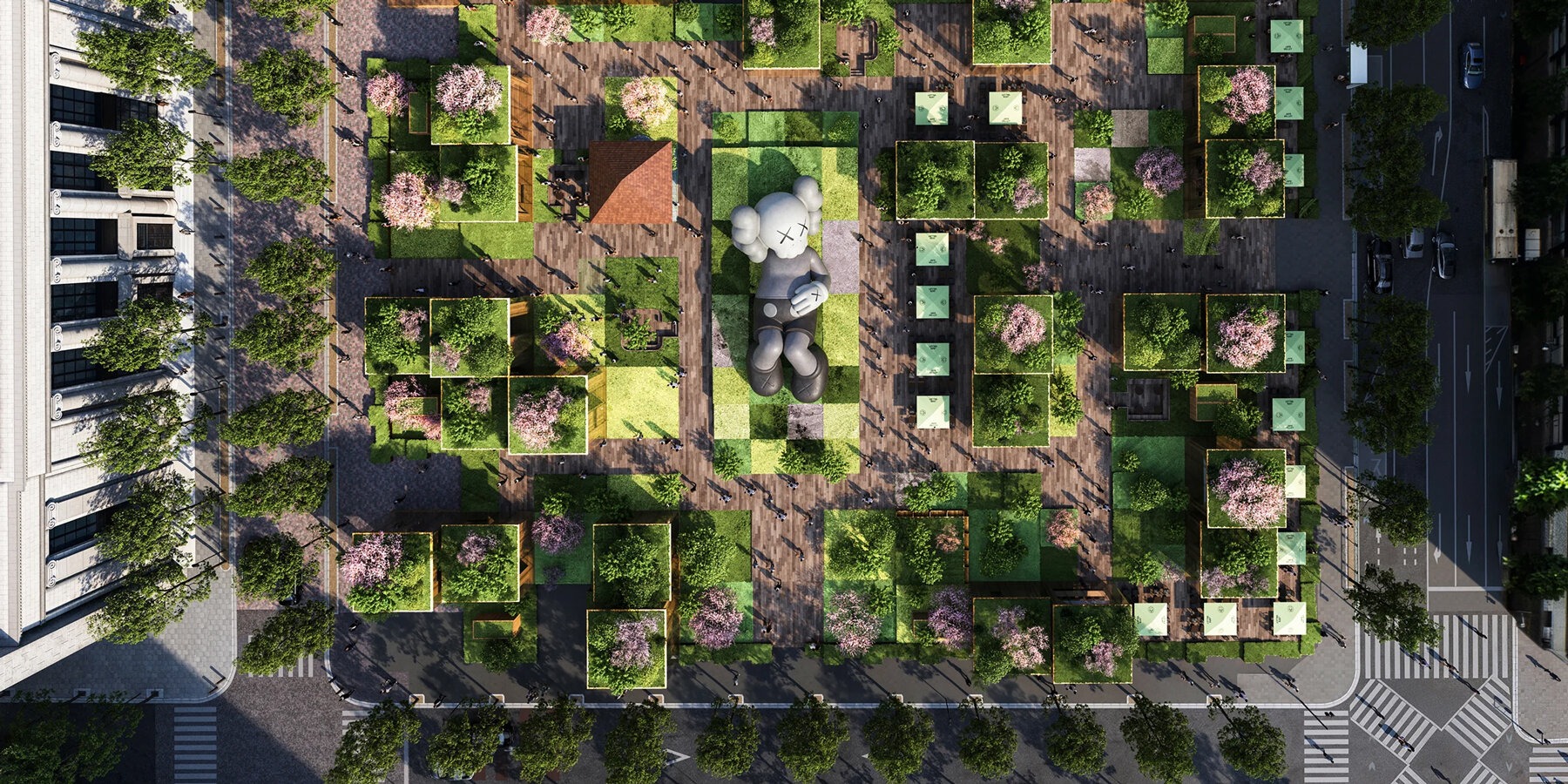 주목할 점은 이들이 단순히 유명인의 이름을 빌린 상업 프로젝트가 아닌, 문화적 깊이와 사려 깊은 디자인을 추구한다는 점이다. 이미지에서 확인할 수 있듯 목재 아치 구조의 파빌리온 시스템이 KAWS의 흰색 조각품을 둘러싸며 친밀한 규모의 공간감을 조성한다. 격자형으로 배치된 녹지와 벚꽃이 도심 속 자연적 맥락을 제공하는 동시에, 야간에는 따뜻한 조명이 브랜드 아이덴티티를 강화한다.