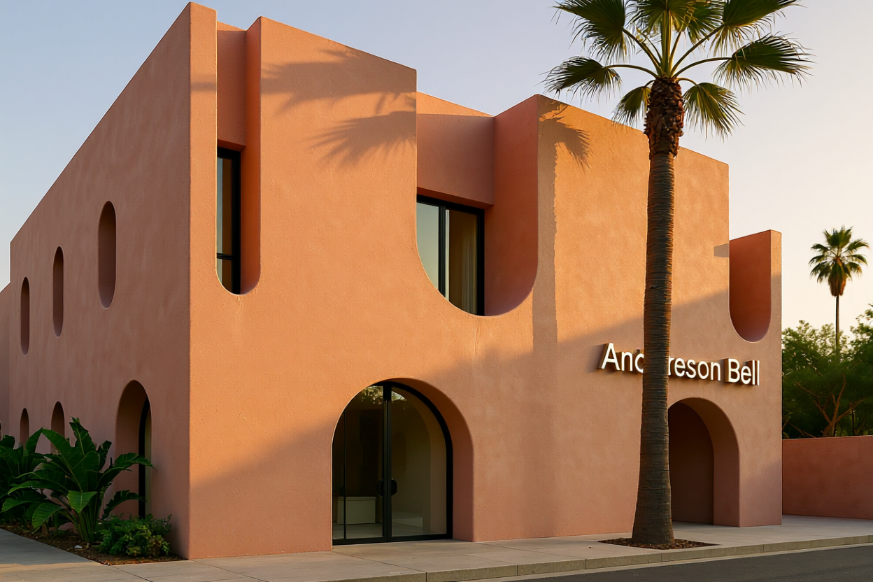 Generate a hyper-realistic architectural photograph of a two-story minimalist pink stucco building at golden hour. Use a 28 mm lens at eye level to capture the mass-and-void interplay with U-shaped openings. Integrate neon “Andersson Bell” signage flush with the facade, soft side lighting casting long shadows, deep focus, and a silhouetted palm tree in the foreground.
