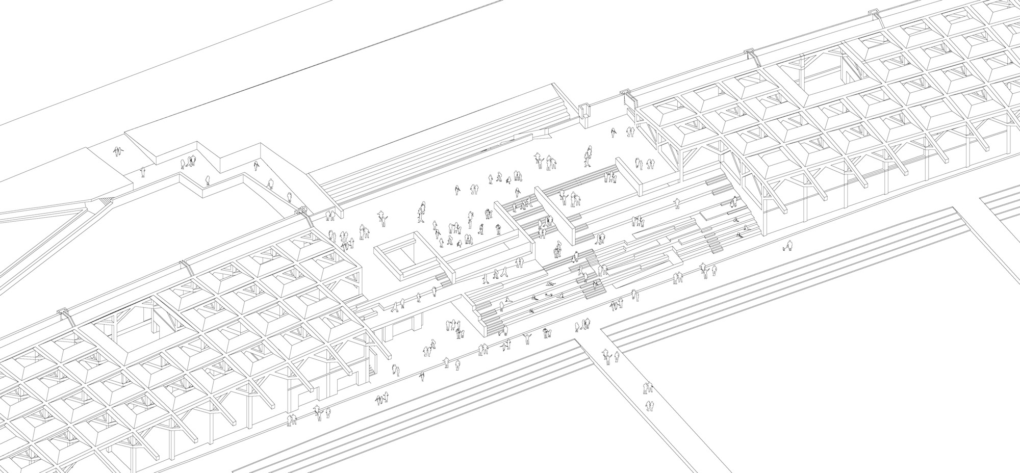 The wide steps, platforms, tree pools, ramps, stairs, courtyards, etc. in the cavity constitute the rich spatial hierarchy of the building. At the same time, the greenery around the dock buildings and on the roof trusses is waiting to flourish, or to completely accommodate and conceal the building in green trees and light, while the public space system constructed by its spatial structure on the site will become the most important symbol of this building.
