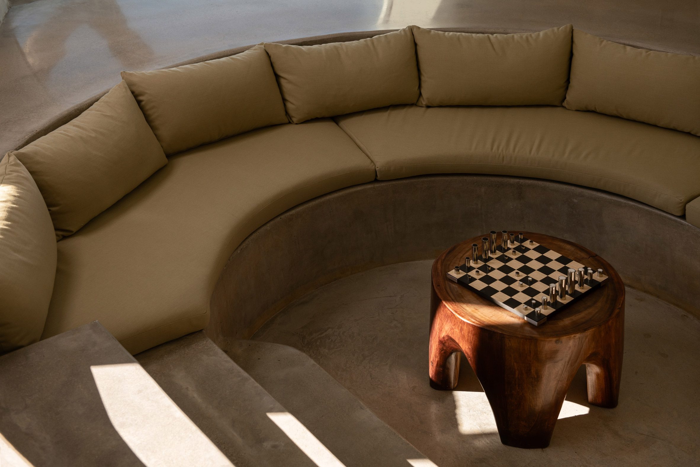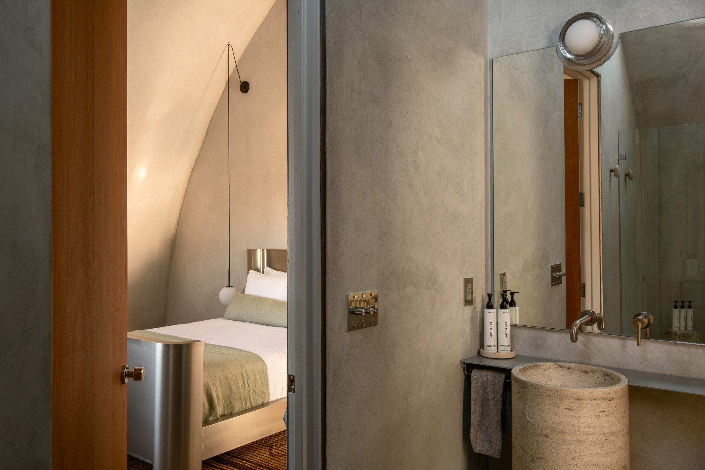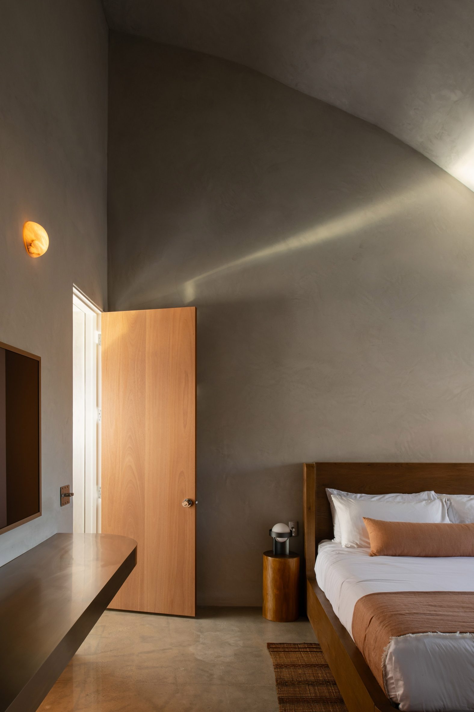 "재료들은 날것의 질감, 영구성, 그리고 원초적 감각을 위해 선택되었습니다"라고 두딕은 말한다. "콘크리트는 구조이자 마감재 역할을 합니다. 노출되고, 표현적이며, 정직하죠. 따뜻한 마호가니 목재, 손으로 미장한 치장벽토 벽면, 그리고 토착 석재가 이 공간을 사막의 정취에 더욱 깊이 뿌리내리게 합니다."
