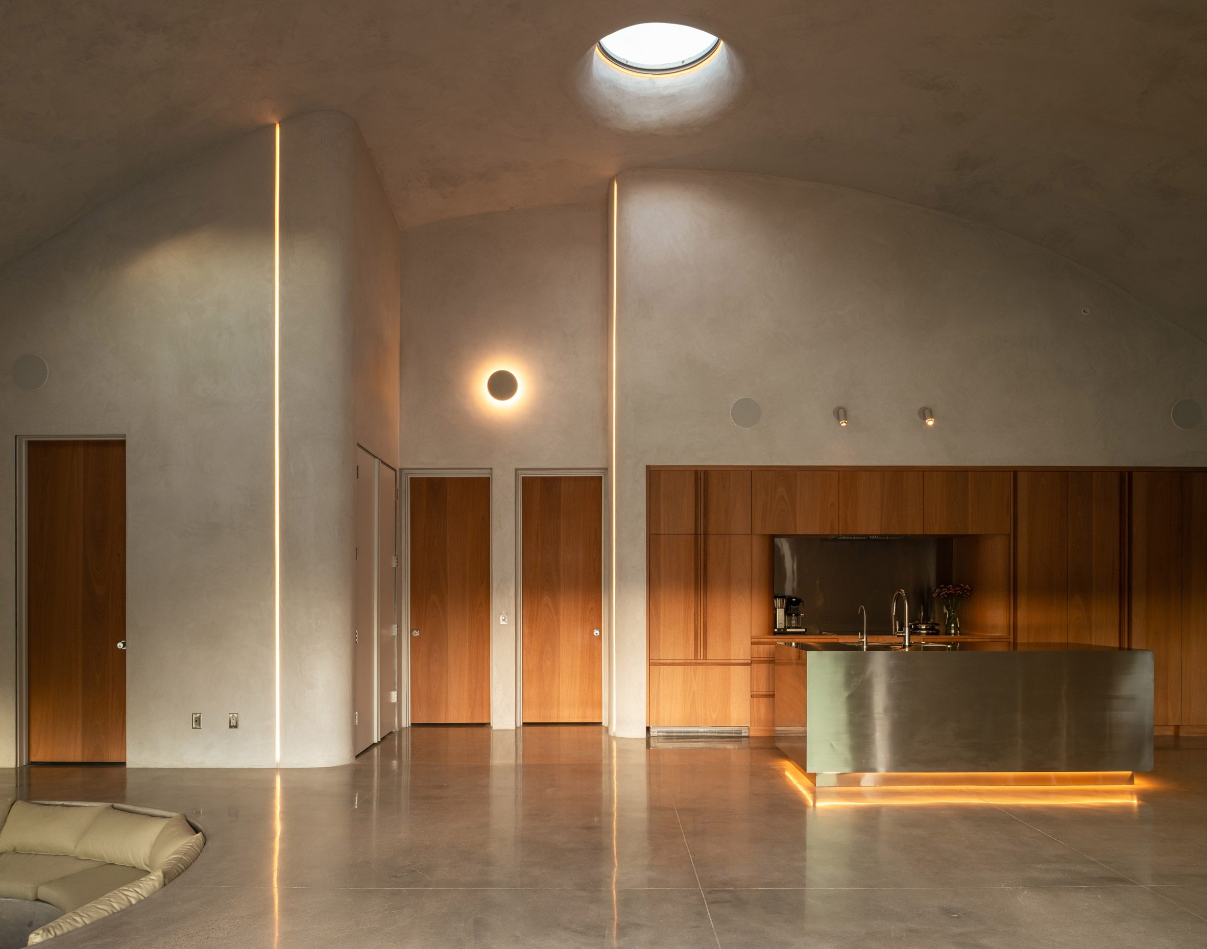 외부는 깔끔한 흰색으로 마감되었지만, 내부는 보다 자연스럽고 거친 질감의 미장을 사용해 동굴 같은 아늑함을 연출했다. 여기에 따뜻한 마호가니 목재와 스테인리스 스틸 선반, 주방 아일랜드가 더해져 현대적 감각을 완성한다.