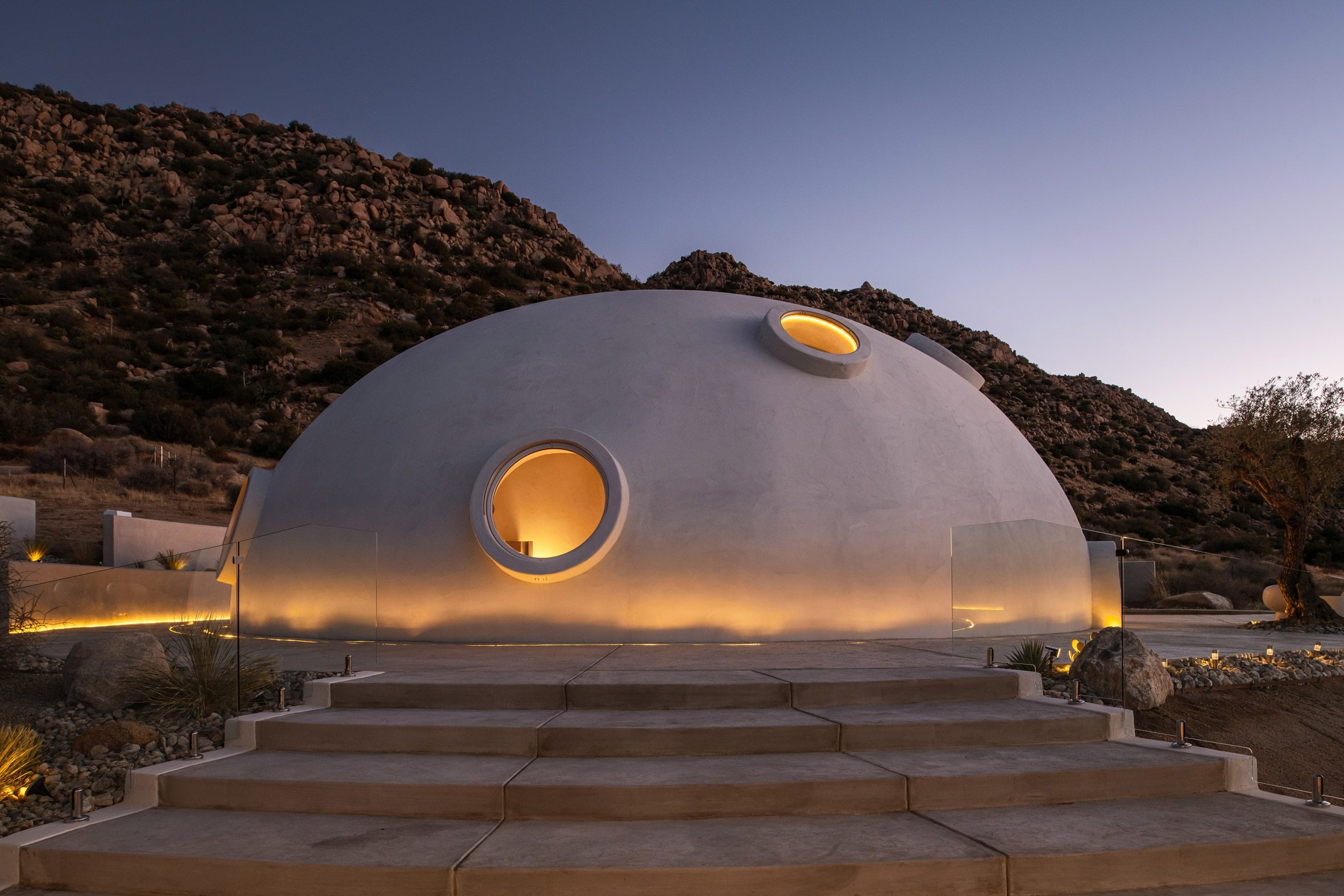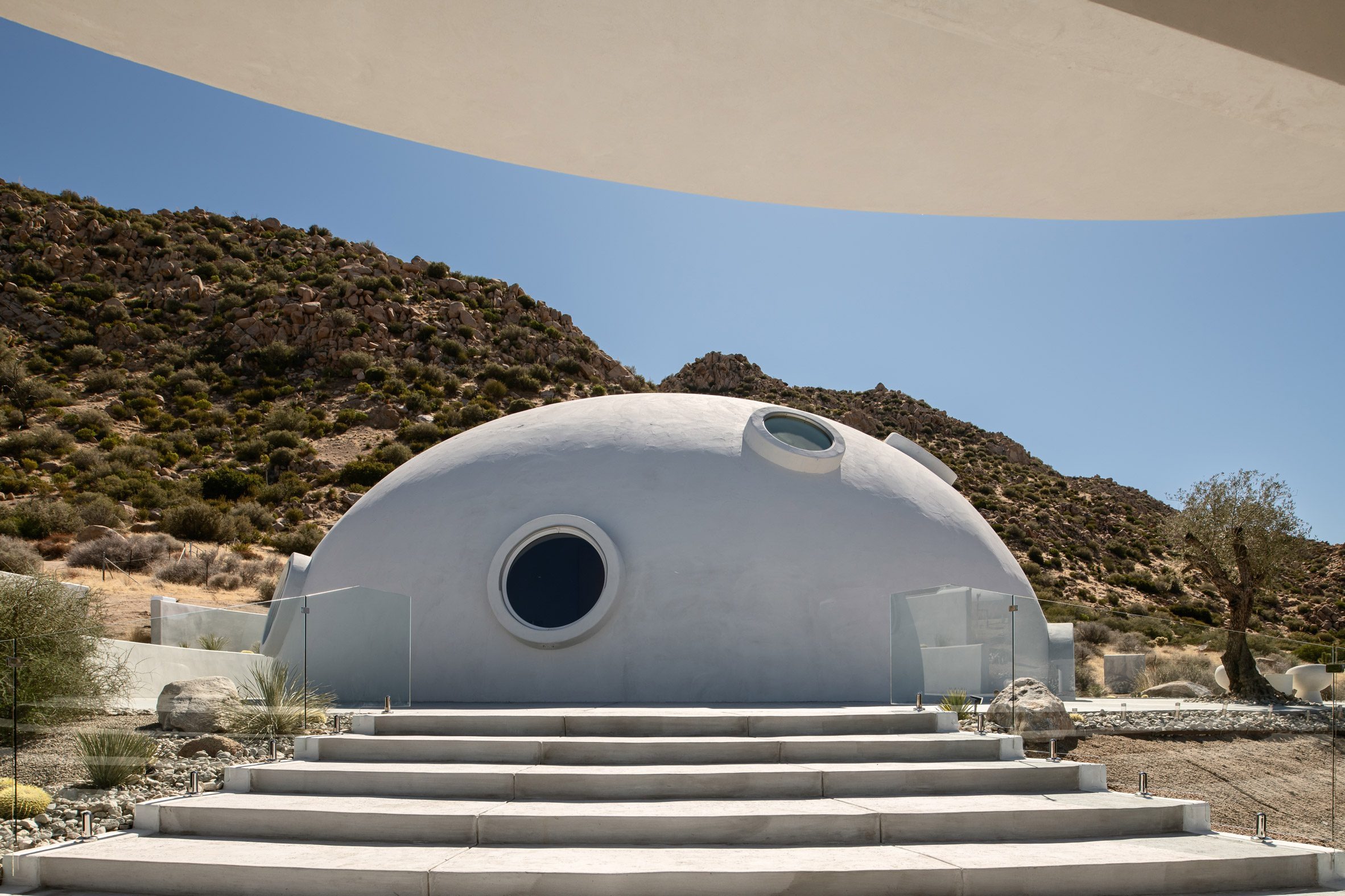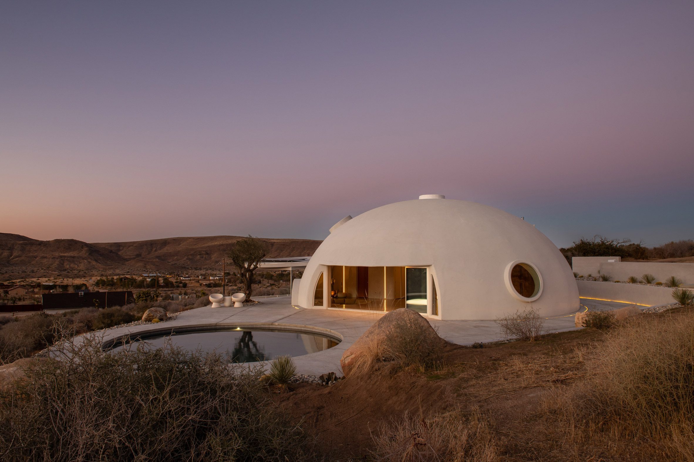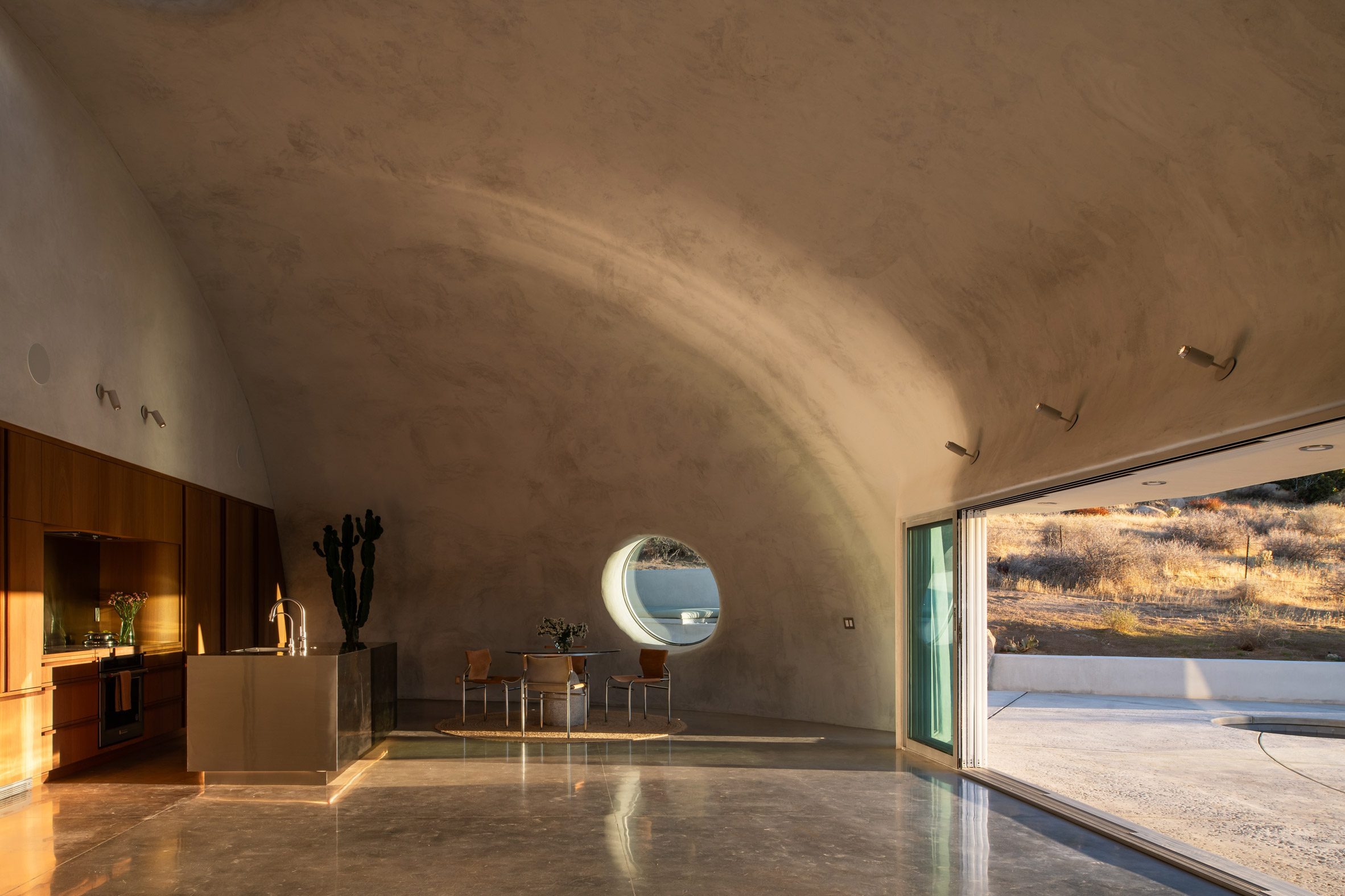 A white concrete dome punctured by porthole like windows shelters this holiday home in California, designed by Ukrainian designer and builder Anastasiya Dudik.
