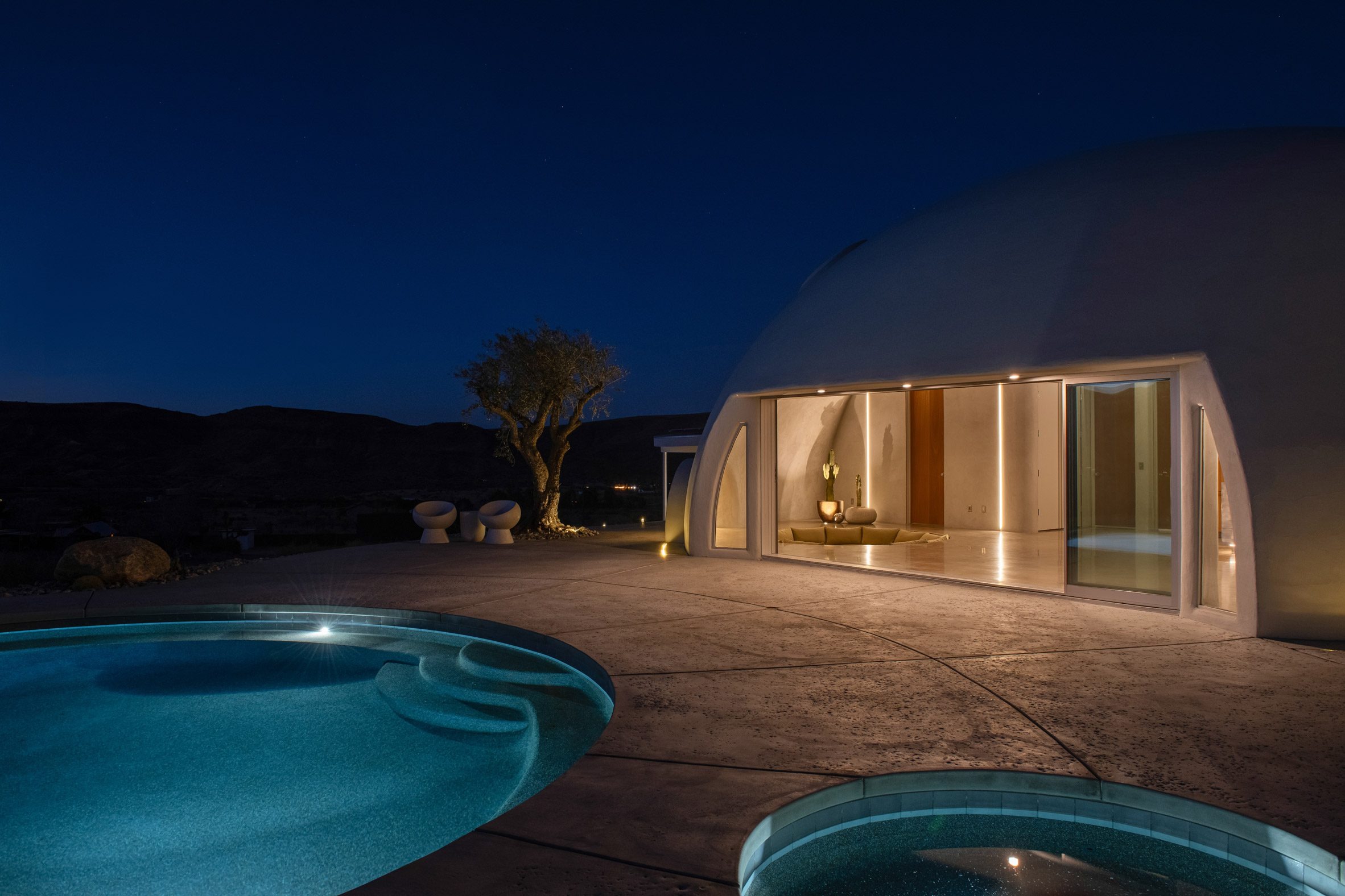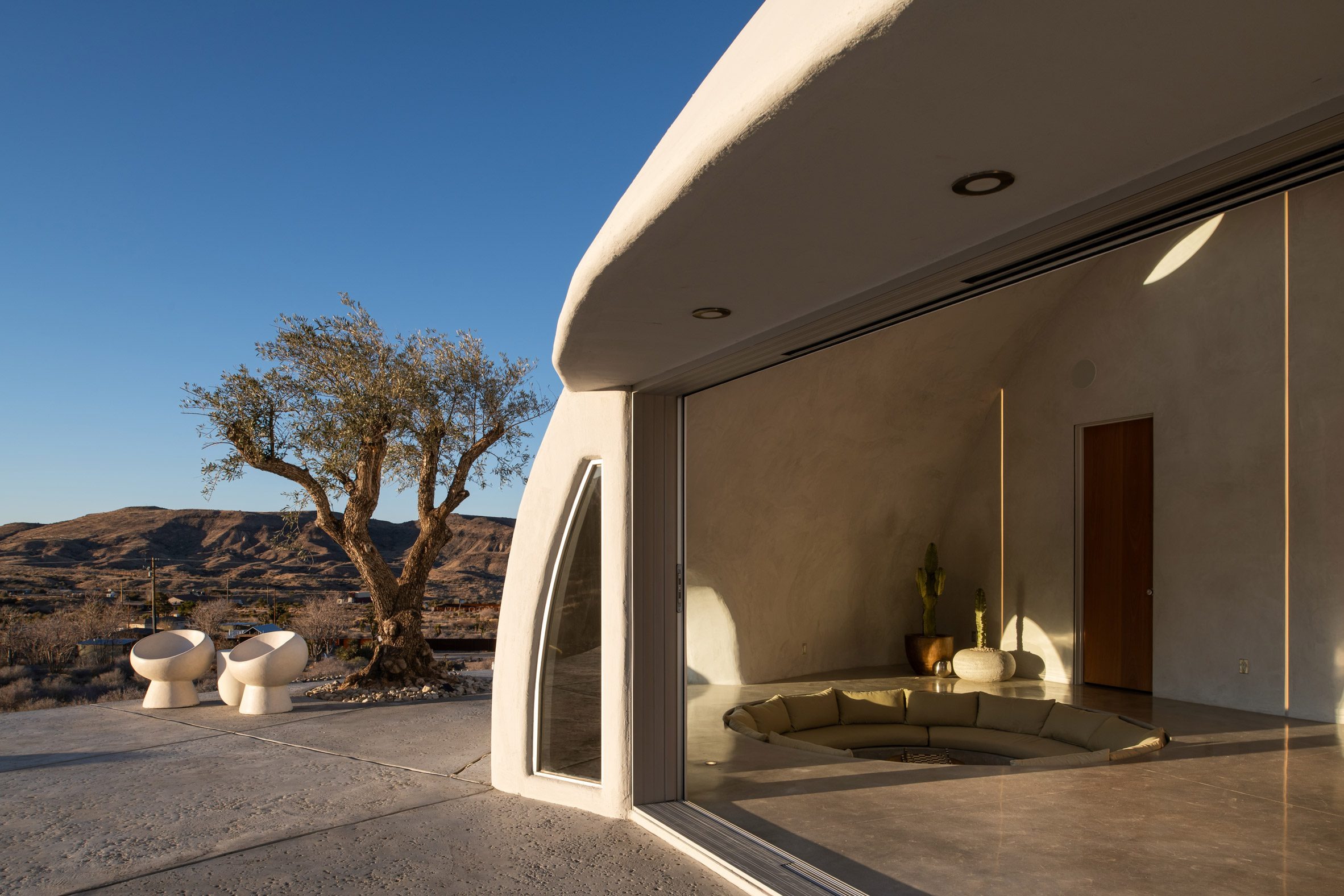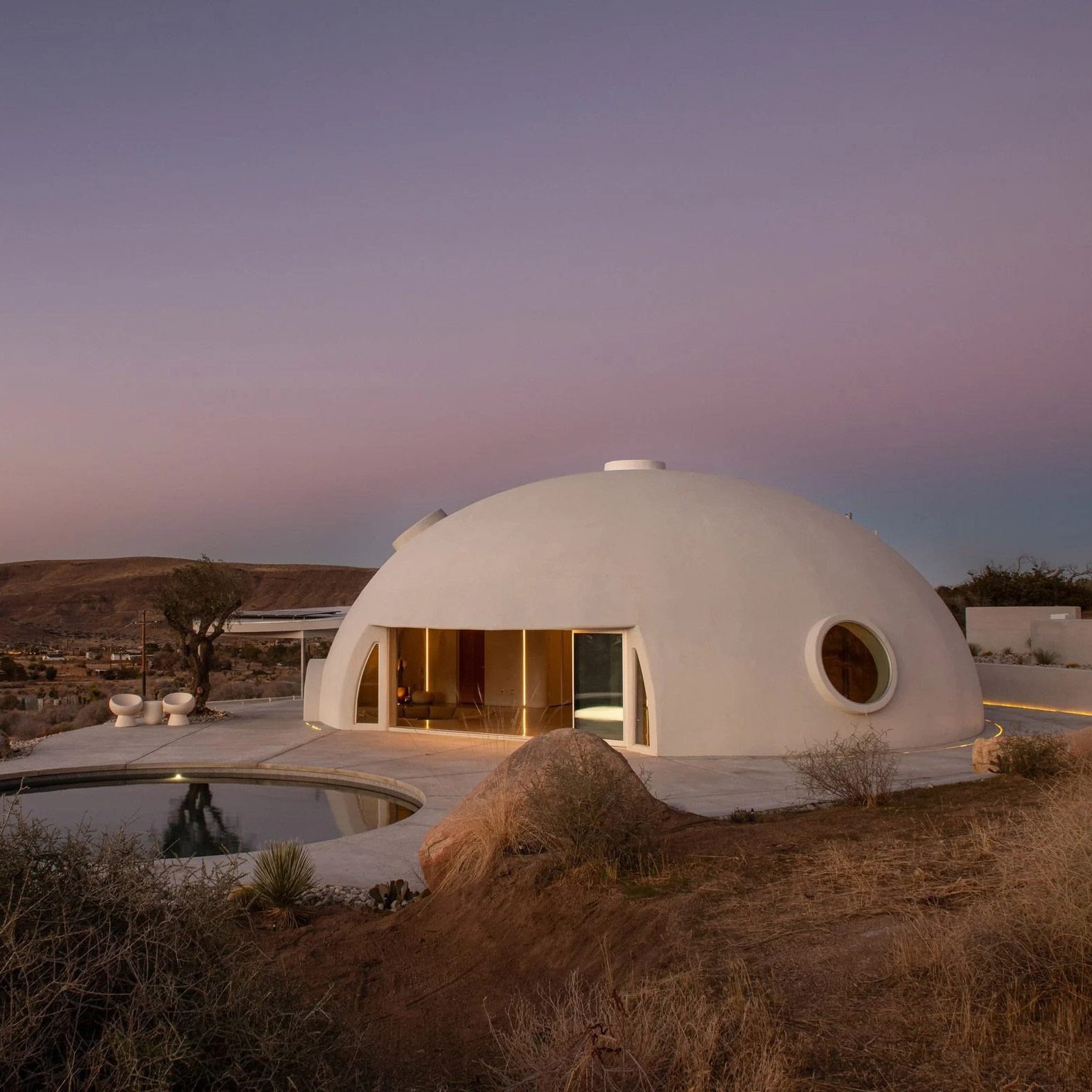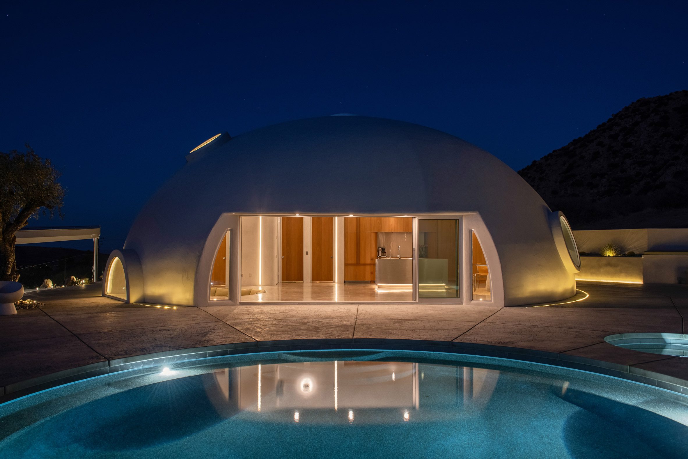A white concrete dome punctured by porthole like windows shelters this holiday home in California, designed by Ukrainian designer and builder Anastasiya Dudik.