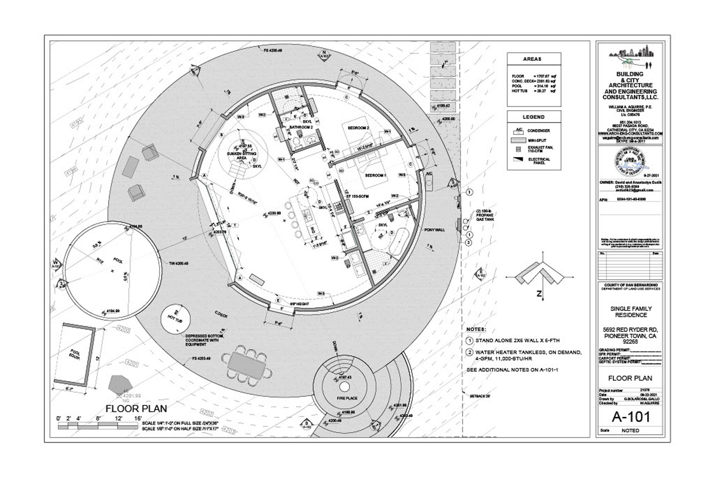 내부는 원형 평면을 두 구역으로 나누어 구성했다. 한쪽에는 거실, 다이닝, 주방이 하나의 열린 공간을 이루고, 다른 쪽에는 각각 전용 화장실을 갖춘 두 개의 침실이 배치되었다. 거실에서 접이식 유리문을 열면 원형 수영장과 화로, 휴식 공간이 있는 테라스로 연결되며, 이곳에서 다시 지붕이 있는 주차장과 현관으로 이어지는 동선이 완성된다.