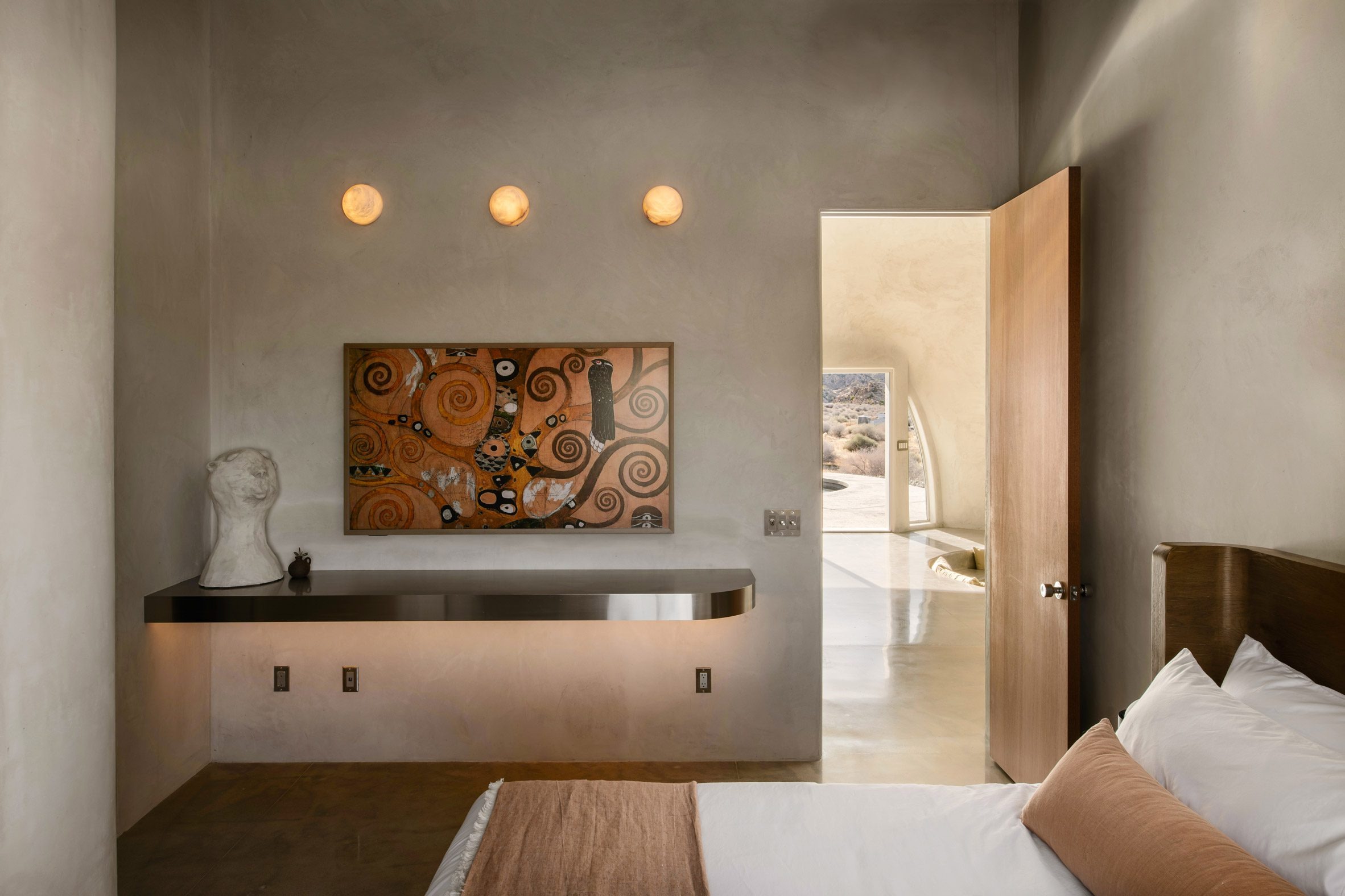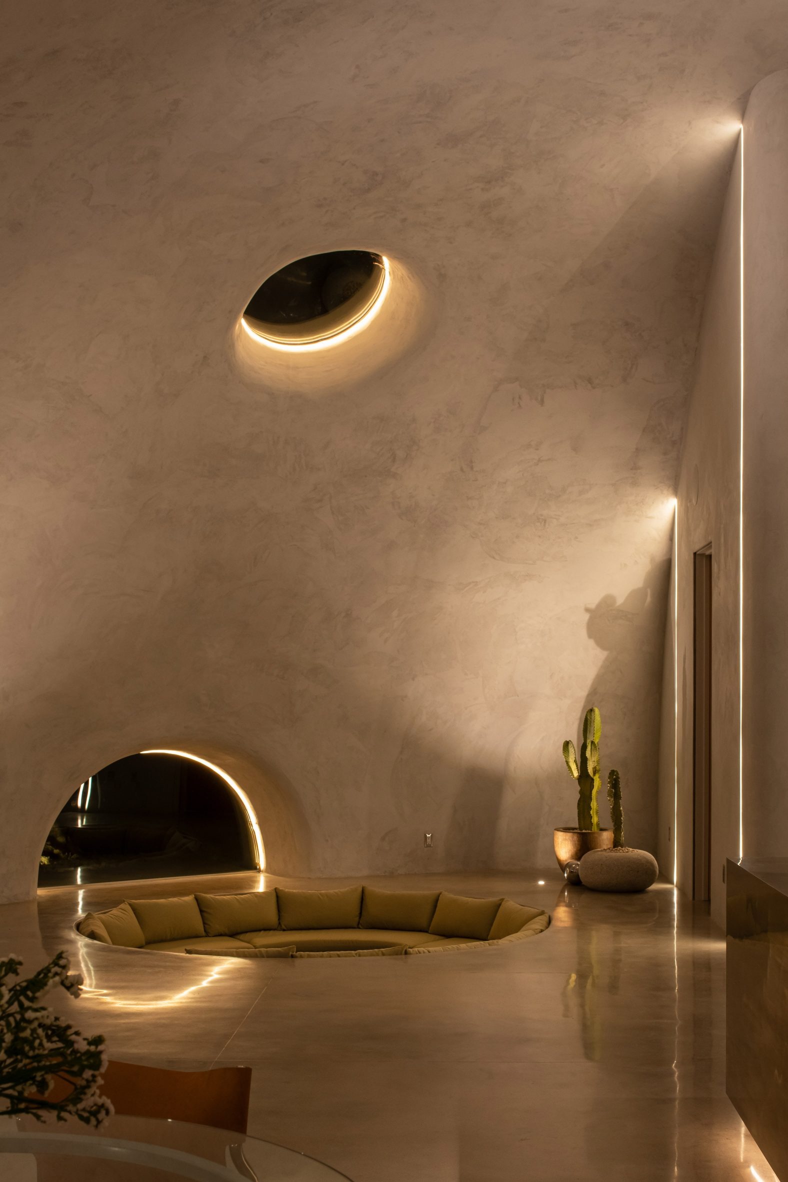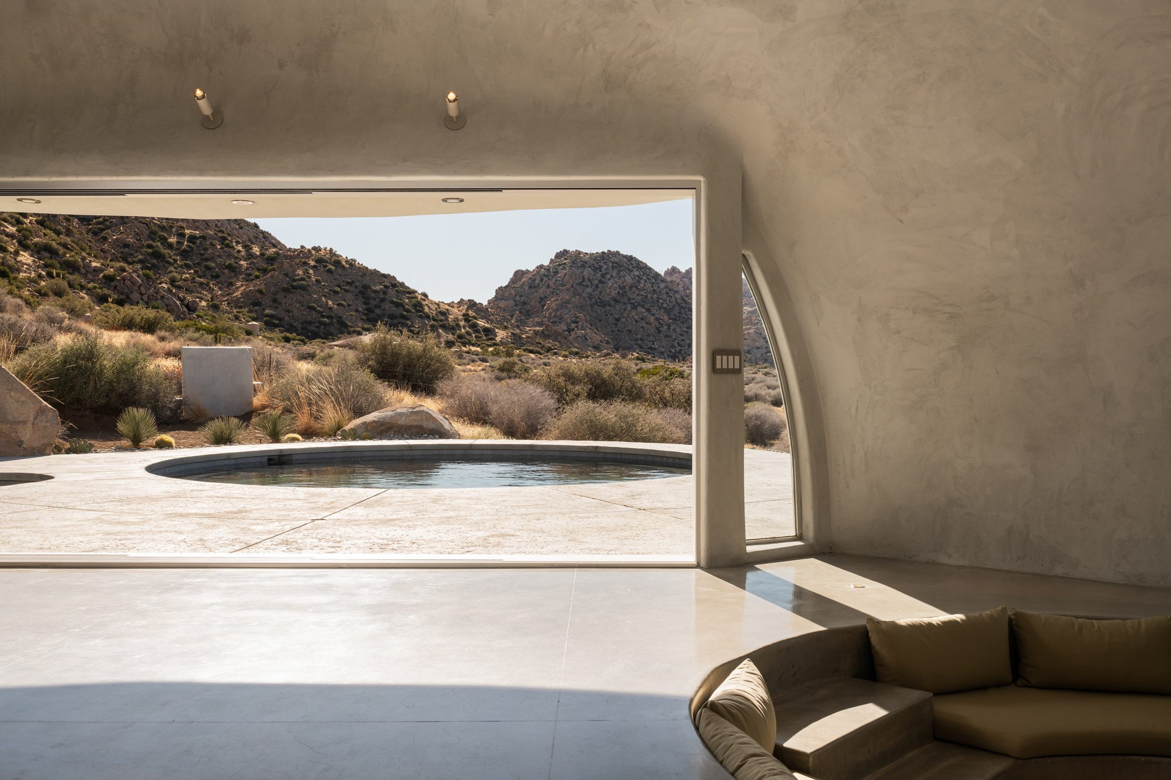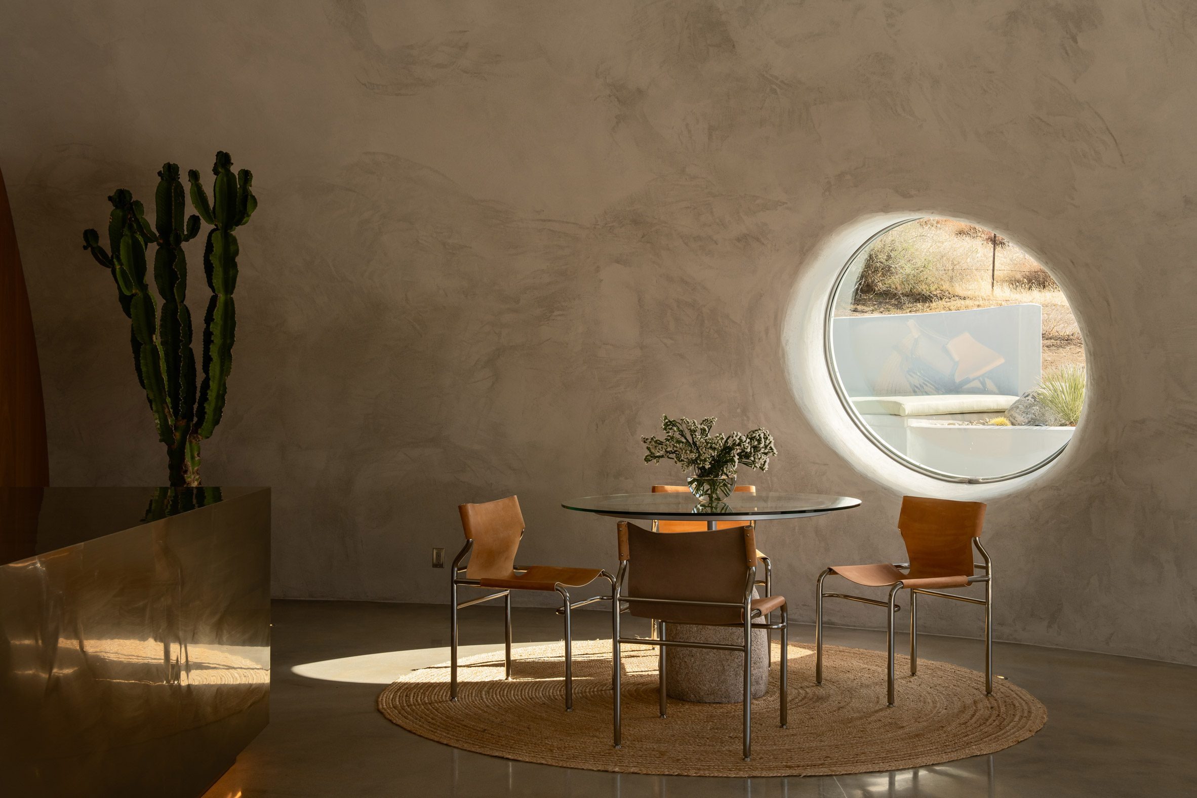 실내에서 가장 인상적인 공간은 움푹 파인 원형 대화 공간, 즉 '선큰 라운지'다. 이곳 주변으로도 작은 원형 창과 아치형 창들이 배치되어 있어, 화장실 위쪽이나 식탁과 침실 옆에서도 바깥 풍경을 감상할 수 있다. 마치 동굴 속에서 바라보는 하늘처럼, 각 창문은 저마다 다른 프레임으로 사막의 풍경을 담아낸다.