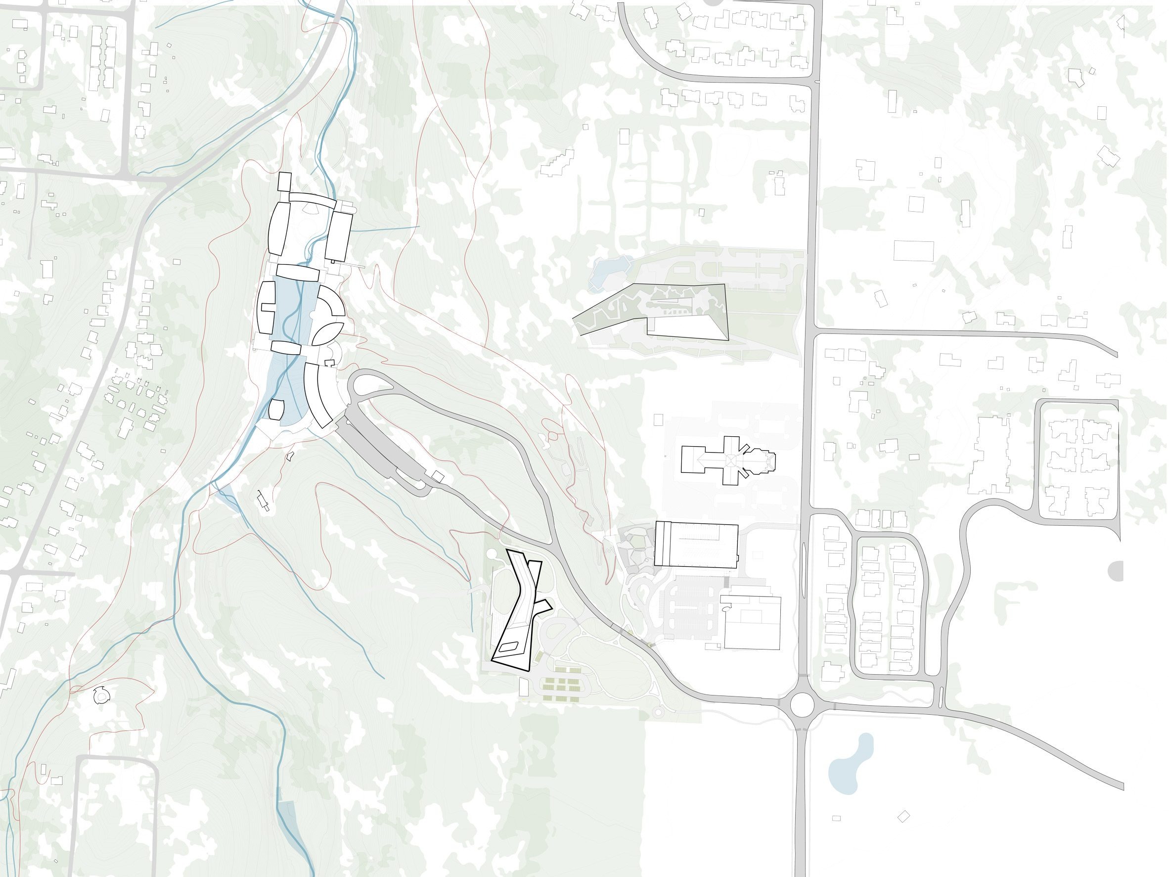 Encompassing 85,000 square feet (7,897 square metres), the building was designed to draw upon its context and integrate with the landscape. Irregular in plan, it has a slender, curvilinear form with forms branching off, seen in a street-facing volume at ground level.