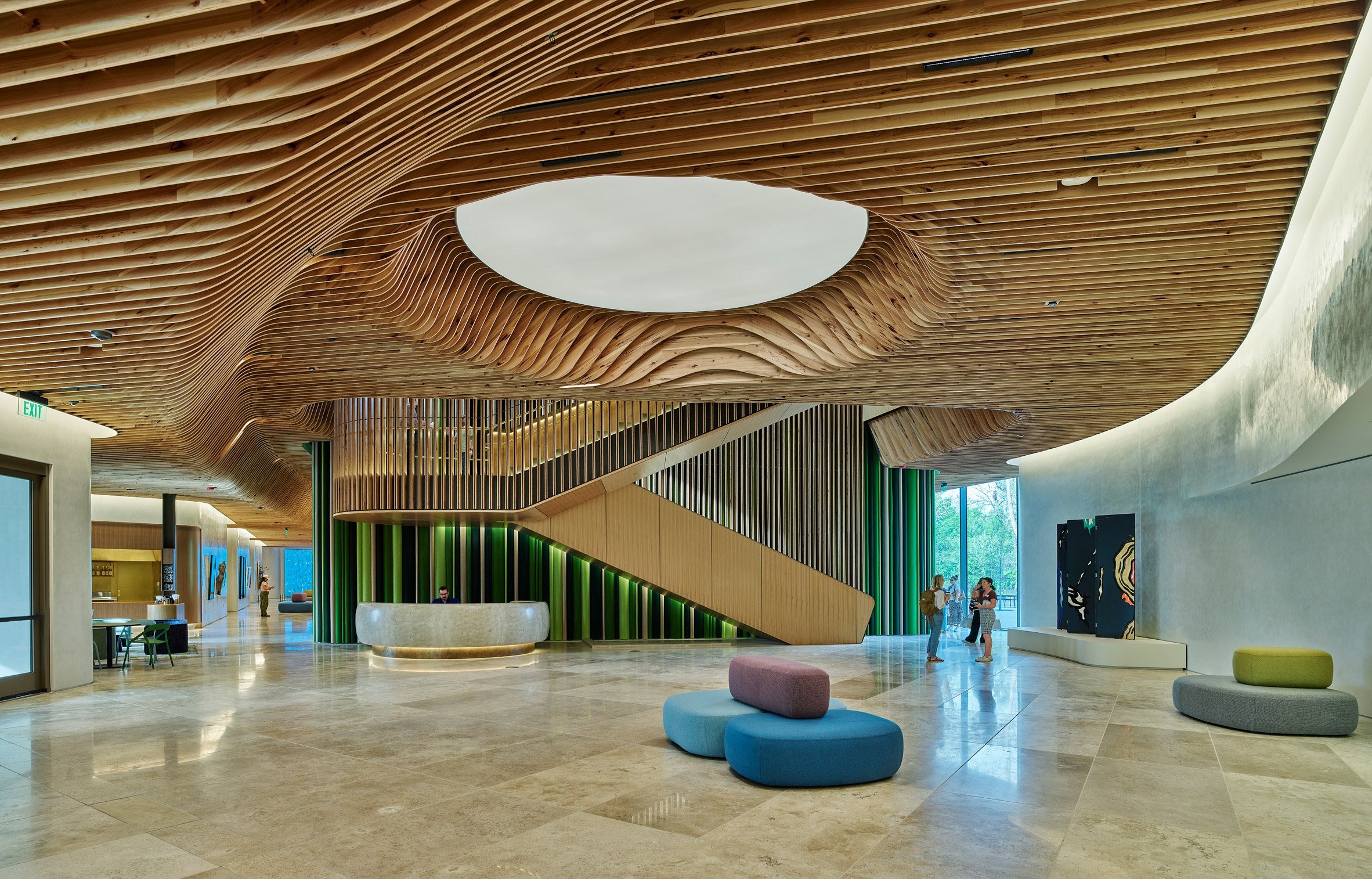 곡면으로 처리된 천장은 마치 숲의 나뭇가지들이 만드는 그늘과 같은 느낌을 준다. 풍부한 자연채광이 쏟아지는 창들과 수많은 테라스, 외부 공간들을 통해 자연과의 연결감이 지속적으로 만들어진다. 건축가들의 표현처럼, 건물의 개방성과 자연 환경에 대한 직접적 접근이 통합 건강 원칙을 적극적으로 탐구할 수 있는 포용적 환경을 제공한다.