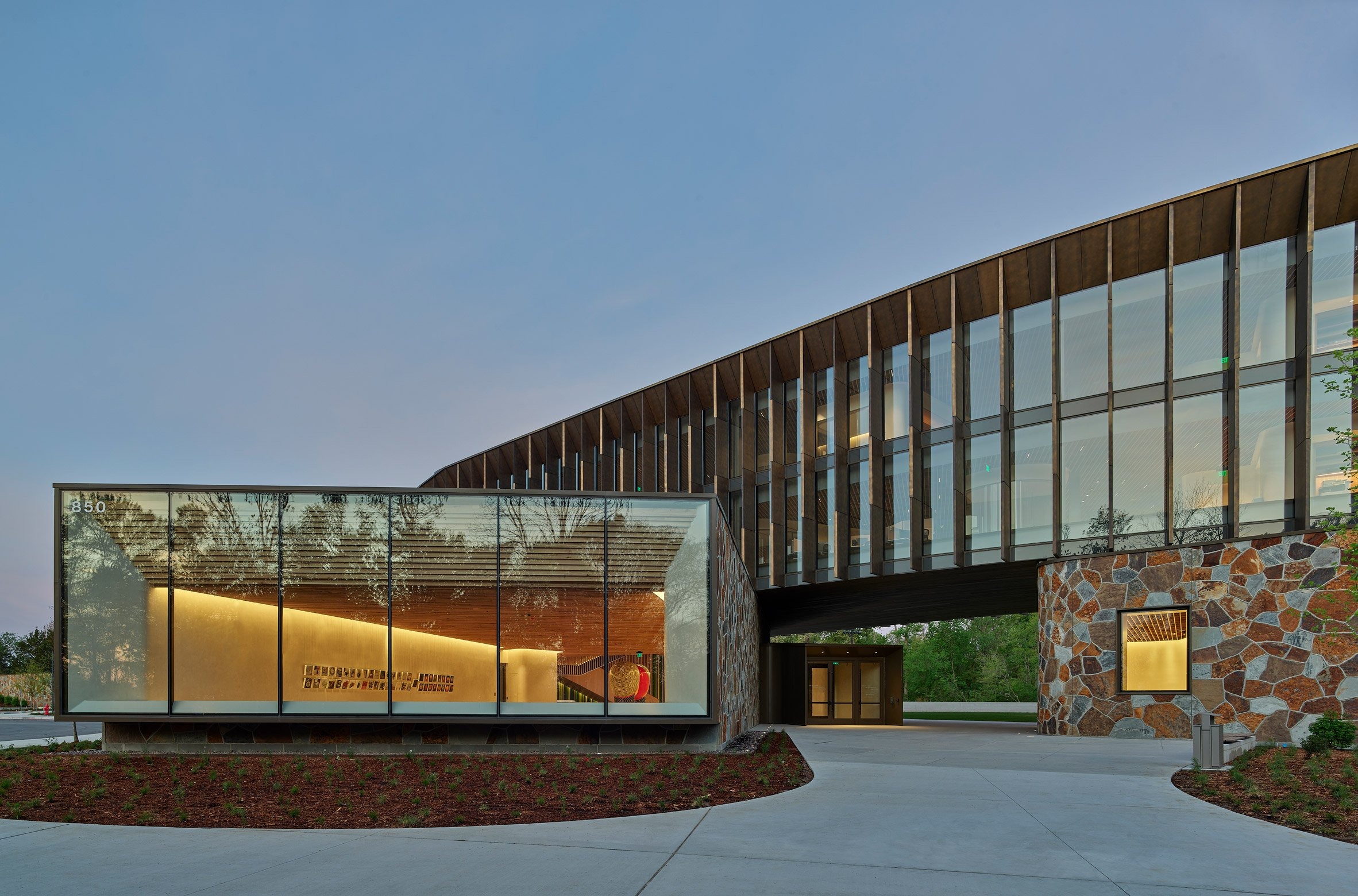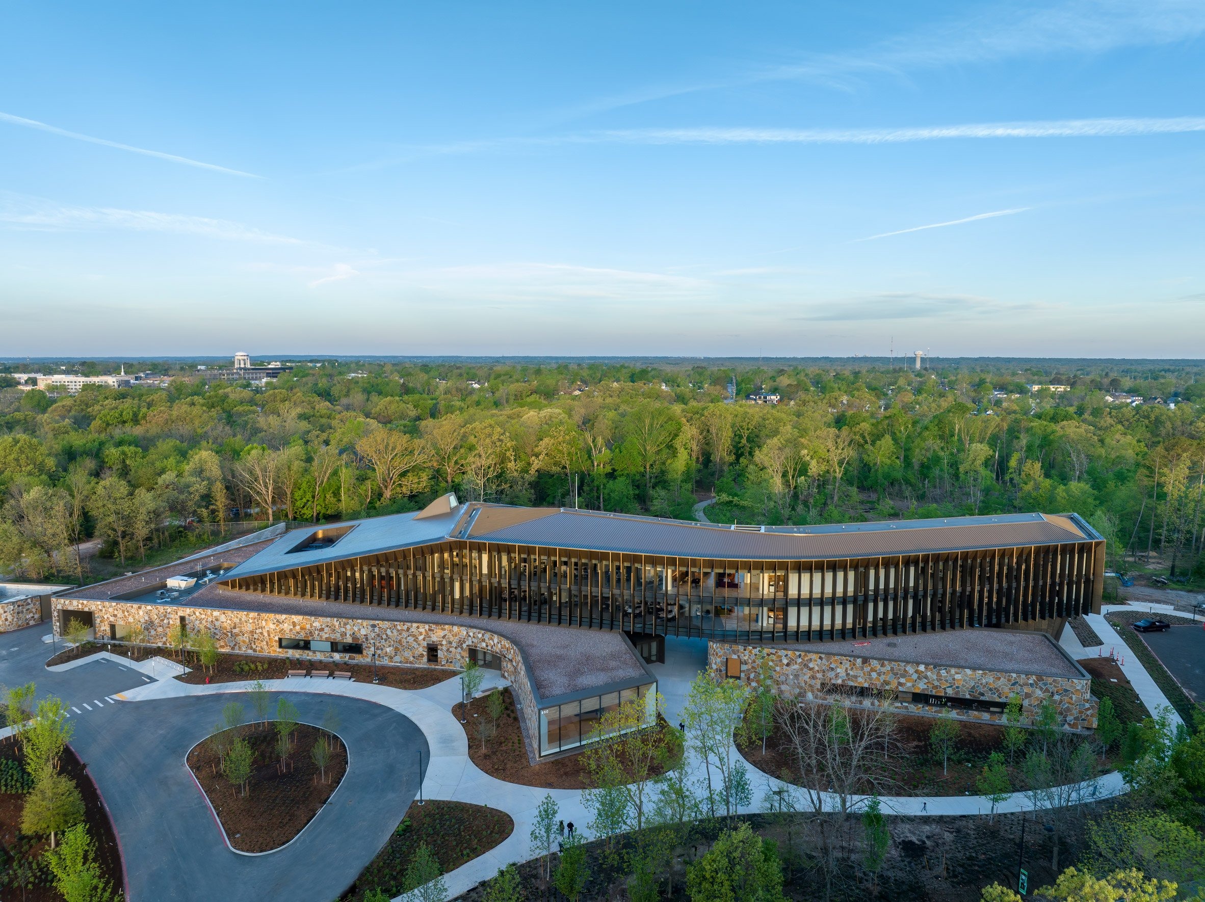 Arkansas studio Marlon Blackwell Architects has completed the headquarters building for the Heartland Whole Health Institute, which features a curved form and facades covered in stonework resembling a giraffe's hide.