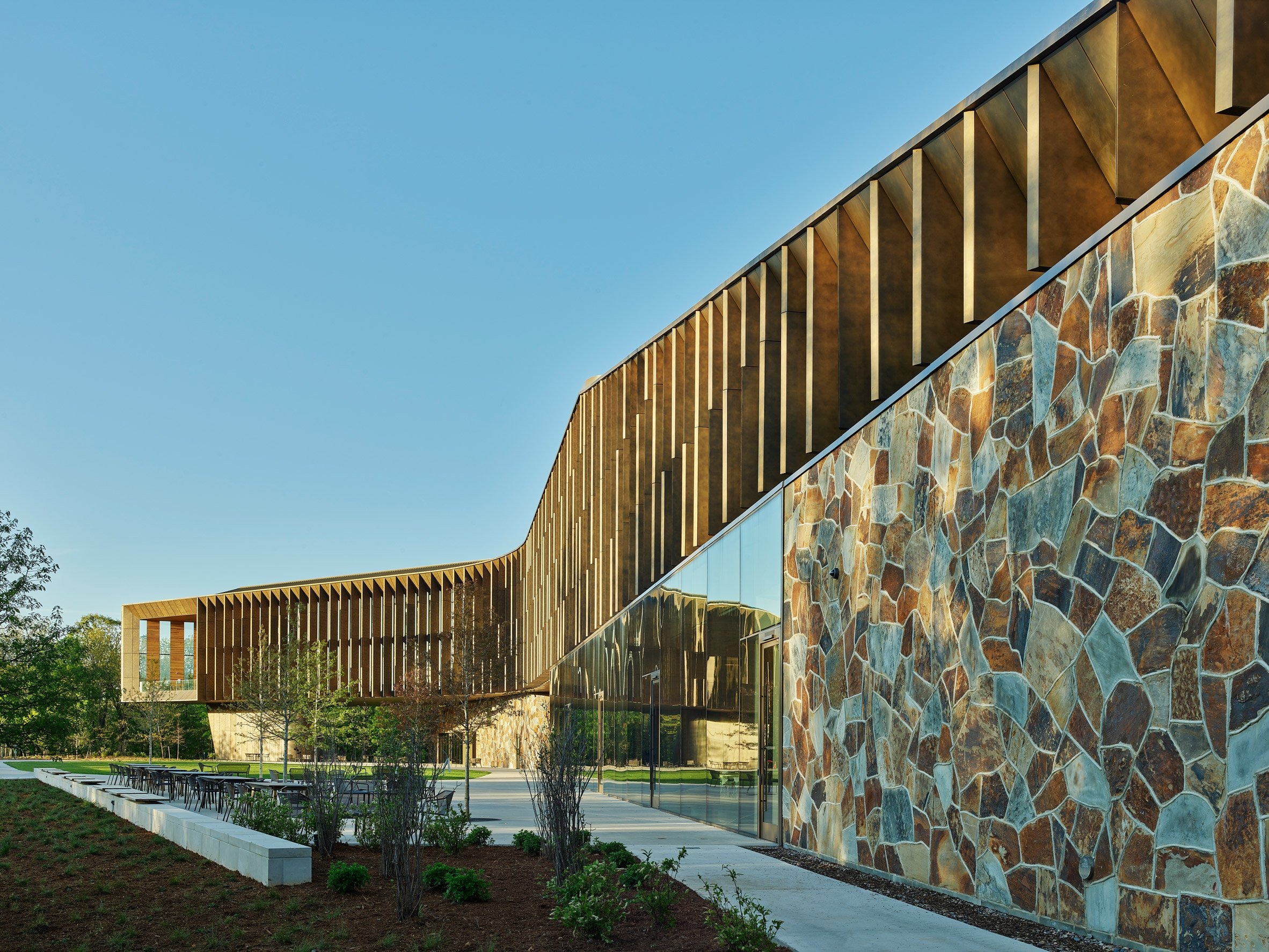 땅의 기억이 만든 치유의 건축 Marlon Blackwell Architects clads Arkansas building in giraffe stone for "sense of place"