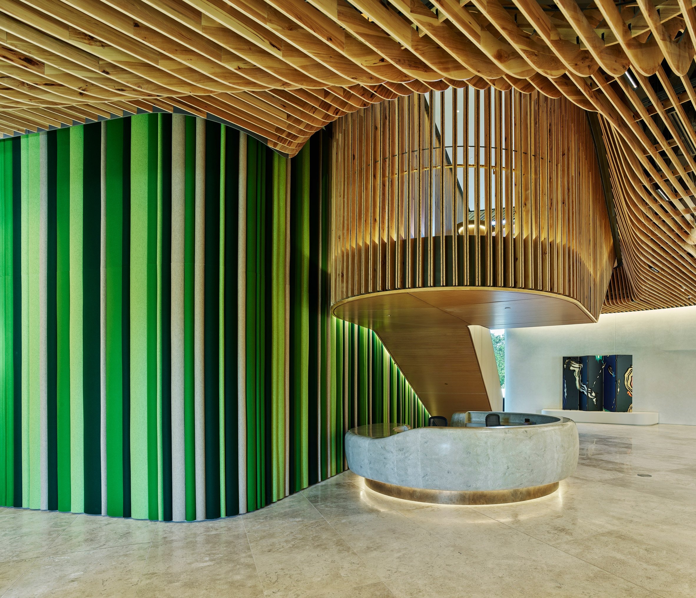 기린 무늬 석재와 황동 핀의 조화, 도그트롯이라는 전통 통로의 현대적 해석, 그리고 숲과 하나가 되려는 곡선적 형태는 모두 이곳이 단순한 사무 공간이 아닌 치유하는 장소임을 말해준다.