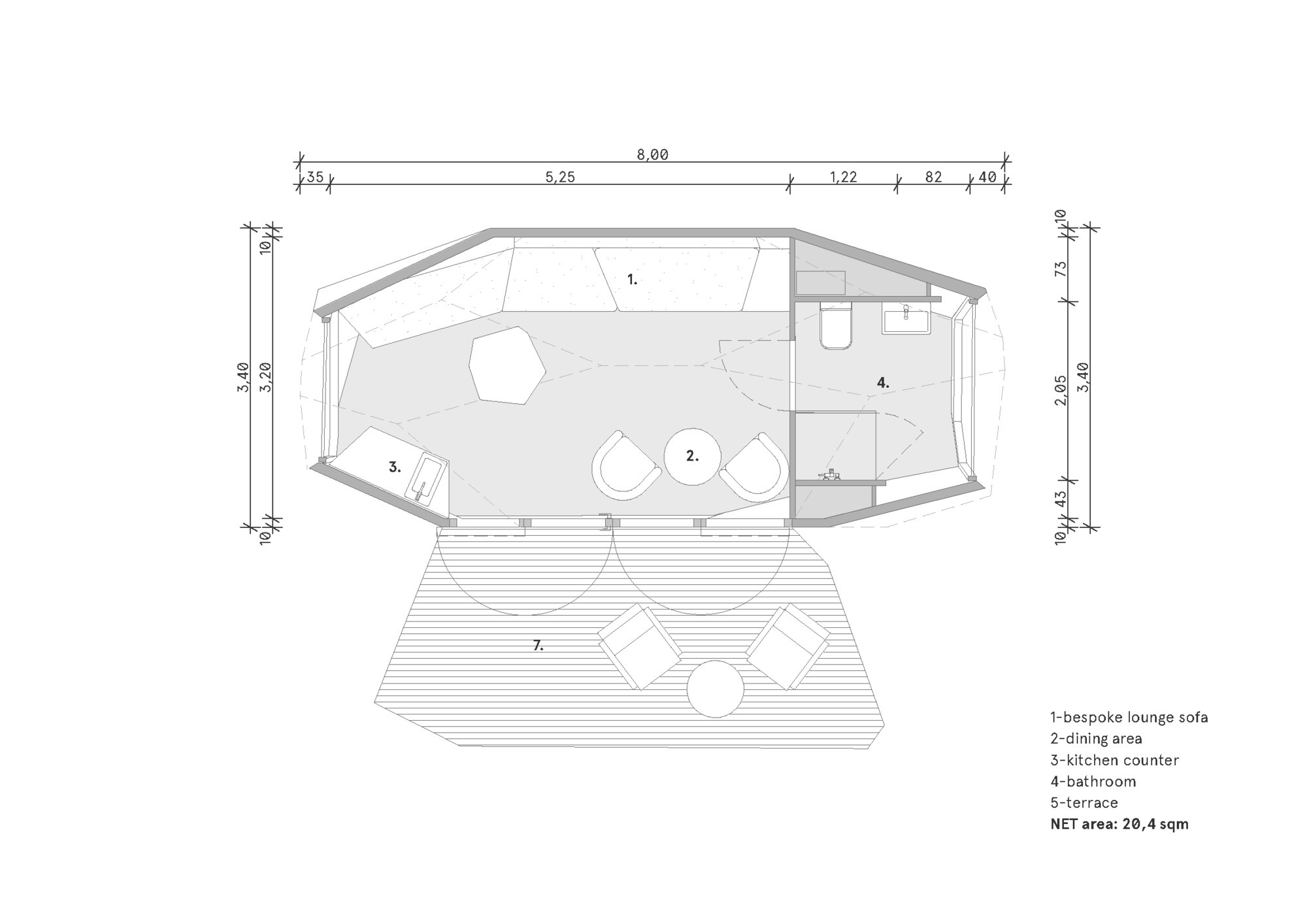 독창적으로 설계된 캐빈은 조립식 건축의 잠재력을 완전히 새롭게 상상한다. 그 외관은 유기적이면서도 미래적이다. 프리미엄 수준의 편안함과 환경 의식을 결합하여 기술적 혁신과 자연에서 영감을 받은 형태를 조화시킨다. 우주 캡슐이나 지질학적 지층을 연상시키는 디자인은 전통적인 직각의 건축 규범에서 벗어난다. 그 결과, "다면체" 디자인 언어로 정의된 조약돌 모양의 캐빈은 자연 환경과 도시 환경, 예를 들어 이전에 사용되지 않던 옥상에도 매끄럽게 통합될 수 있다.