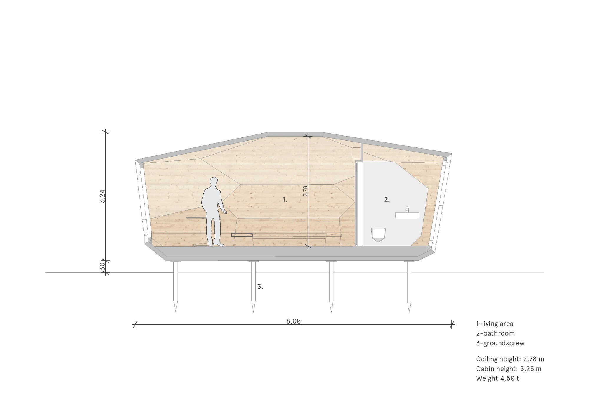 Customization meets efficiency The production and installation of the cabin are built on predictability and speed. The capsules can be fully prefabricated, assembled, and delivered turnkey-ready throughout Europe, while for more distant locations, they are shipped flat-packed in standard sea containers. On-site installation of the prefabricated cabin takes approximately one day. Thanks to the ground screw foundation system, no concrete base is required, minimizing environmental impact. This way, the necessary site preparation can be completed in just half a day. This process is especially advantageous in accommodation development projects, where delays are often a challenge.