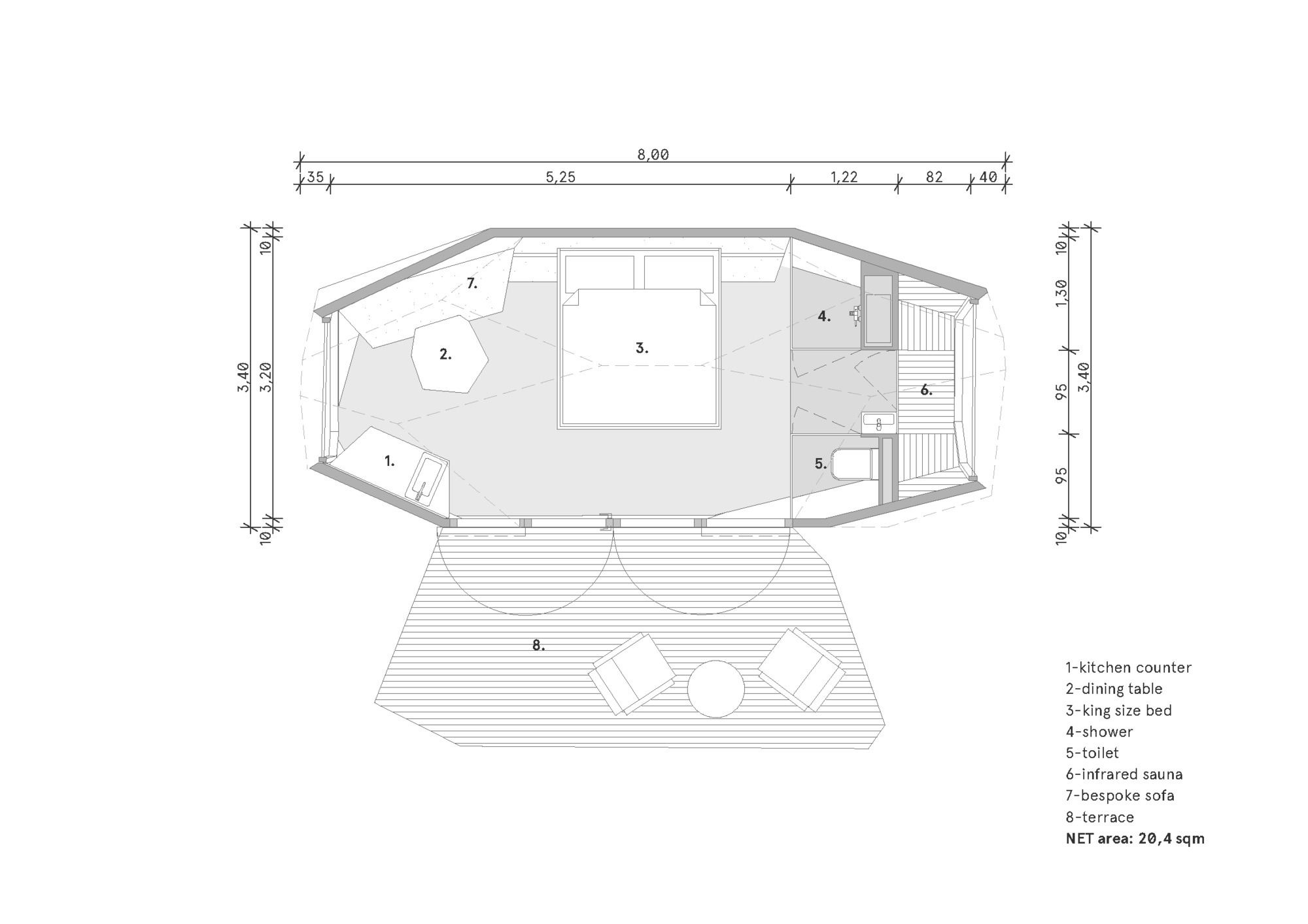 The cabins are fully customizable in functionality and materials, tailored to the specific needs of each client. Despite its compact size, it offers a complete user experience with the comfort and quality of a five-star, two-person hotel suite – including a king size bed, dining area, kitchen, bathroom, panoramic infrared sauna, and large glass surfaces. Moreover, the cabin can be expanded with additional PEBL units, making its spatial layout highly flexible. These uniquely shaped, sculptural land art objects can be rotated and relocated, showing different faces from every angle – much like irregularly shaped pebbles. Their potential uses are nearly endless: they can serve as a festival resting area, meditation studio, creative workspace, exclusive guest room, or even a private sauna.