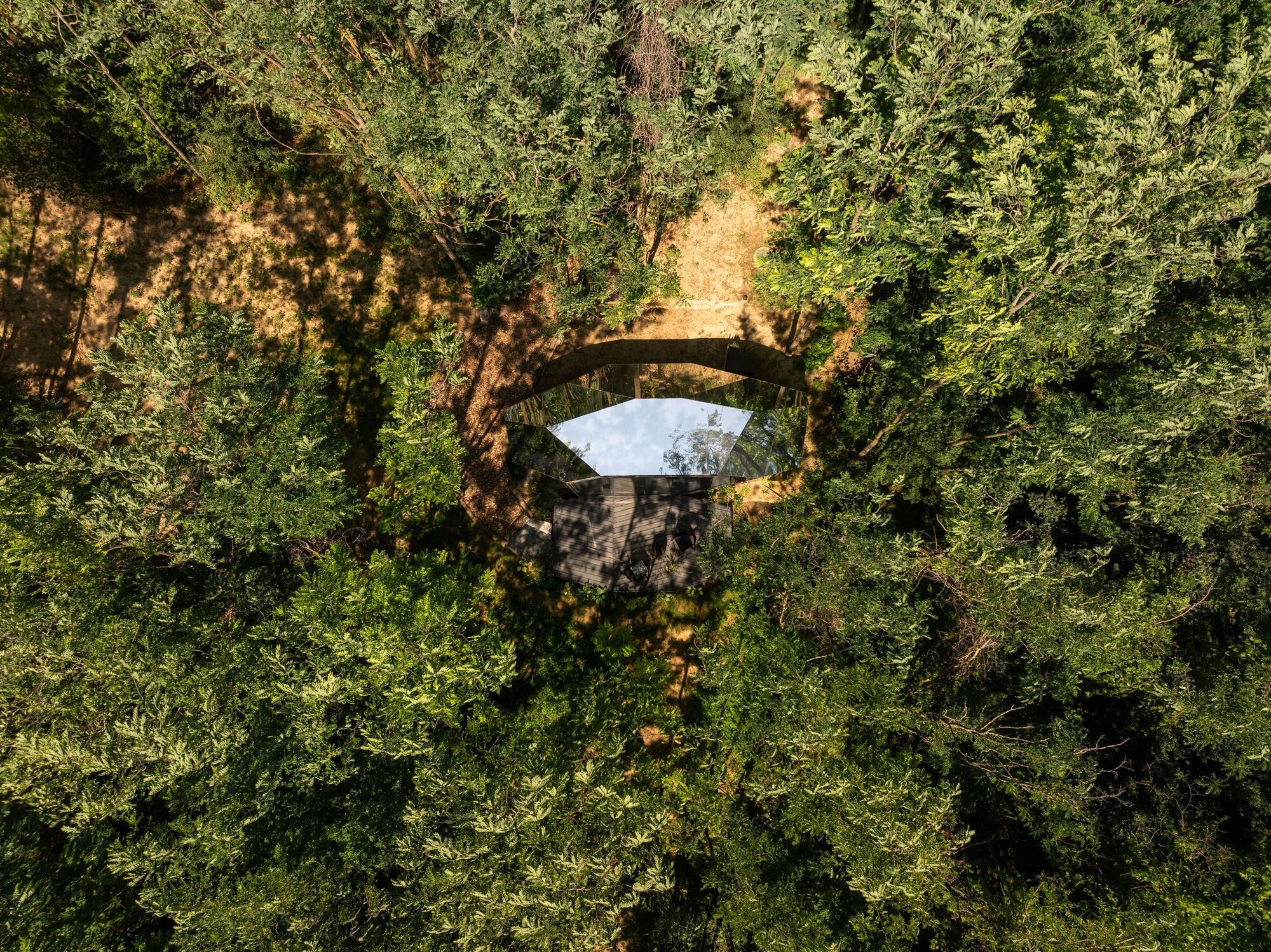 Behind the efficient and contemporary realization of this unique, sculptural structure is Hello Wood's own patented, proprietary construction system. This CNC-manufactured three-dimensional shell structure combines a solid wood CLT (Cross-Laminated Timber) load bearing core with insulating and waterproof layers. This innovation enables the creation of complex spatial forms and irregular geometries, while also reducing material waste and assembly time. The design is highly adaptable to various environments and client needs: depending on the material and texture of the maintenance-free exterior cladding – which may be wood, stone, aluminum, or even mirror – it can either blend into its surroundings, whether forested or industrial, or intentionally stand out from them.