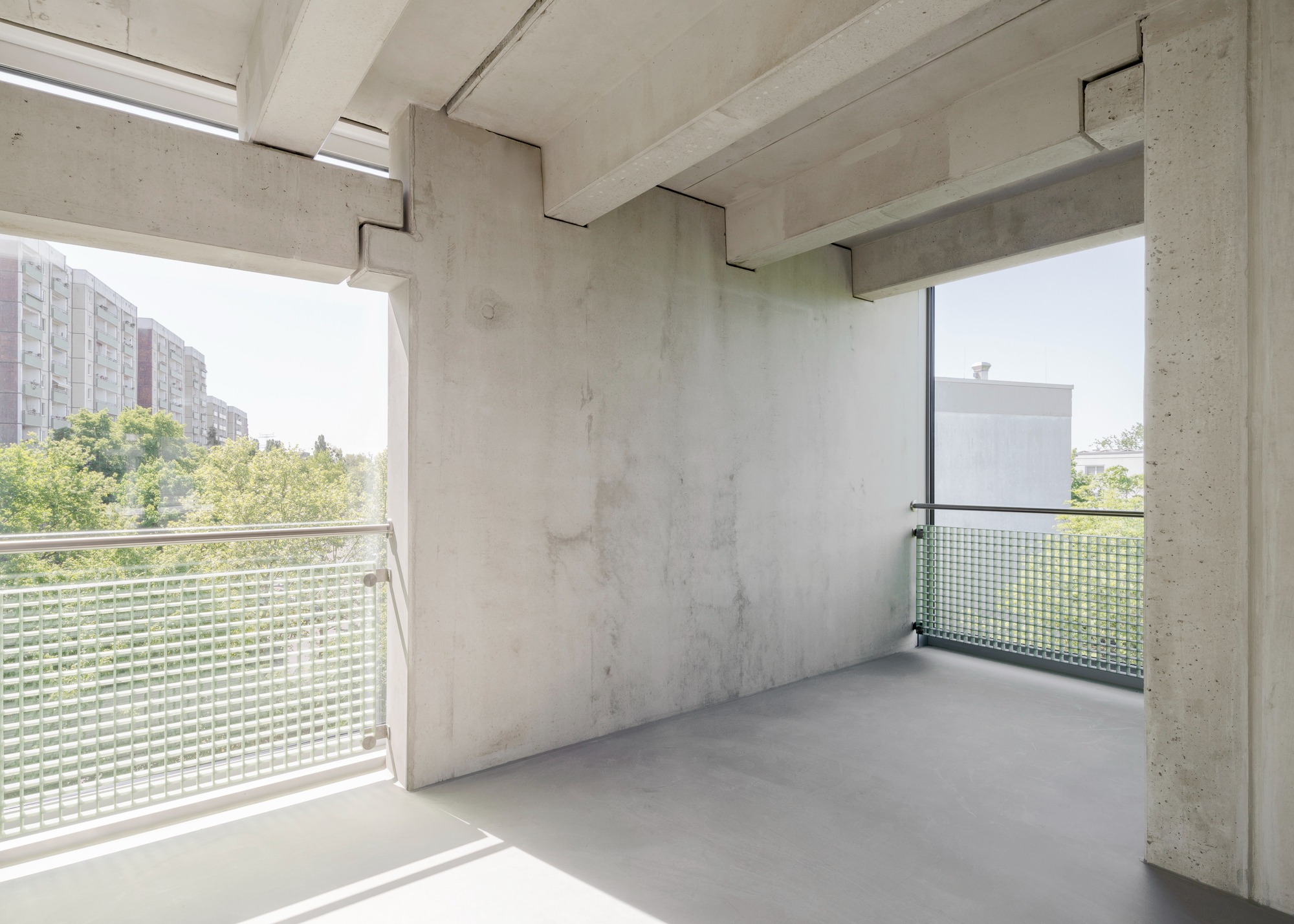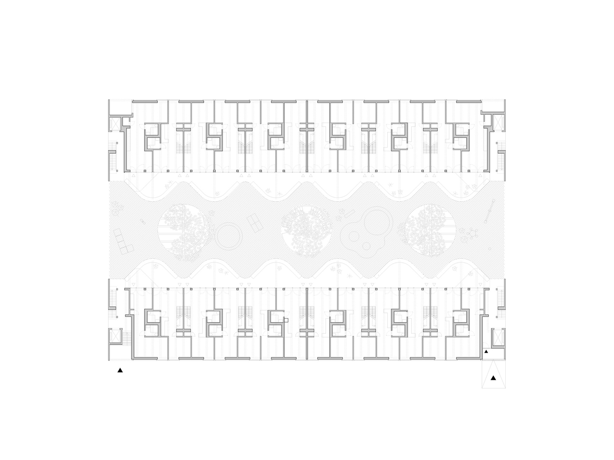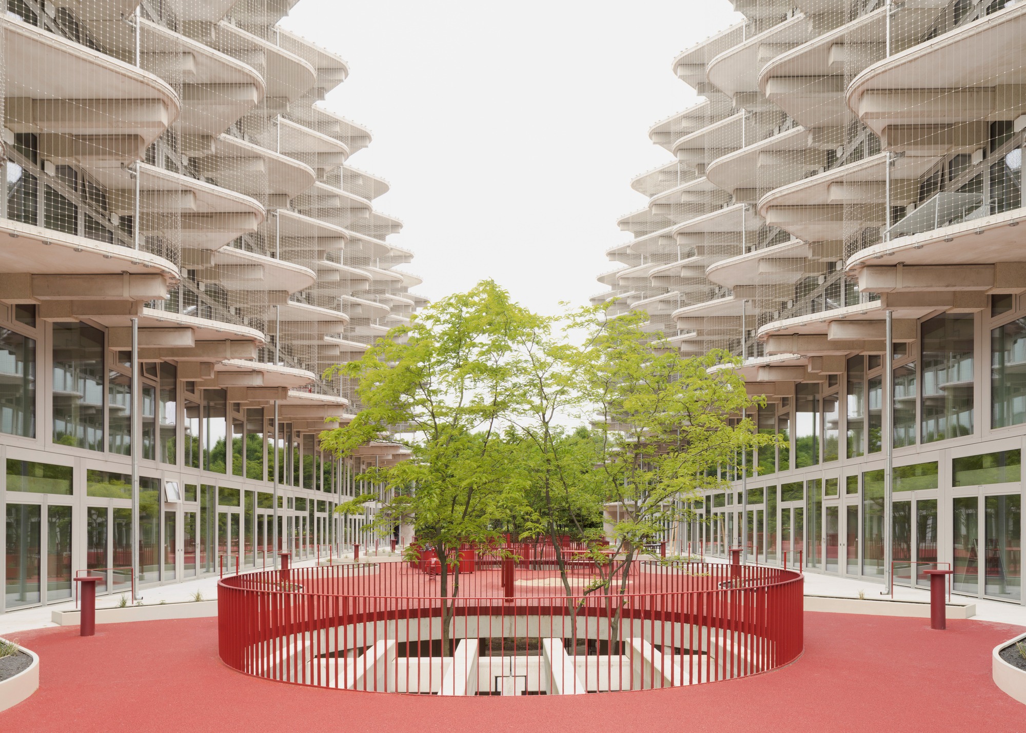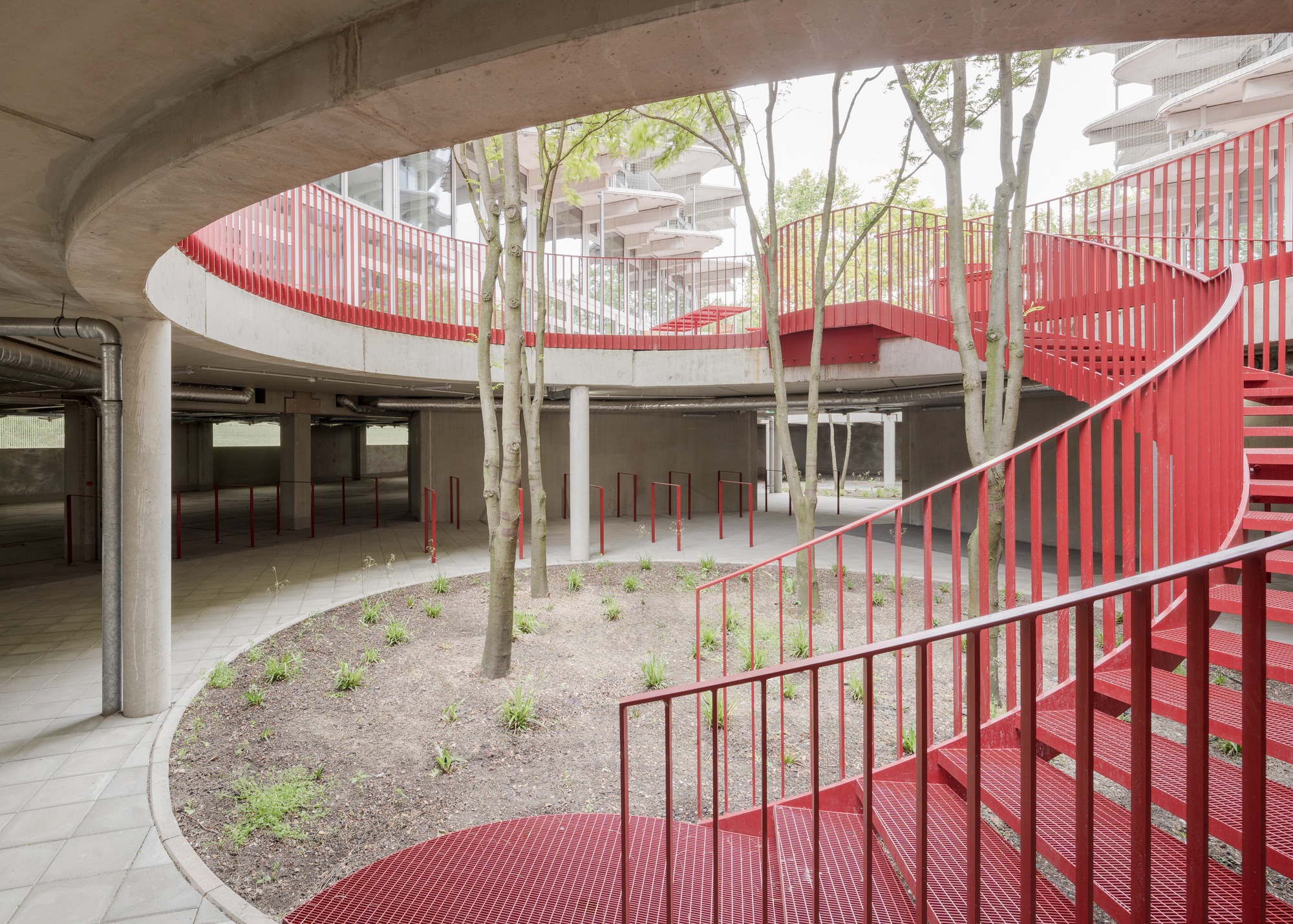 두 주거 블록은 중앙 정원 중정을 향해 열린 주랑 복도를 형성한다. 위층 아파트들로 향하는 이 공간들은 단순한 이동 통로가 아니라 동시에 사람들이 머무를 수 있는 장소가 된다. 확장된 주랑들은 각 아파트 앞에 정원 중정이 내려다보이는 전용 야외 휴식 공간을 만들어낸다. 이 공간들은 물결처럼 굽이치는 형태로 사적 영역을 자연스럽게 구분한다.