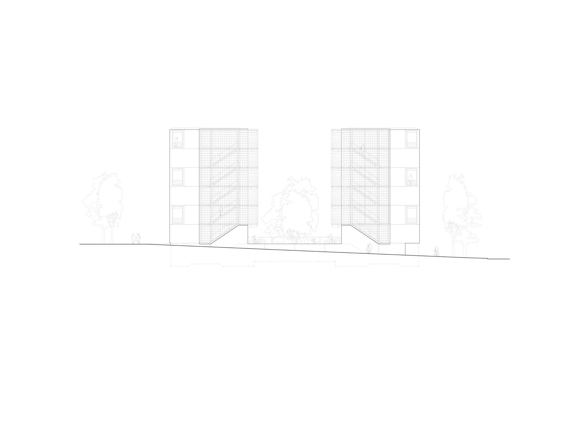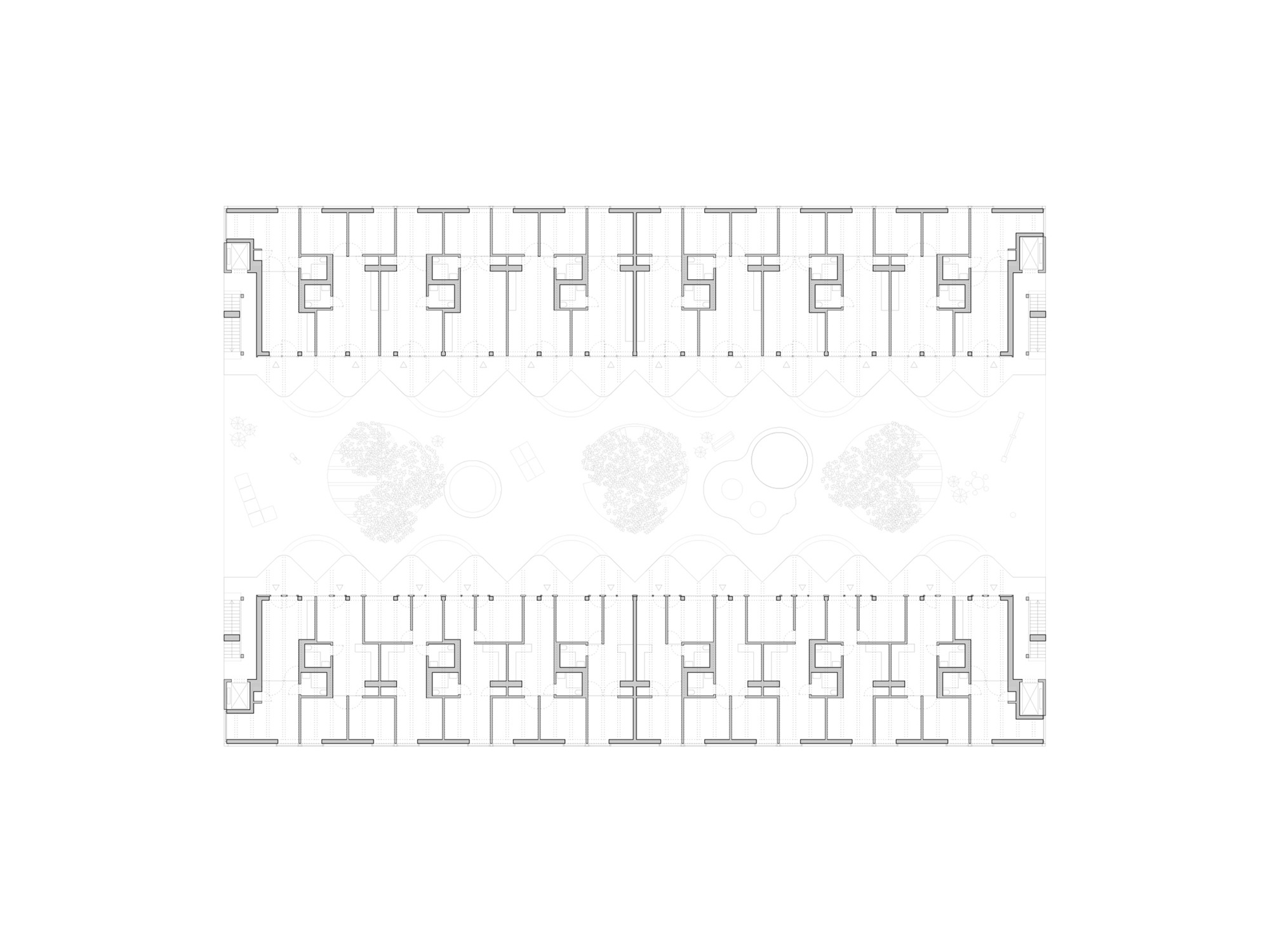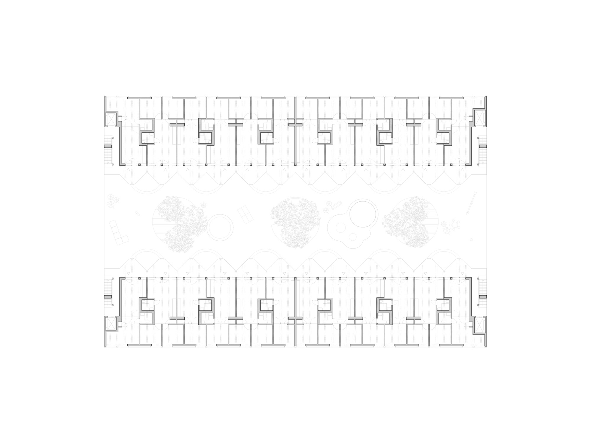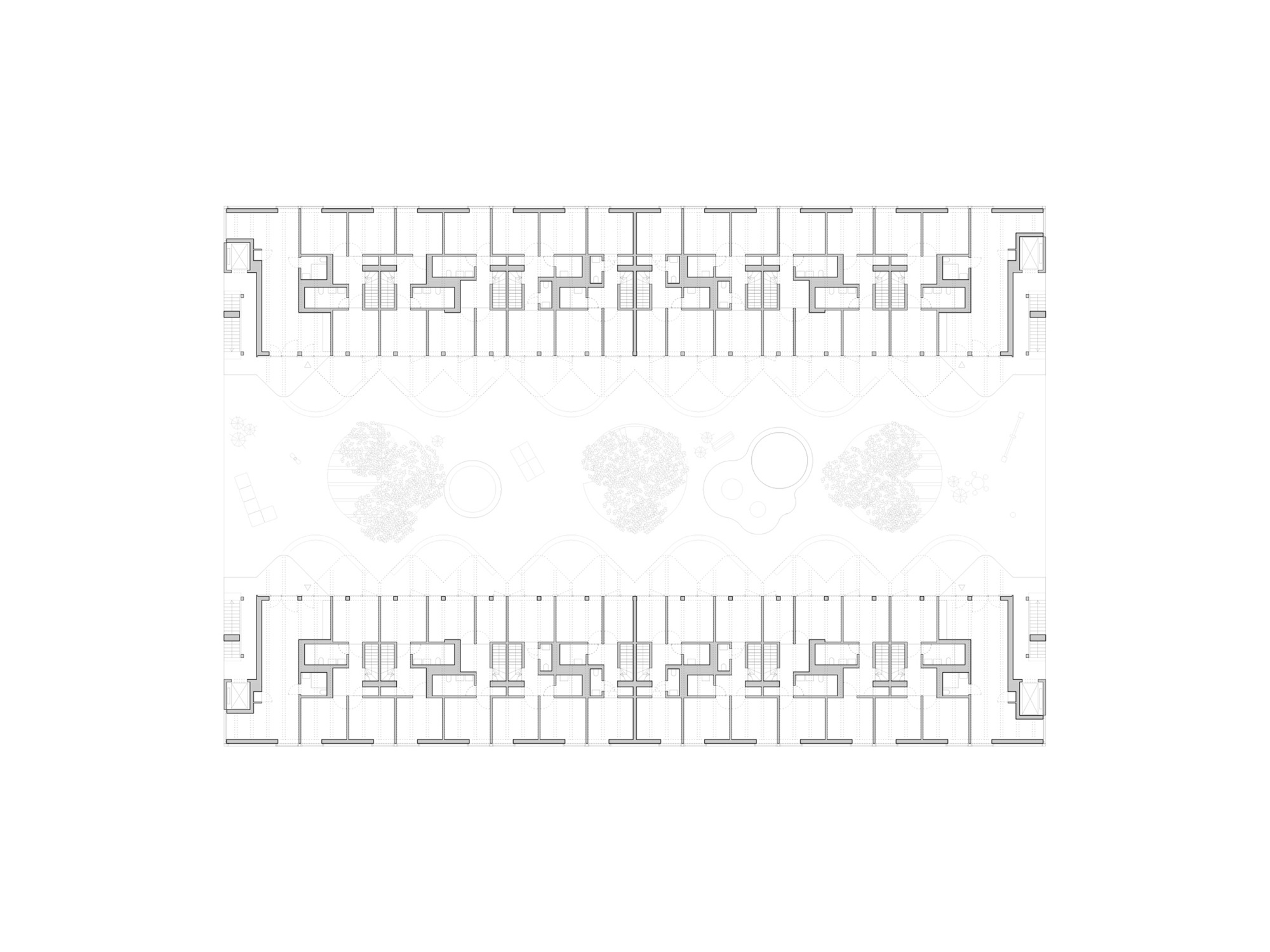 두 주거 블록은 중앙 정원 중정을 향해 열린 주랑 복도를 형성한다. 위층 아파트들로 향하는 이 공간들은 단순한 이동 통로가 아니라 동시에 사람들이 머무를 수 있는 장소가 된다. 확장된 주랑들은 각 아파트 앞에 정원 중정이 내려다보이는 전용 야외 휴식 공간을 만들어낸다. 이 공간들은 물결처럼 굽이치는 형태로 사적 영역을 자연스럽게 구분한다.
