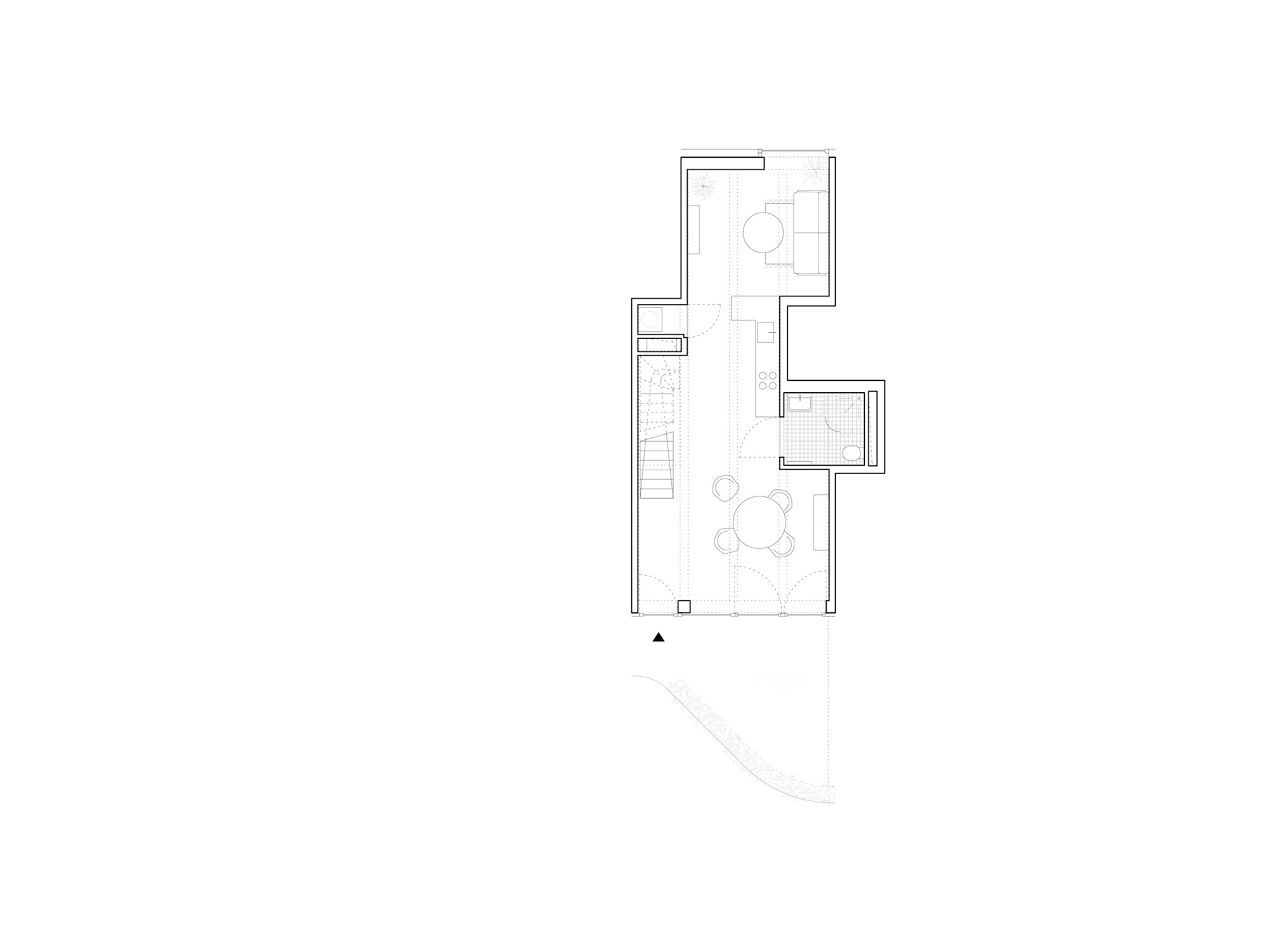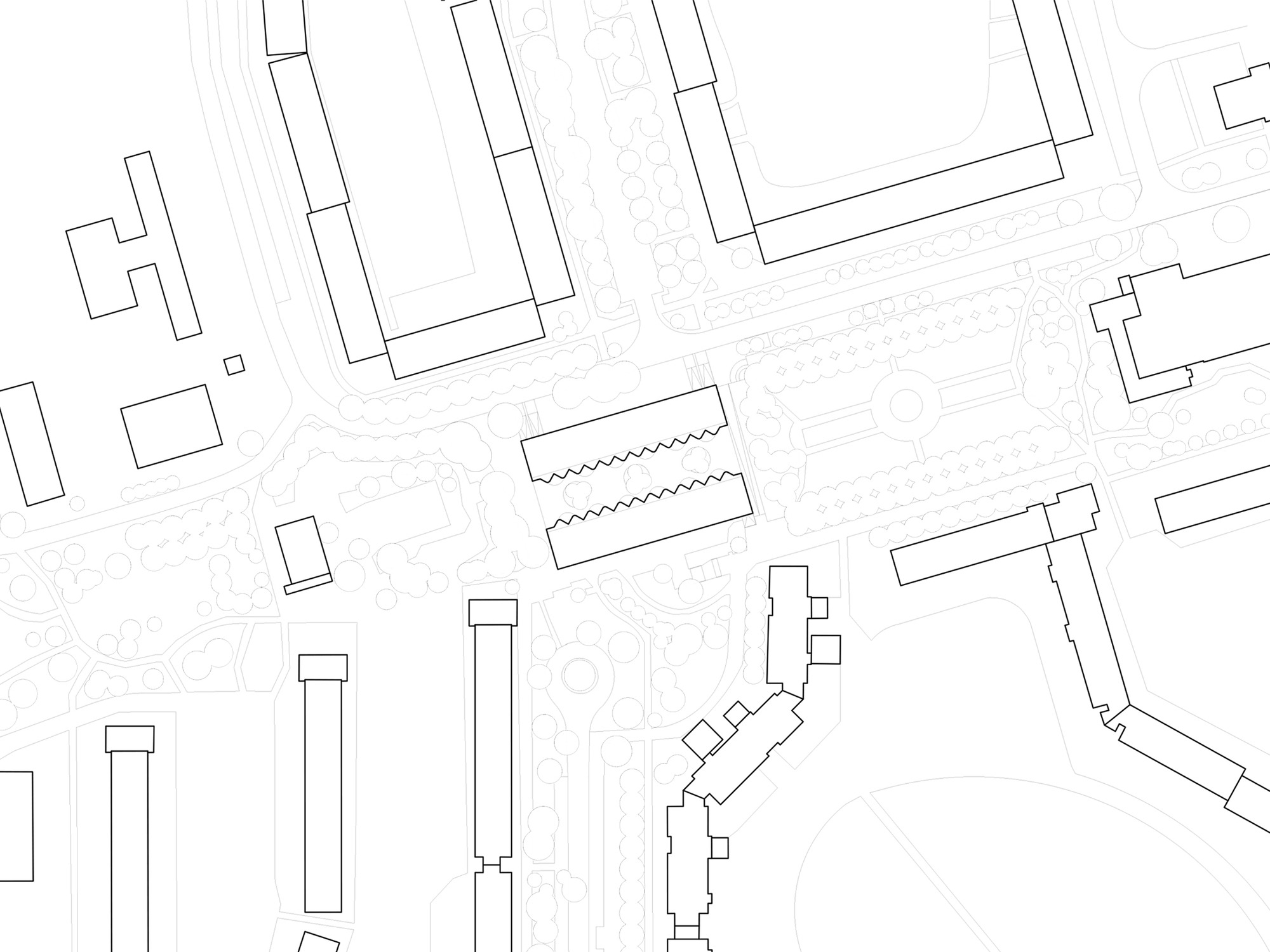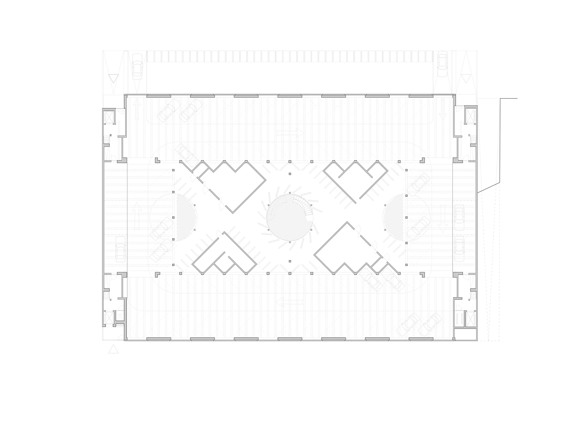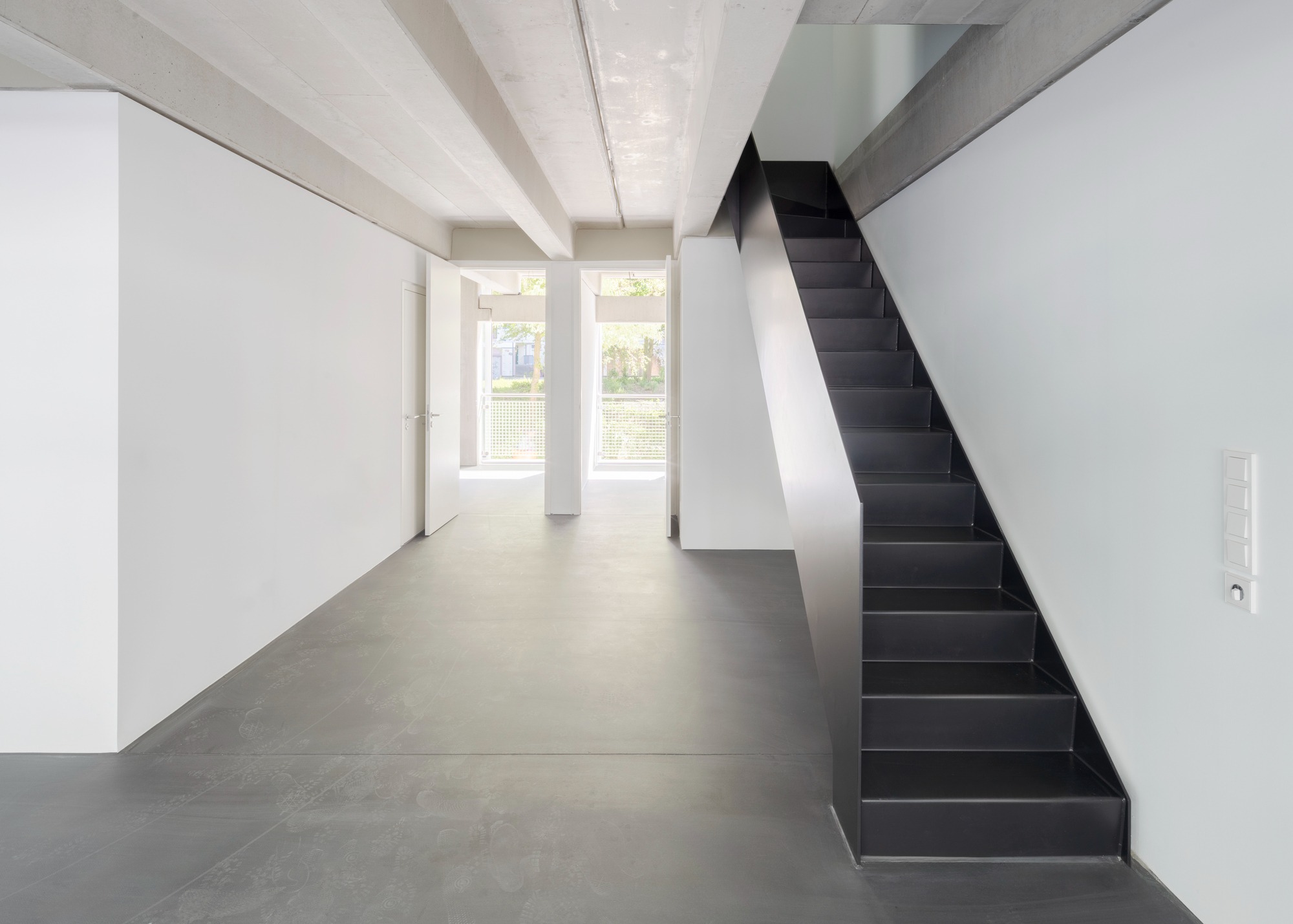 두 주거 블록은 중앙 정원 중정을 향해 열린 주랑 복도를 형성한다. 위층 아파트들로 향하는 이 공간들은 단순한 이동 통로가 아니라 동시에 사람들이 머무를 수 있는 장소가 된다. 확장된 주랑들은 각 아파트 앞에 정원 중정이 내려다보이는 전용 야외 휴식 공간을 만들어낸다. 이 공간들은 물결처럼 굽이치는 형태로 사적 영역을 자연스럽게 구분한다.