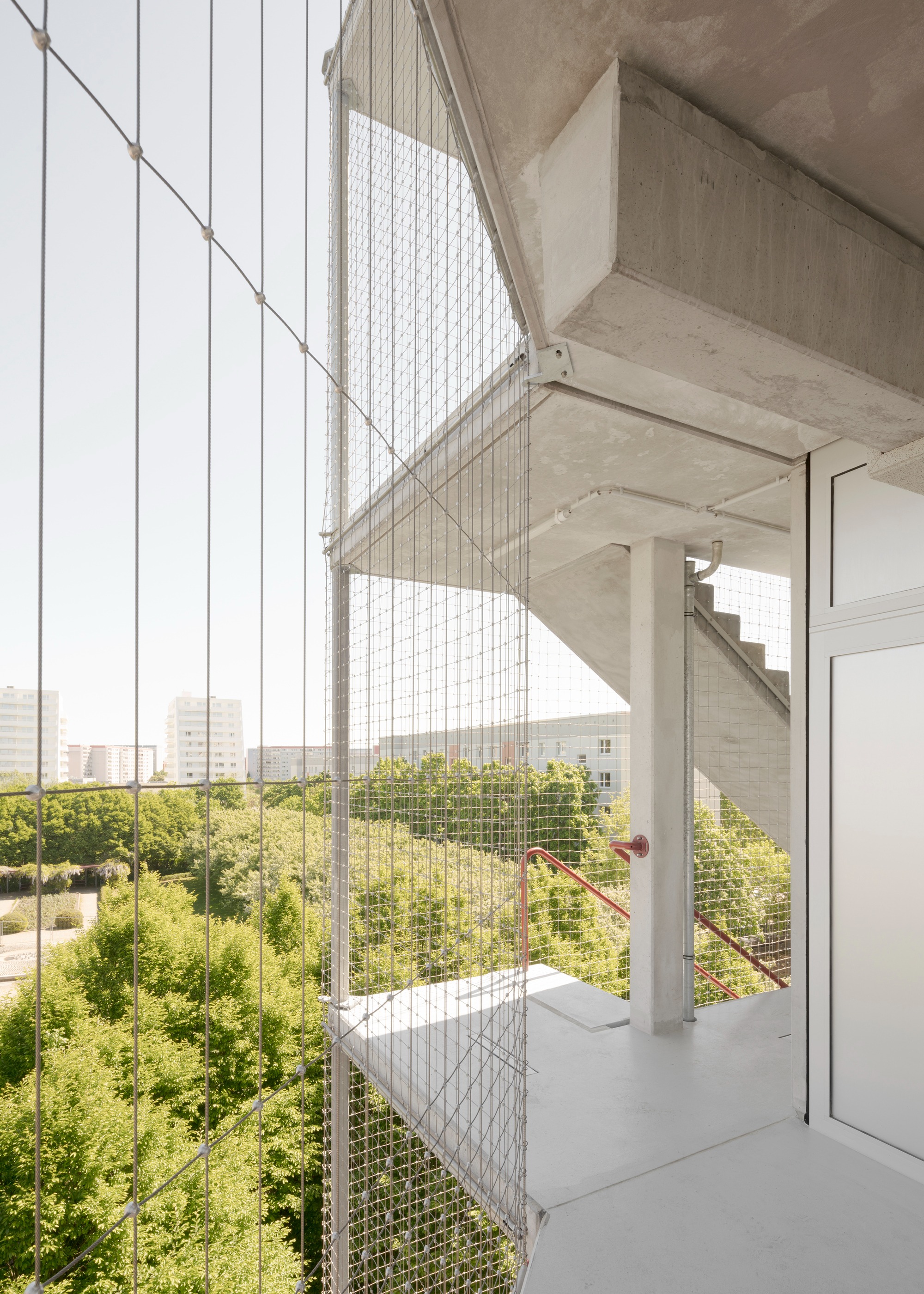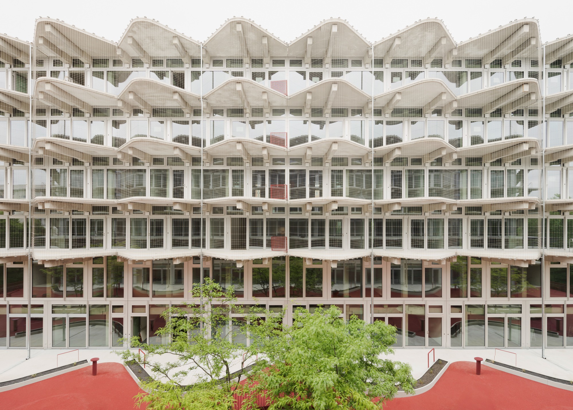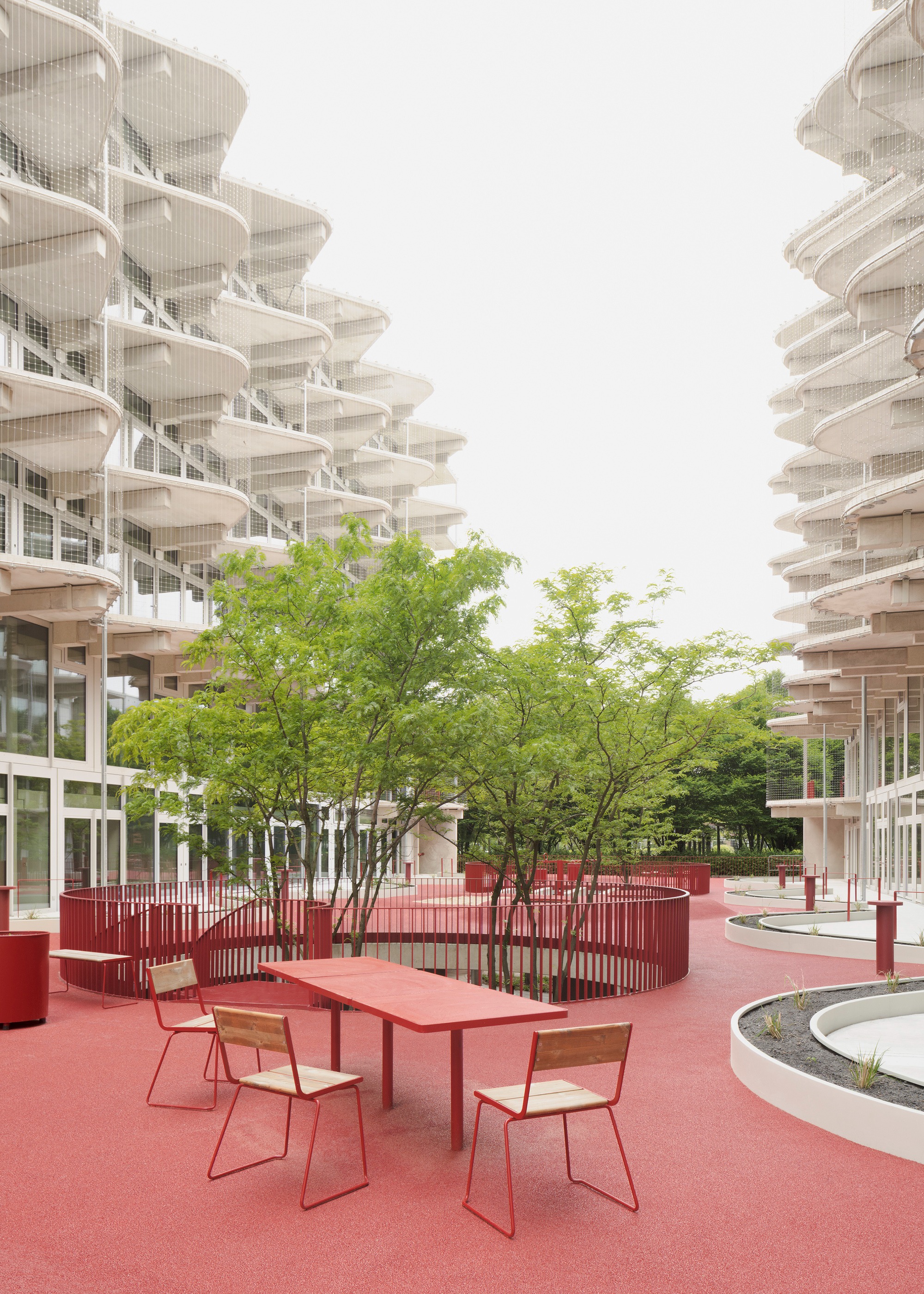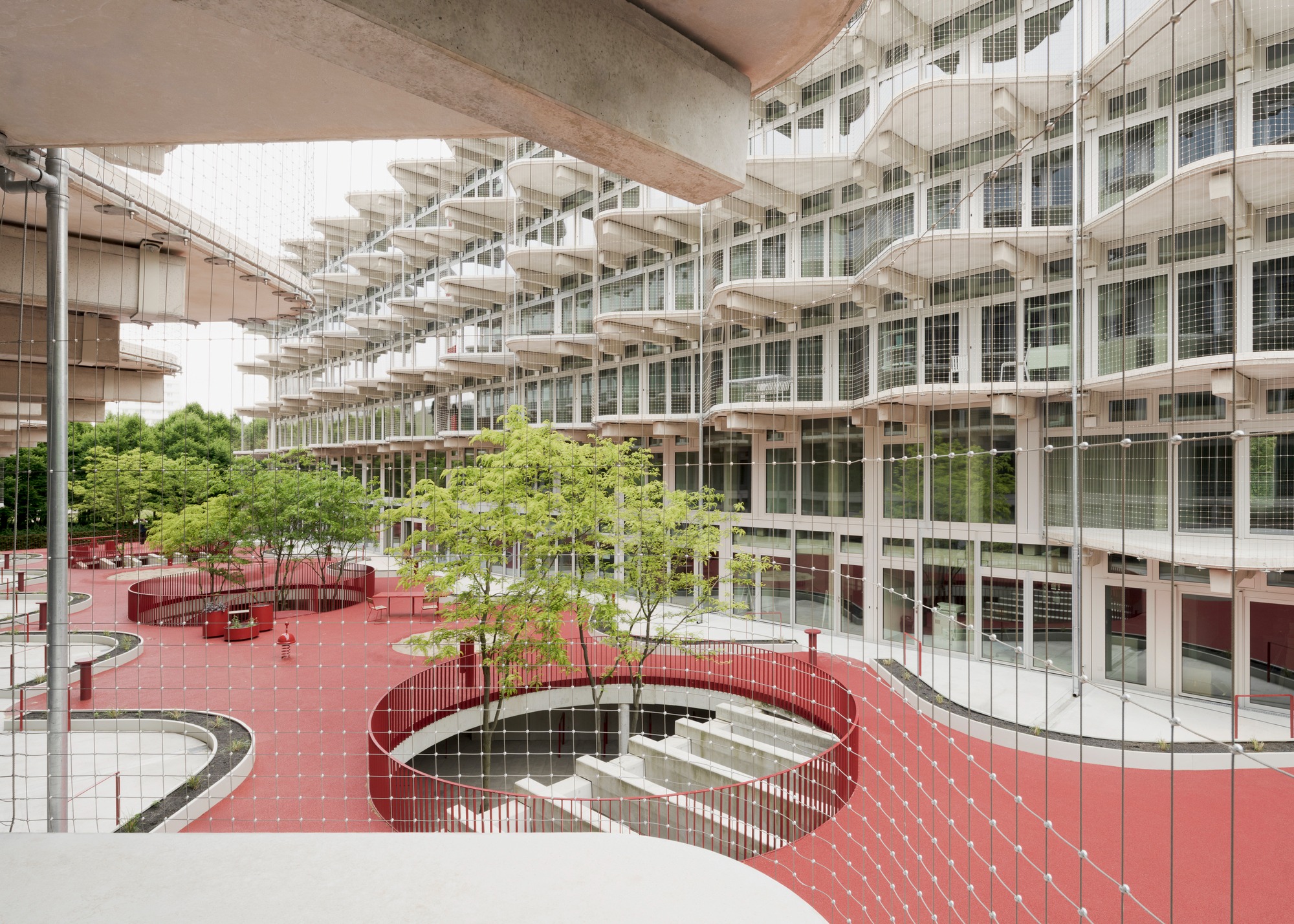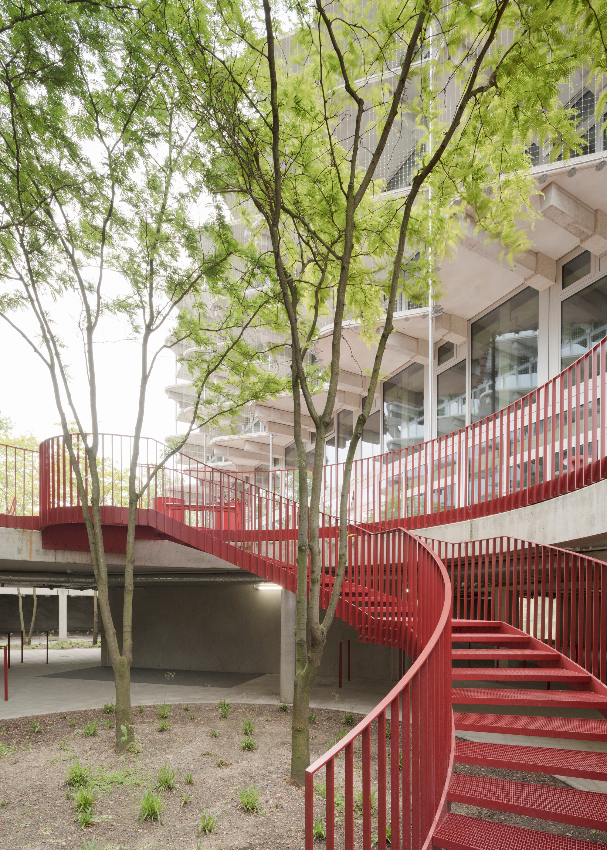 섬세한 스테인리스 스틸 안전망은 난간 역할을 하는 동시에 식물들이 자라날 수 있는 든든한 지지대가 된다. 빨간색으로 통일된 계단과 난간, 바닥재는 이 건물의 사회적 연결 의지를 상징한다. 사람들은 이 밝은 색채의 동선을 따라 걷고, 머무르고, 이웃과 자연스럽게 마주치며 소통한다.