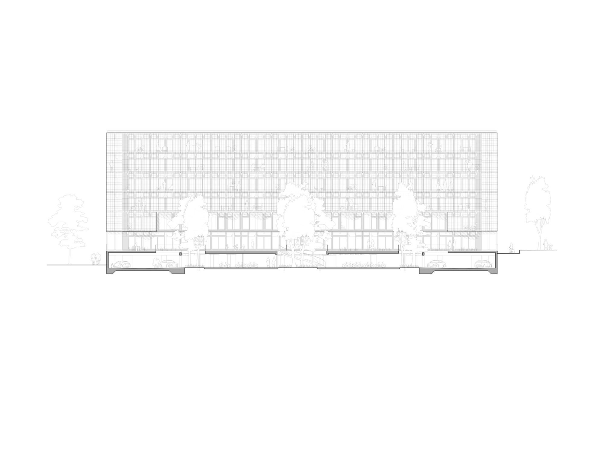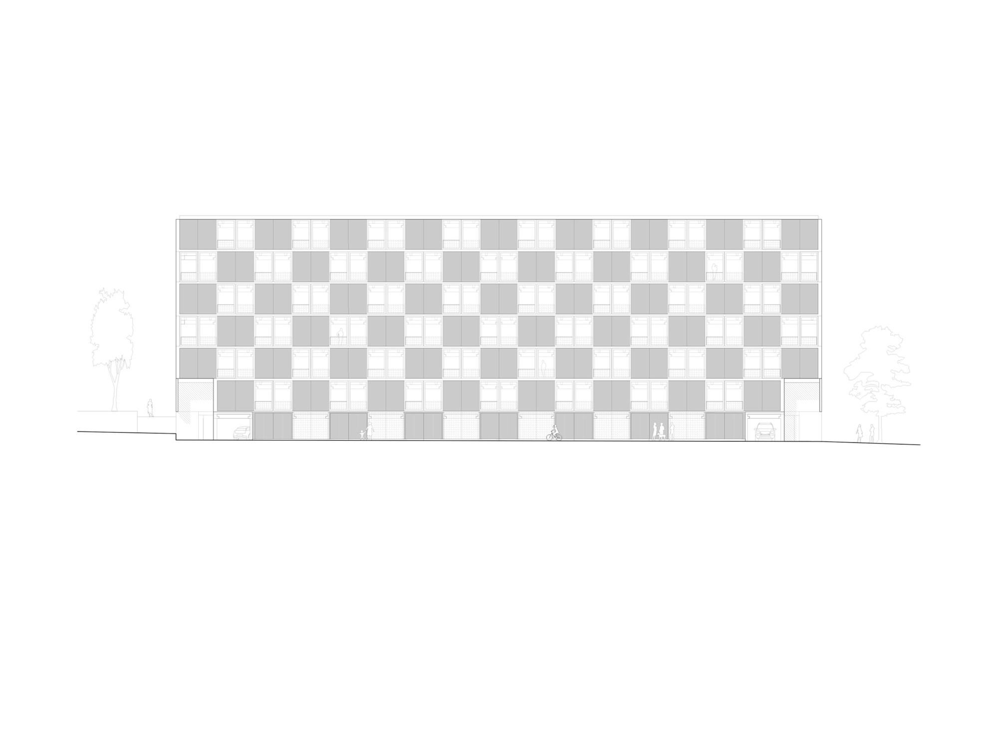 Residential variety - Towards the „outside", facing the neighborhood, both blocks present a more enclosed image in the form of French balconies with floor-to-ceiling sliding windows alternating with closed aluminum panels. All apartments open up to both opposing ends of each block: to the garden plateau as well as to the neighboring exterior. Their open floor plans allow residents to decide for themselves whether to orient their more intimate living areas outward or toward the garden plateau