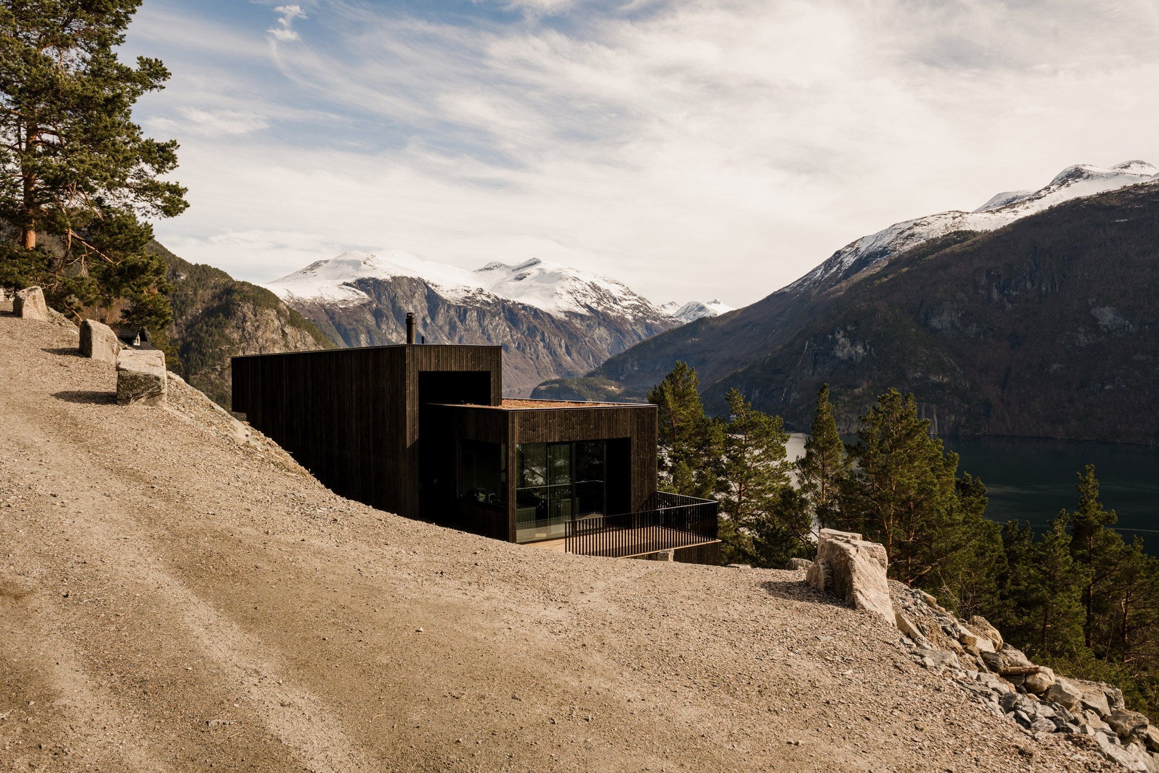 검게 그을린 목재 외장은 건물이 인근 숲과 자연스럽게 어우러지도록 돕는다. 방문자들은 암석 노두와 건물 사이의 좁은 길을 따라 주택에 접근하며, 경사면의 윤곽을 따라 길처럼 이어지는 높고 선형적인 복도로 들어선다.