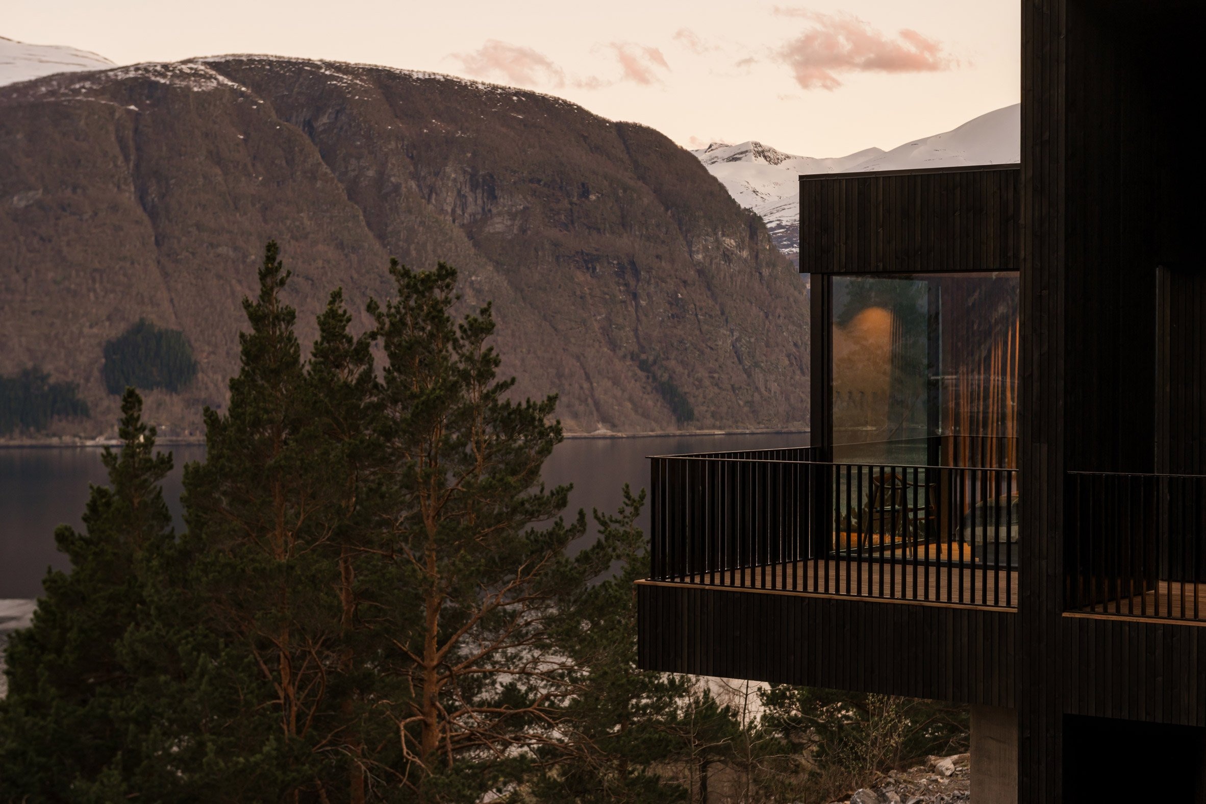 This opens up into the main house, which includes a living area, kitchen, dining space, and bedrooms. The living area and bedrooms include panoramic views of the fjord.