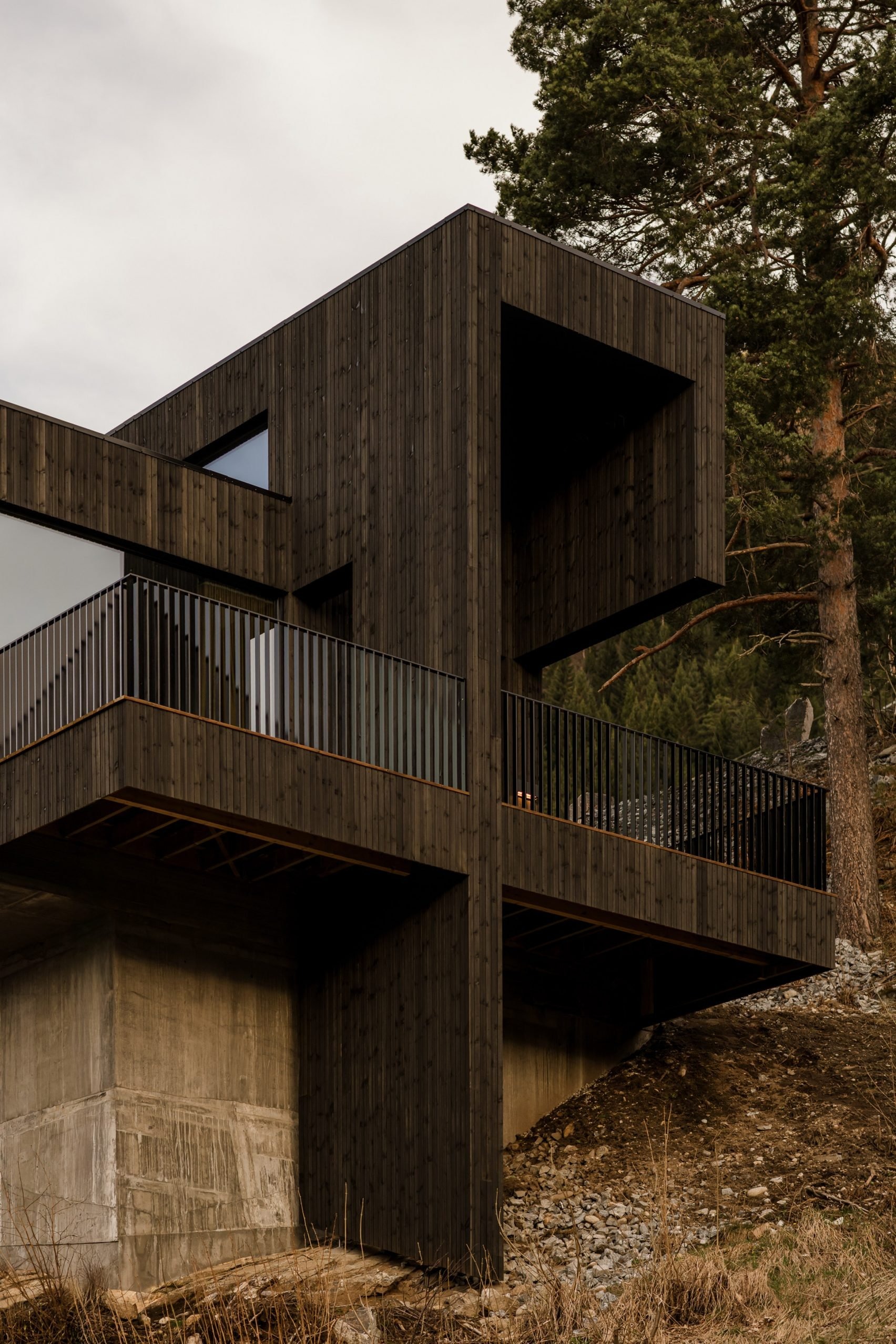 Its plan is based on two rectangular modules on concrete plinth, raised off the hill's rocky incline. Blackened timber cladding helps the building blend in with nearby forests.