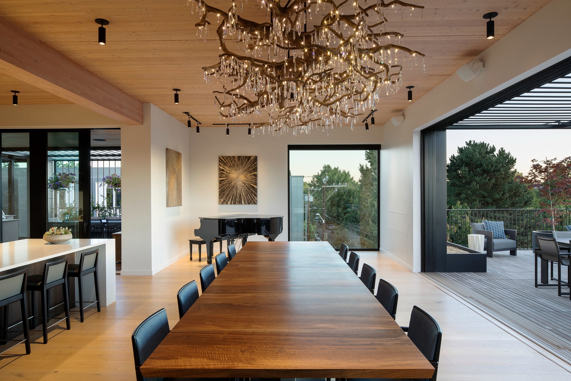 The interiors are defined by a simple palette of minimally finished materials (white oak floors and ceilings, gypsum board walls). Residents were able to pick from a limited set of kitchen and casework templates. Furnishings are provided by individual owners. Art is integrated throughout common areas, and includes a custom chandelier, a digital art display wall, and outdoor sculpture, among other pieces. Terraces are defined by a grid of painted steel tubes/rods that serve as an armature for star jasmine, which will eventually grow to cover portions of the building. The fourth floor serves as the communal terrace, which provides a rich set of amenities and indoor and outdoor spaces. Clustering all of the shared spaces on one level ensures there's plenty of room to be by oneself or with others regardless of activity: cooking, dining, playing games, crafts, reading, swimming, or watching movies. It's all there, one level within a common area set within the larger building.