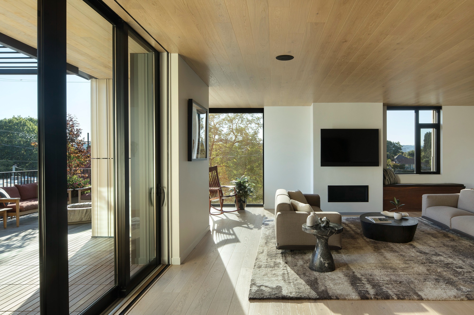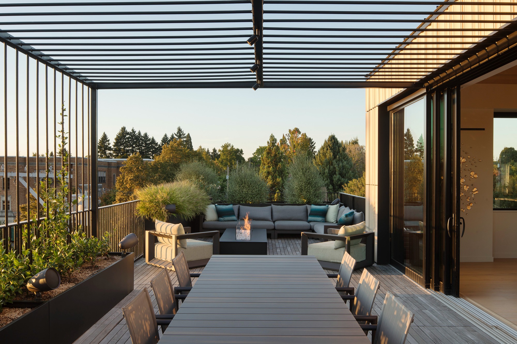 The building features a post tensioned concrete frame; its top floor is built with cross laminated timber (CLT) and wood beams. Prefabrication—CLT and terra cotta—helped minimize field work, shortening the construction window while reducing costs. Other building materials include thermally efficient fiberglass windows, metal trellises and guardrails, and Ipe decking. Below the building is a small, underground parking garage.