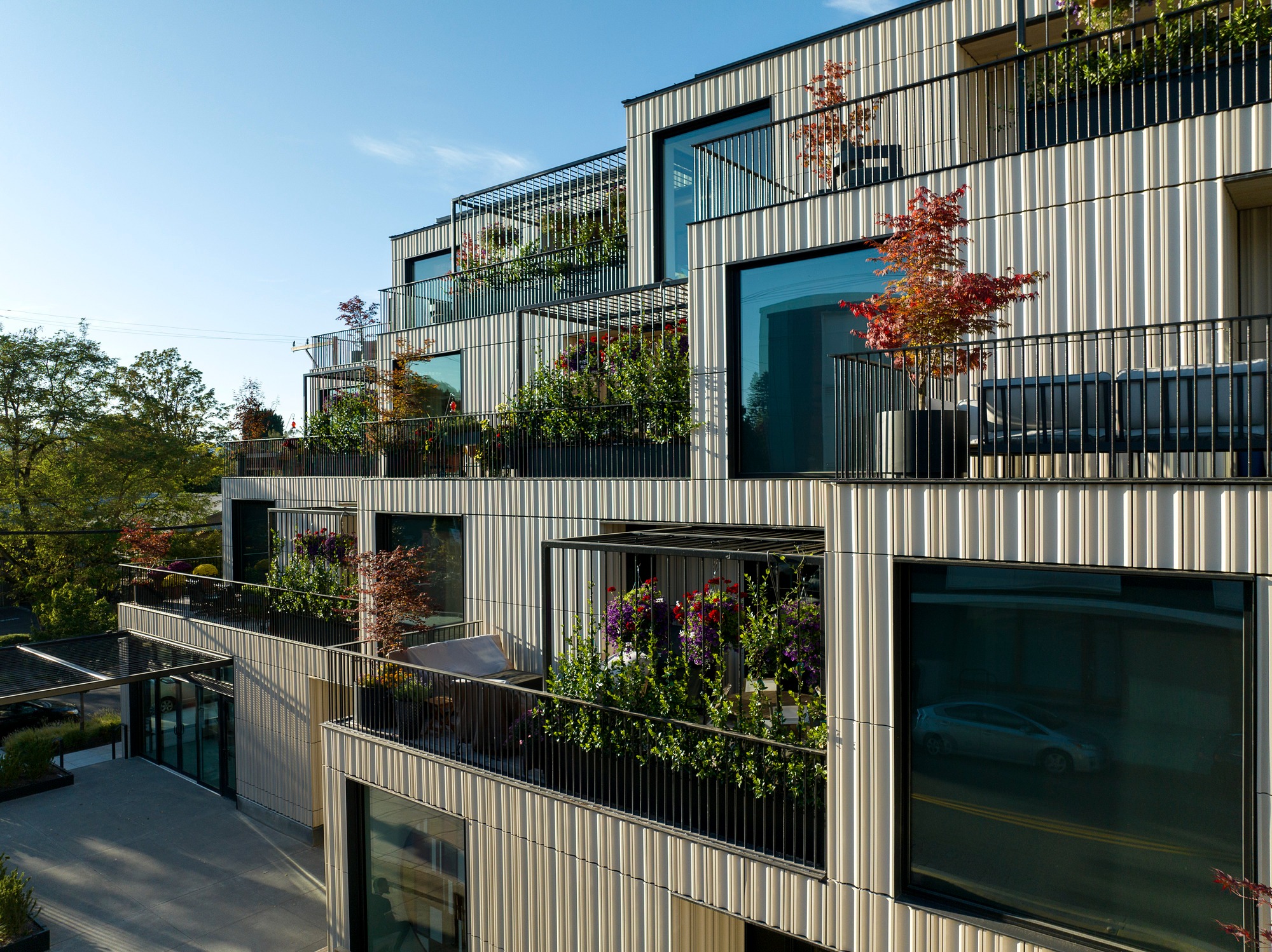 홈이 파인 오프화이트 테라코타 패널로 마감된 건물은 빛을 담는 도시의 캔버스가 된다. 질감 있는 외벽에 햇빛이 닿으면 시시각각 색과 그림자가 변주된다. 시간은 이렇게 건물 표면에 기록된다. 층층이 배치된 테라스는 건물의 압도감을 부드럽게 덜어낸다. 푸르른 잎사귀의 차폐 식재가 테라스를 감싸며 프라이버시를 지켜준다. 이 테라스는 수직으로 펼쳐진 앞마당이다. 거주자들은 이곳에서 친구들과 어울리며 도시의 풍경을 함께 누린다.