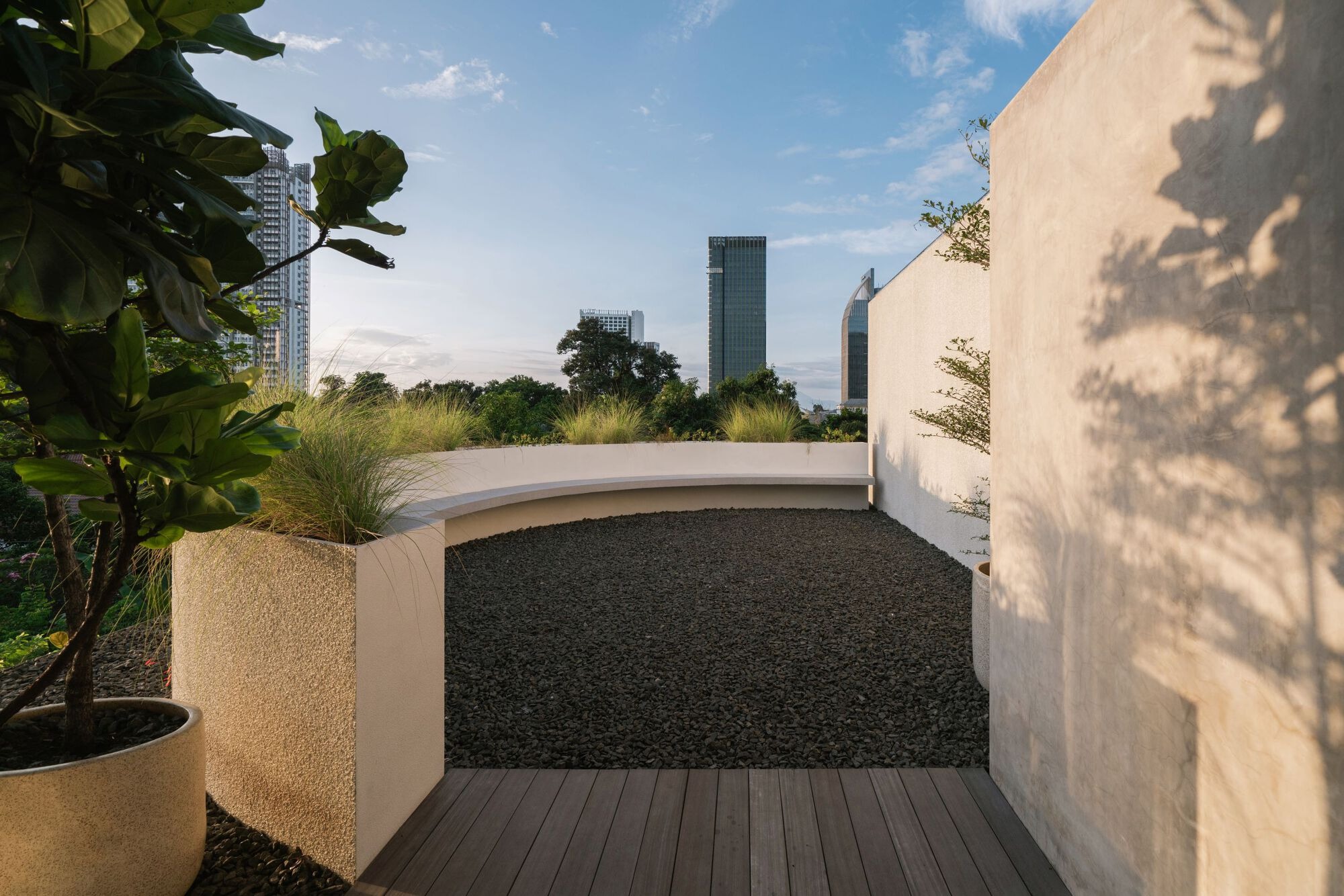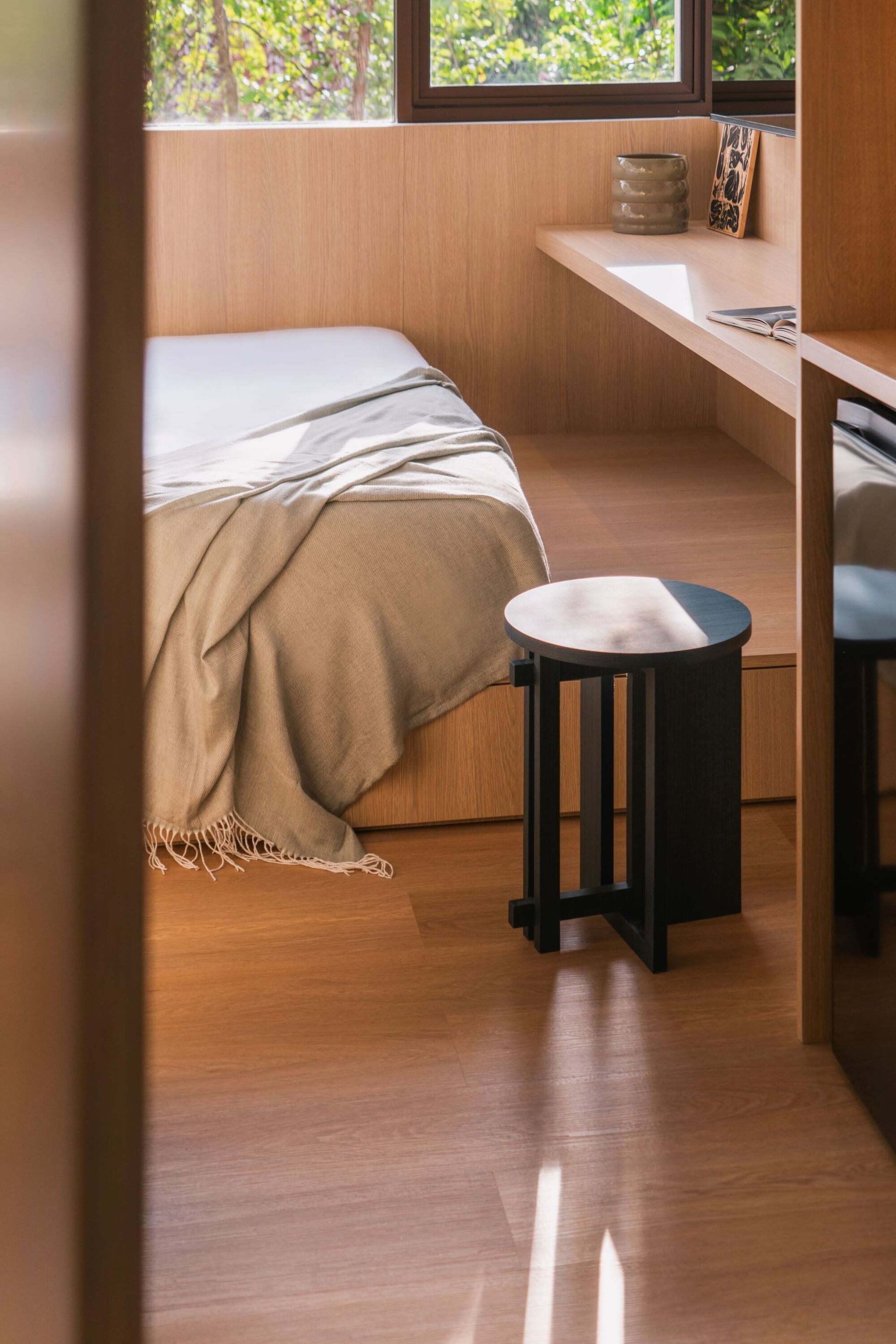 The use of wood, clean lines, and a neutral palette complements the raw concrete exterior, enhancing the balance between solidity and openness. Following the fluidity of the façade, the interior walls are also sculpted with curved forms. Some sections of the railing wall are detached, creating a dynamic interaction of light and movement from the inhabitants. This play of motion enriches the spatial experience and improves the livability of the compact space.