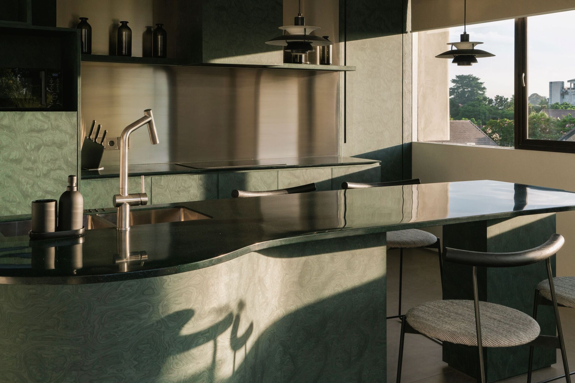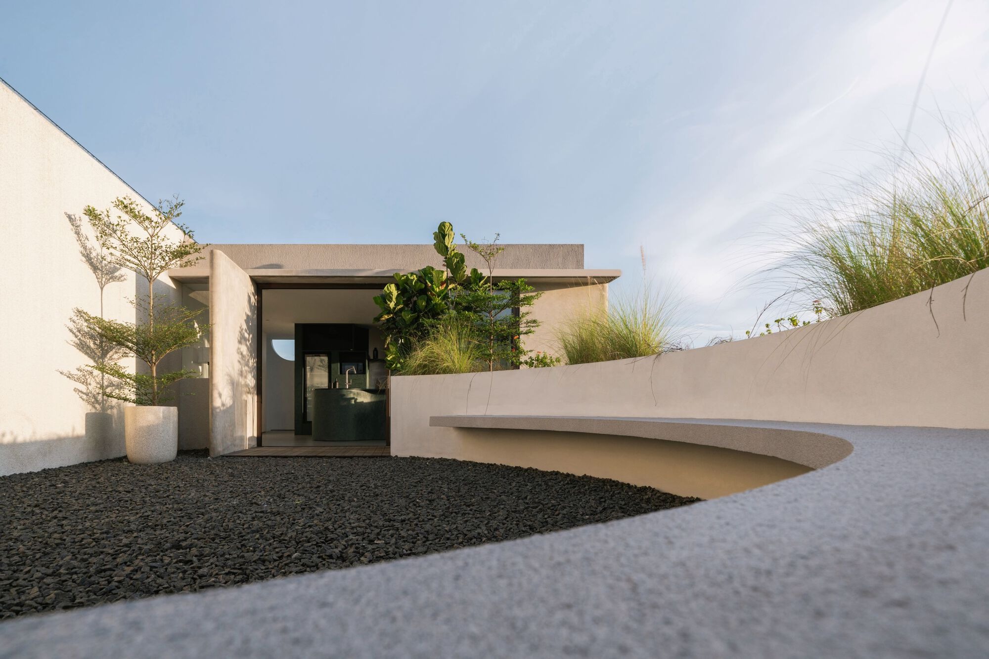 Isso Architects have infused the building with a language of subtle fluidity, blending curving and bending geometries to create a soft, harmonious, and playful composition. The repetition of cylindrical elements adds a rhythmic quality to the structure, making it both visually unique and functional offering a refreshing contrast to the conventional houses along the street.