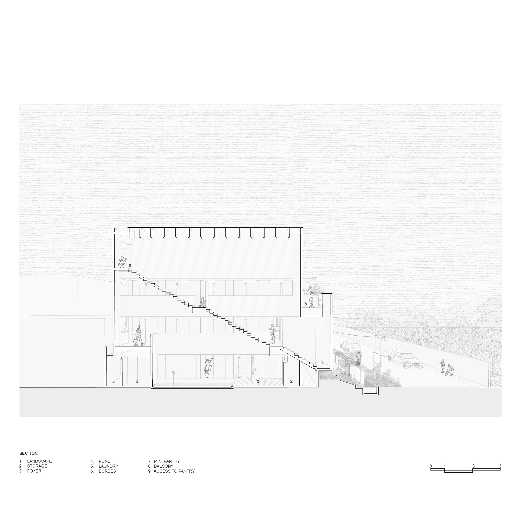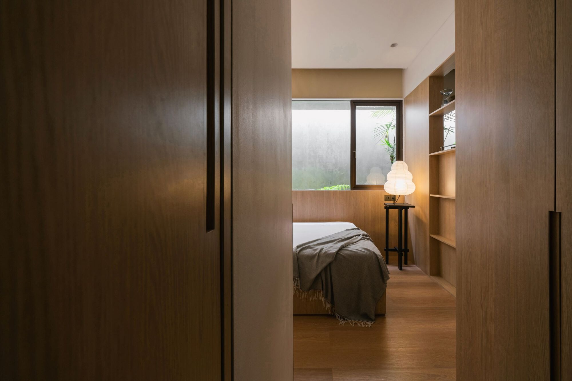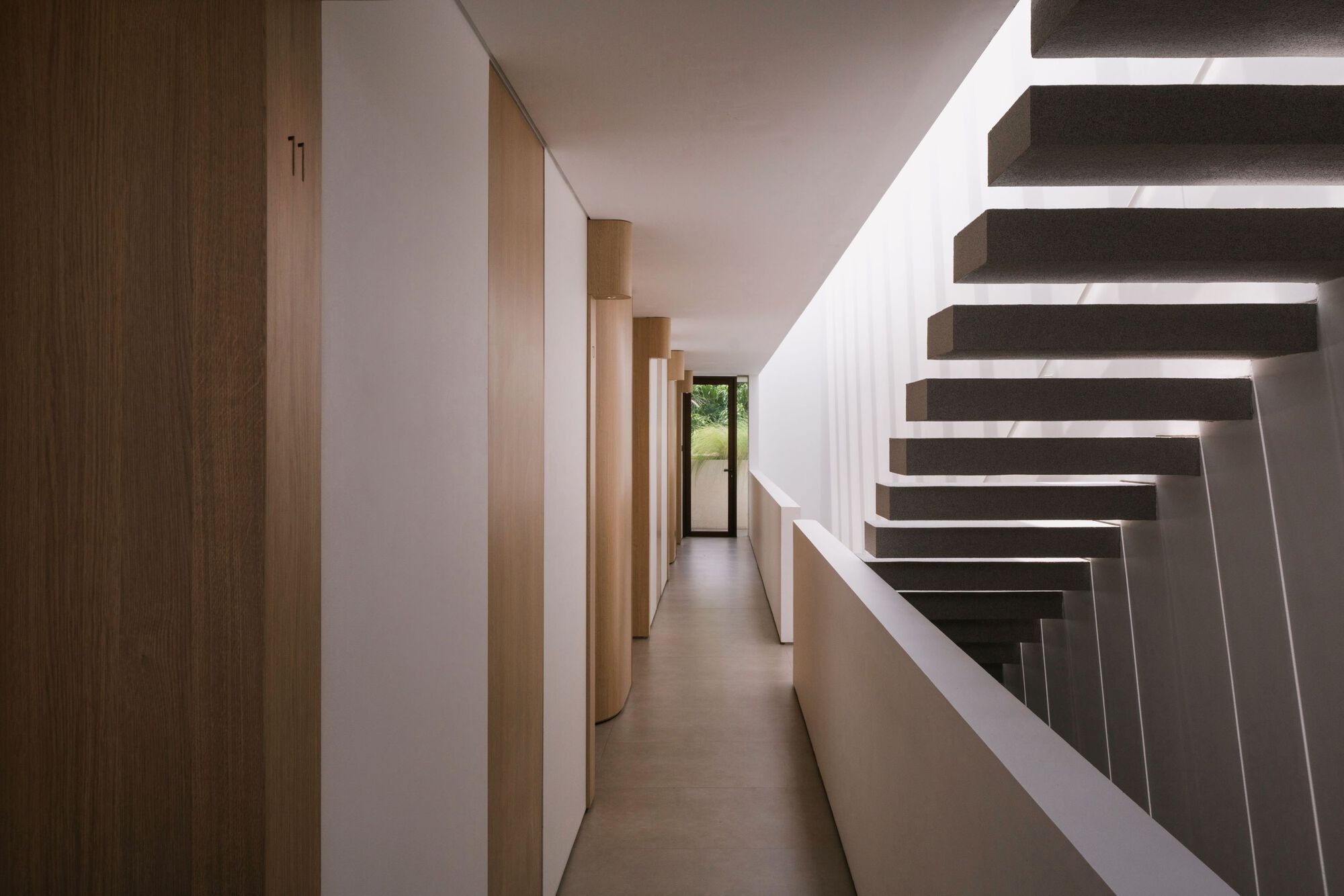 Upon entering, visitors are greeted by a solid wooden floor beneath a triple height staircase, complemented by a skylight that allows natural light to filter through, casting dynamic shadows on the walls. A long reflective pond enhances the experience, emphasizing the interplay of light, air, and water. The architects liken the flats' view to a slowly turning kaleidoscope, where the scene shifts by the hour—or sometimes, with the blink of an eye.