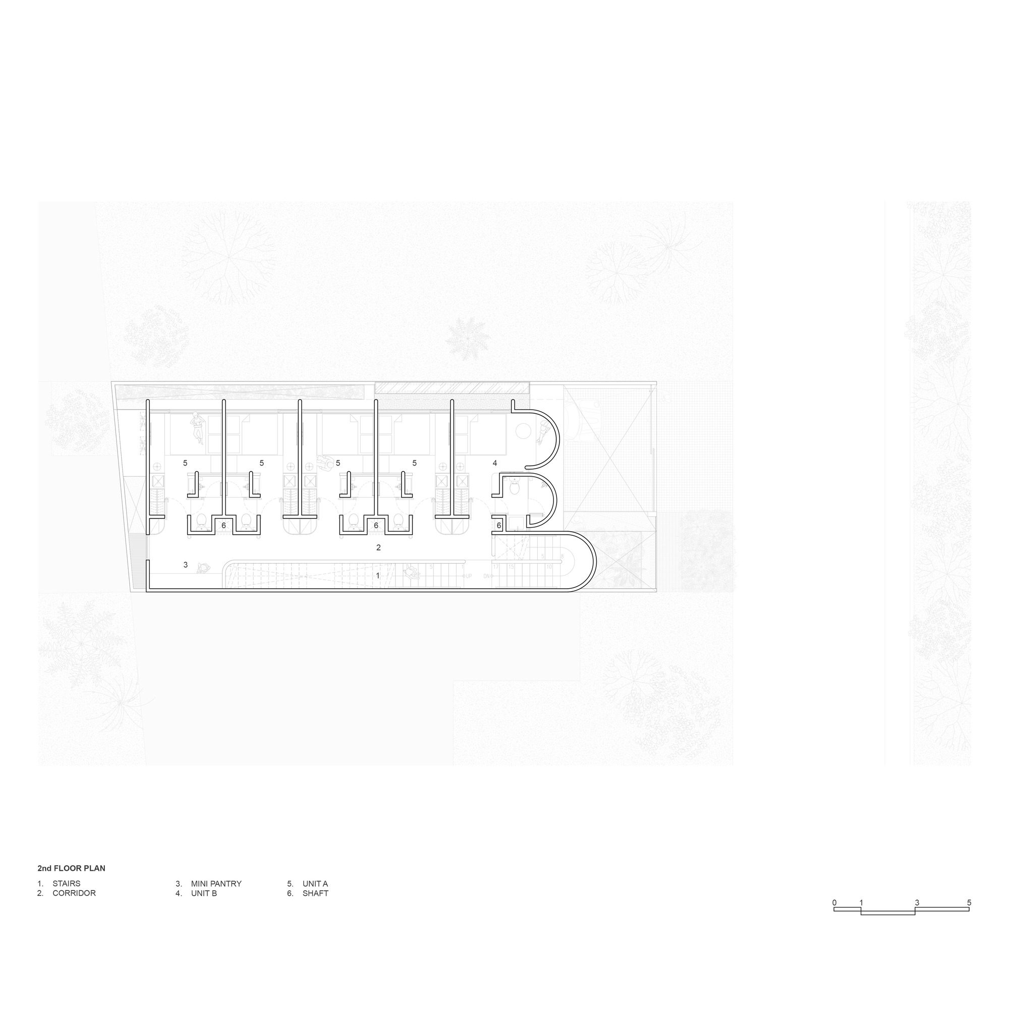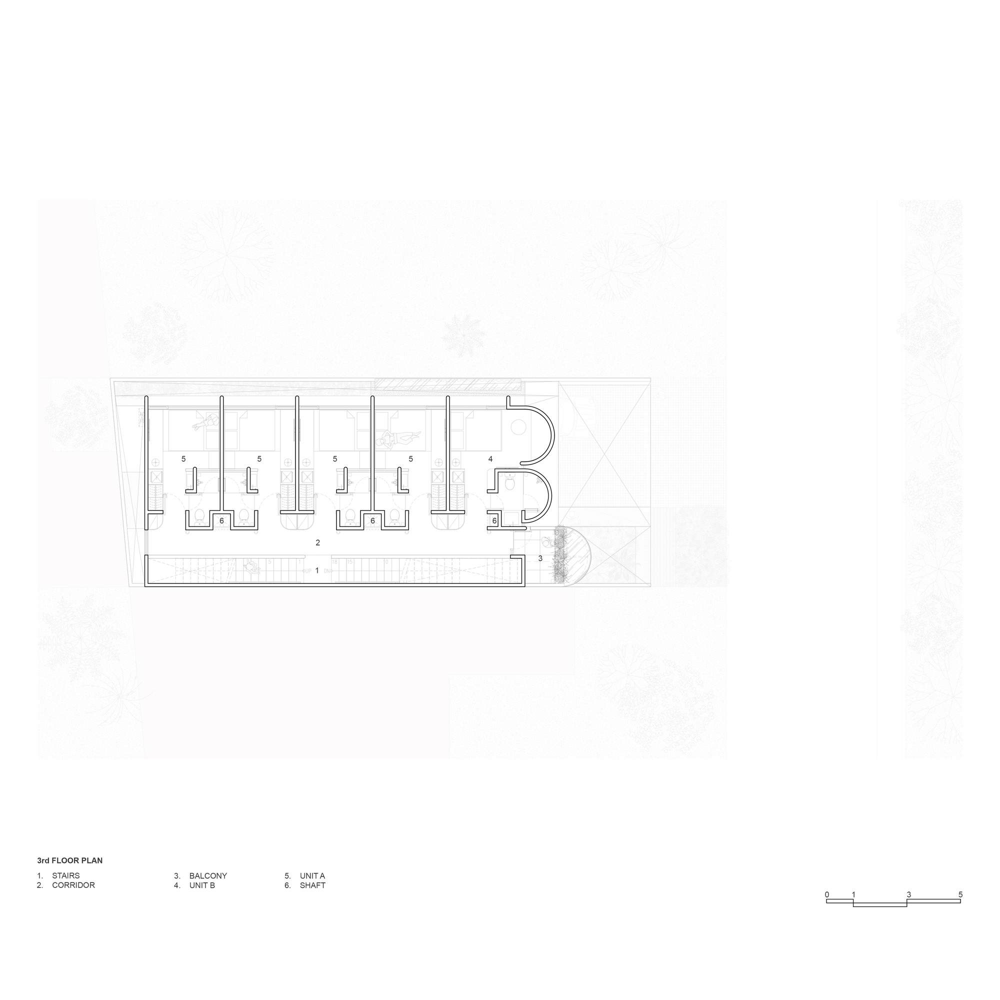 이 경험을 가능케 하는 것은 명쾌한 구조다. 레이아웃은 계단, 복도, 객실로 나뉘는 세 개의 종방향 구역으로 정리되었다. 모든 기계 및 전기 설비는 중앙 샤프트에 집약해 유지관리를 단순화했다. ABC Flats는 밀집된 환경에서 작은 대지를 창의적으로 활용한 사례다. 반복되는 기하학, 빛의 연출, 공간과 거주자 사이의 동적 관계가 핵심을 이룬다. Isso Architects는 제약을 가능성으로 전환하며, 기능과 아름다움이 조화를 이루는 주거 유형을 제시했다.