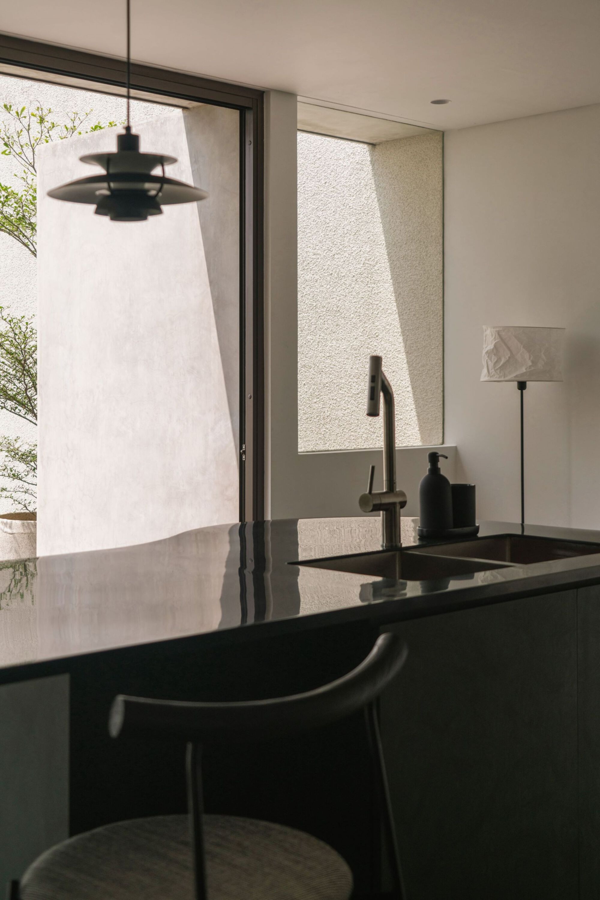 형태의 독특함은 내부 경험으로 이어진다. 들어서면 단단한 목재 바닥과 3층 높이 계단실이 맞이한다. 천창을 통해 스며드는 자연광이 벽면에 그림자를 드리우고, 긴 수경이 빛과 공기, 물의 상호작용을 강조한다. 건축가는 이 풍경을 천천히 돌아가는 만화경에 비유한다. 시간마다, 때로는 눈 깜빡할 사이에 장면이 변화한다. 외관의 유동성을 따라 내부 벽면 역시 곡선으로 조각되었다. 난간 벽의 일부는 분리되어 거주자의 움직임에 따라 빛과 동적으로 상호작용한다. 목재의 따스함과 간결한 선, 중성적 색상이 노출 콘크리트와 조화를 이루며 견고함과 개방성의 균형을 만든다. 이러한 움직임의 유희는 제한된 면적 안에서도 거주성을 향상시킨다.