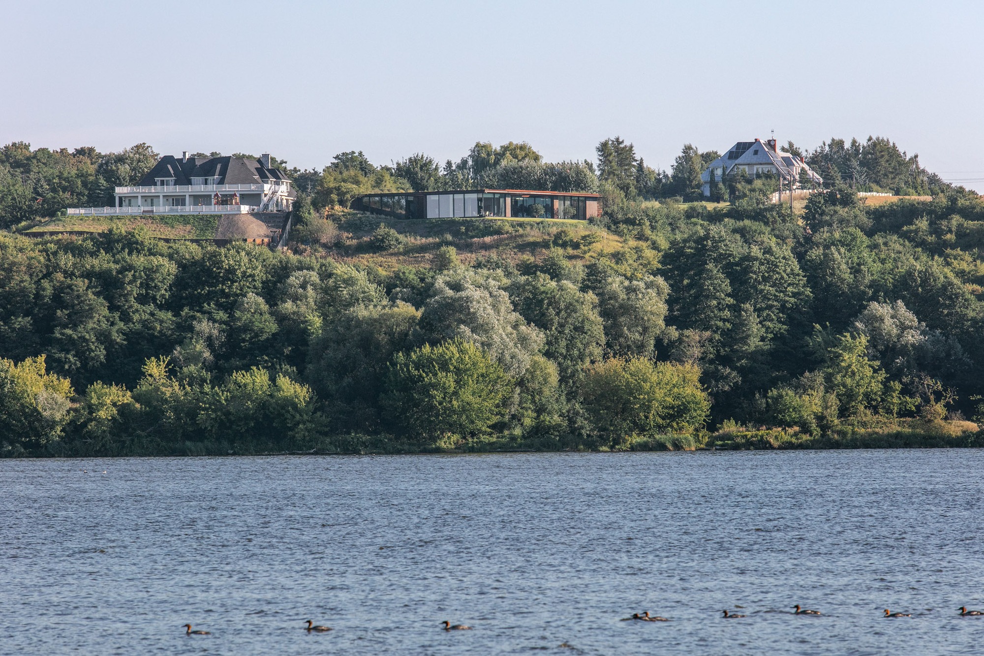 이처럼 극적인 대조를 만든 후, 건축가는 건물이 자연과 온전히 하나가 되도록 세심한 전략을 펼친다. 경사지의 자연스러운 형태를 최대한 건드리지 않는 것이 원칙이었다. 강변에서 보면 절개면은 가늘게 그어진 처마선 하나로만 잘려 있고, 이 선이 풍경의 수평을 부드럽게 강조한다. 경사지 안쪽으로 건물은 땅의 구조 속으로 파고들어 대지의 자연스러운 지형 흐름에 스스로를 맞춘다. 이런 해법은 건축이 녹음 속에 숨어 다른 이들이 비스와 강 파노라마를 바라보는 시야를 가리지 않게 한다.