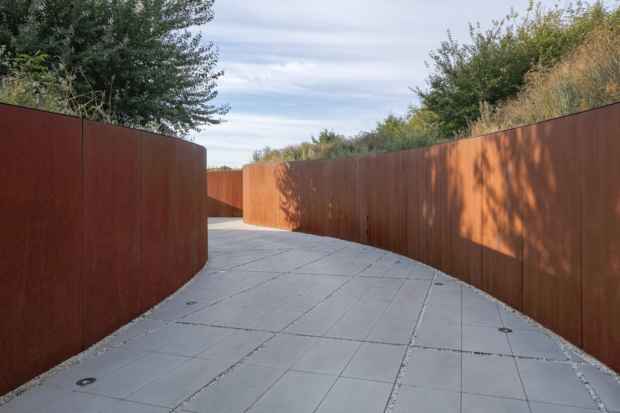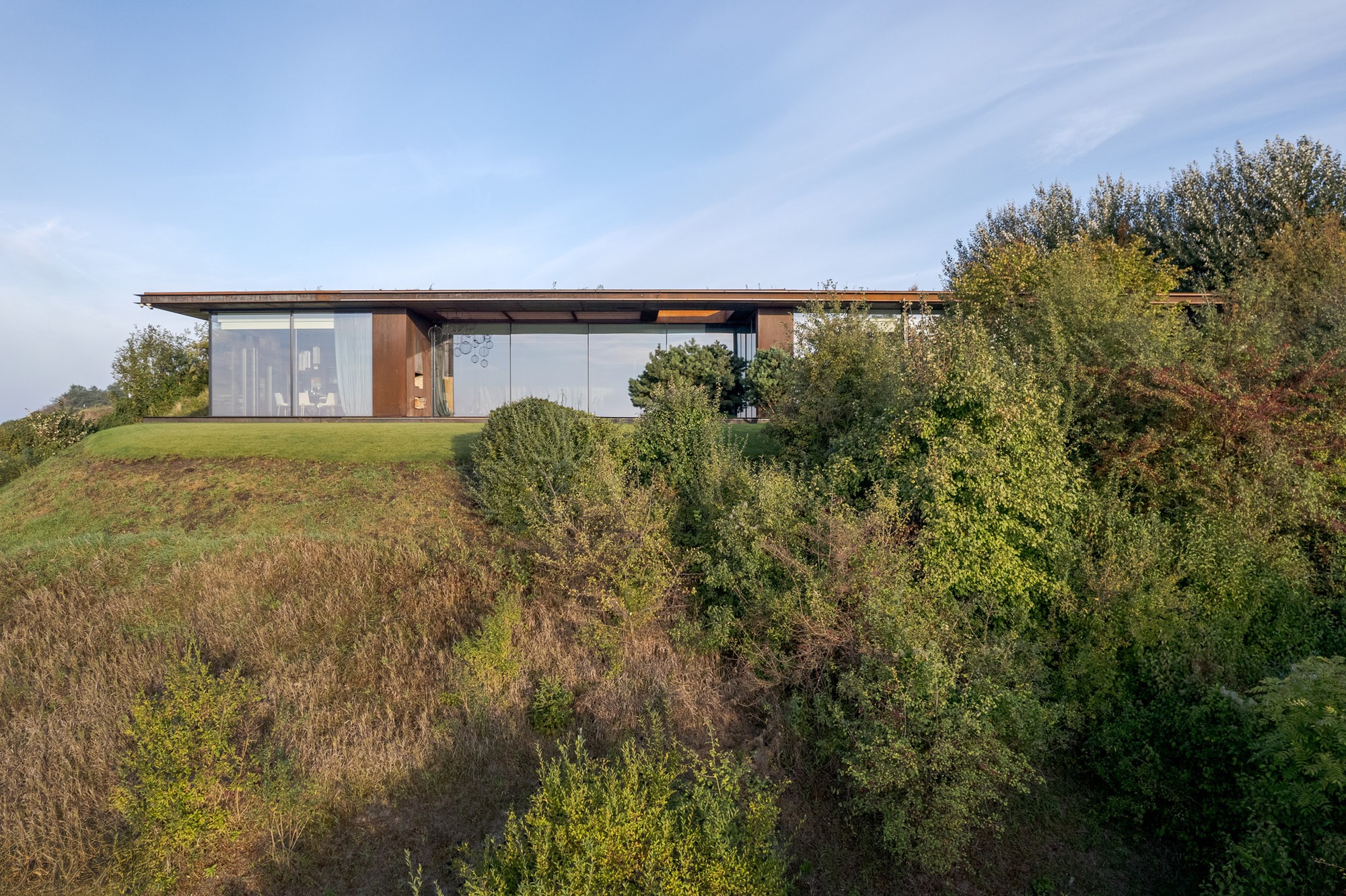 풍경 속에서 건물의 존재감을 더욱 줄이기 위해 전체 구조물은 녹색 지붕으로 덮였다. 좋은 자연광을 확보하고 내부로 녹색을 끌어들이기 위해 경사면에 작은 중정들을 설계했다. 의도한 위장 효과는 강 근처에서 자연스럽게 자라는 식물 종을 사용해 더욱 강화되었다. 같은 이유로 집에는 울타리가 없다. 이 기능은 부지 주변에 자연스러운 경계를 형성하는 자생 관목들만이 수행한다. 건물 외벽과 차도 가장자리는 코르텐 강판으로 마감되었다. 통일된 건물 형태를 유지하기 위해 자동 차고 문은 외벽 패널 뒤에 숨겨졌다. "건물이 지면 아래로 내려앉아 있기 때문에 자연스러우면서도 다소 근육질이고 강인한 표현을 부여하고 싶었습니다. 그래서 두꺼운 코르텐 강판과 프로파일을 사용하기로 결정했습니다." 파벨 나둑의 설명이다.