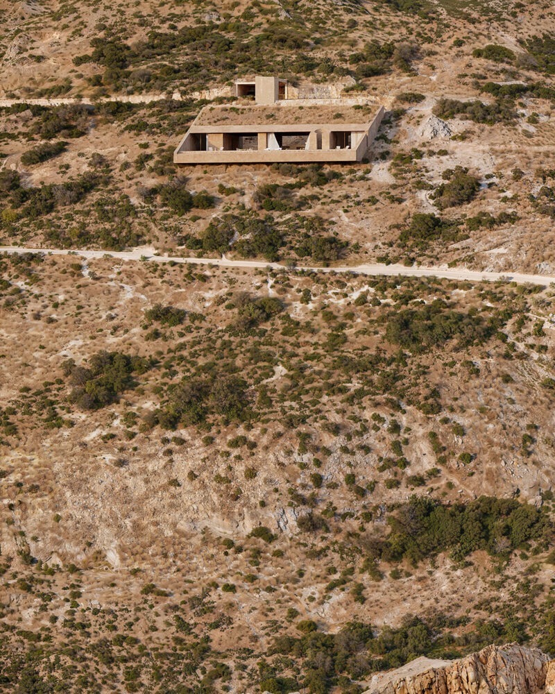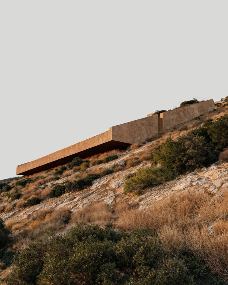 The arrival sequence reinforces this sense of integration. The design team carves a descending entry, where excavated earth and constructed surfaces overlap. The entry stair, hewn into the slope, forms a compressed threshold before releasing into open views, framing the Ionian horizon.