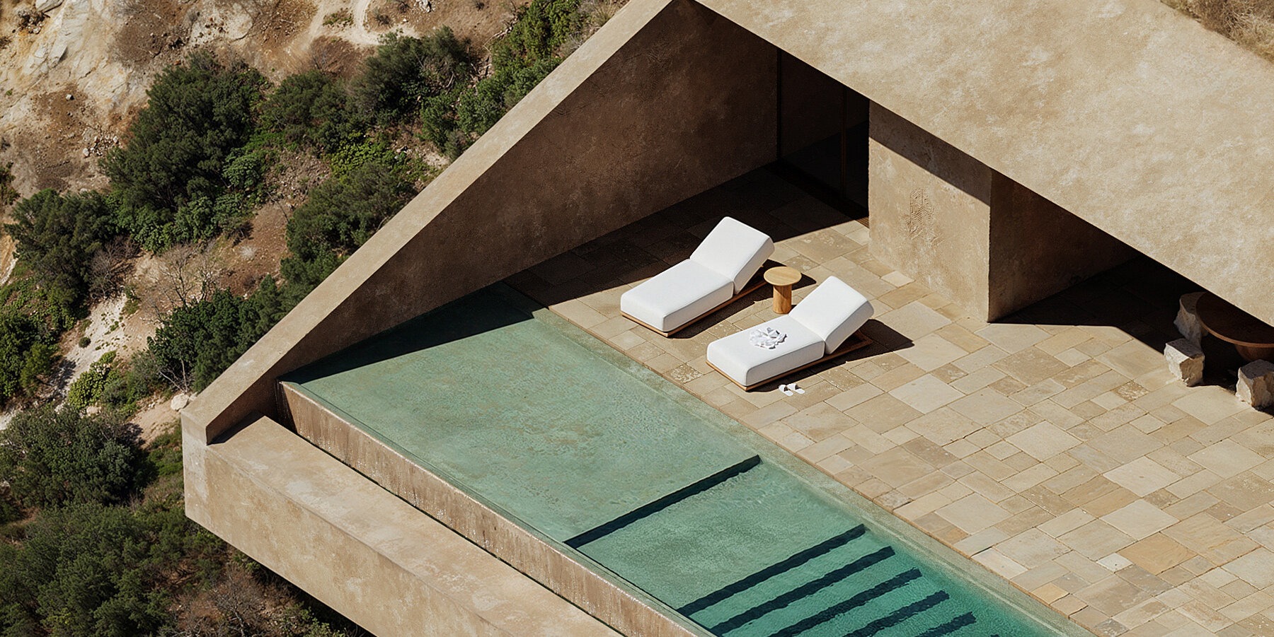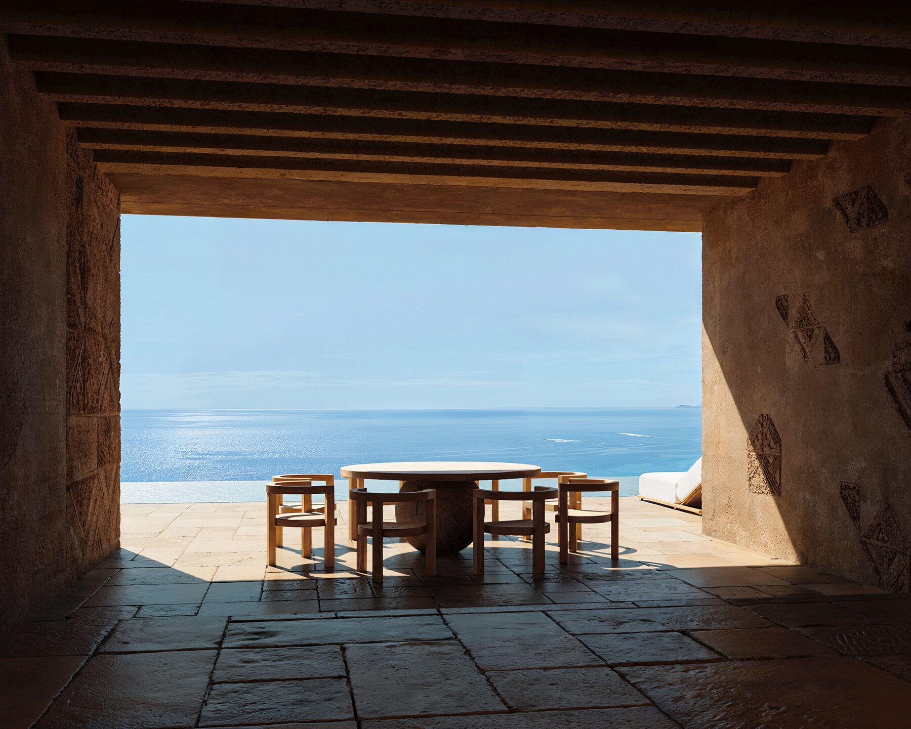 A cantilevered pool extends from the cliff edge, acting as a linear plane that reflects both sky and sea. This gesture reinforces the villa’s position at the meeting point of vertical rock and horizontal water.