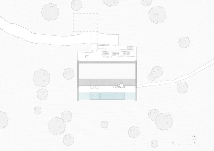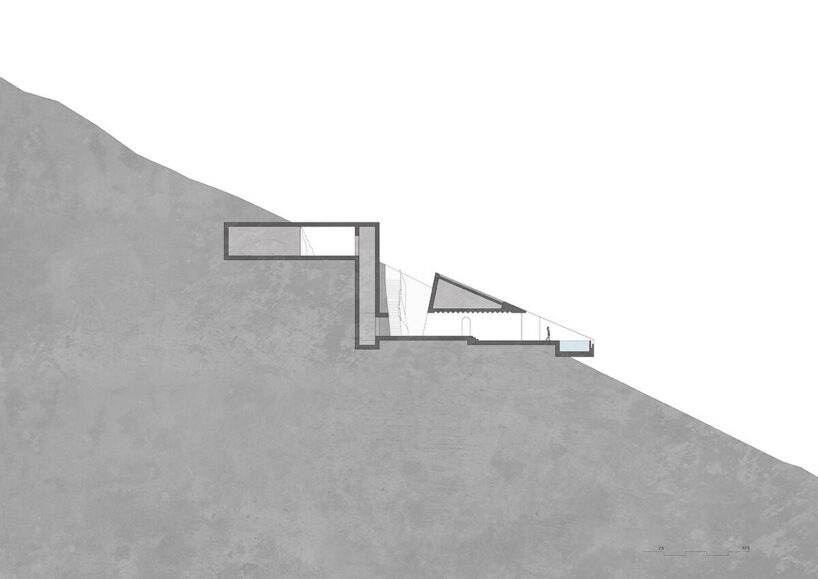 가구와 마감재는 절제되어 액자처럼 담아낸 전망이 주된 시각적 초점이 되도록 한다. 절벽 가장자리에서 캔틸레버로 뻗어나간 수영장은 하늘과 바다를 동시에 반사하는 수평 평면이다. 이는 수직 암석과 수평 물 사이의 만남점에 놓인 건축의 위치를 분명히 보여준다.