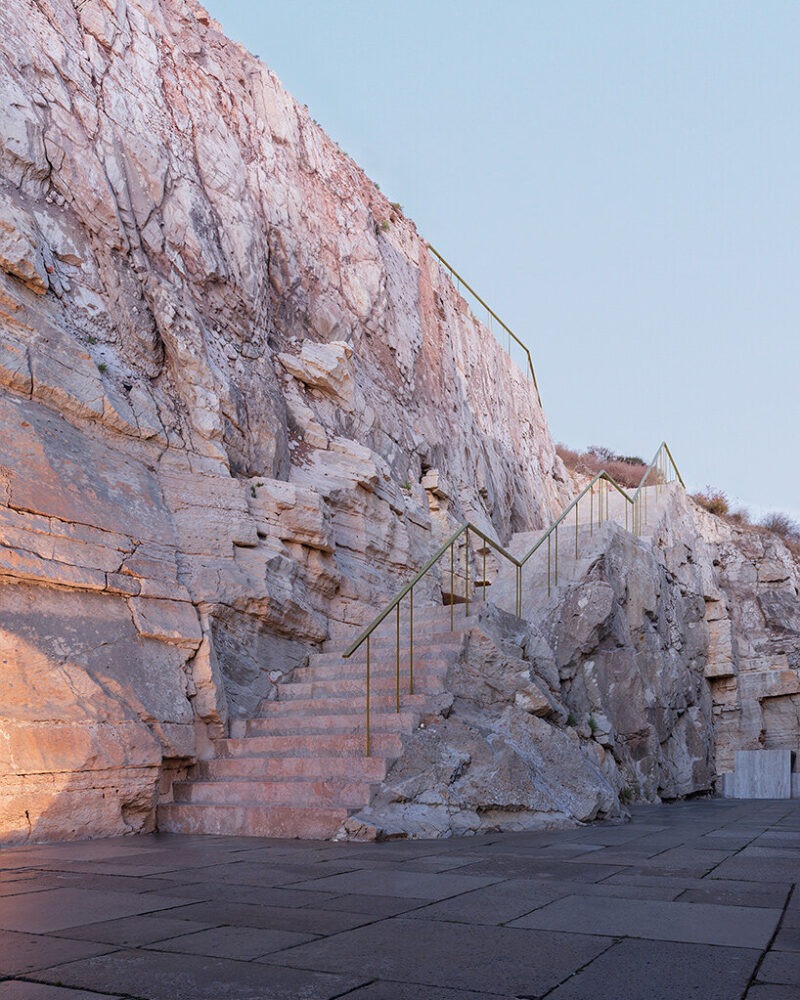 진입 시퀀스는 이러한 통합의 감각을 강화한다. 건축가는 하강하는 진입로를 깎아내며 굴착된 대지와 건축된 표면이 겹치는 지점을 만든다. 경사면에 새겨진 진입 계단은 압축된 문턱을 형성한 뒤 이오니아해의 탁 트인 전망으로 열린다. 산에서 바다로, 압축에서 개방으로, 어둠에서 빛으로 이어지는 공간 경험이다.