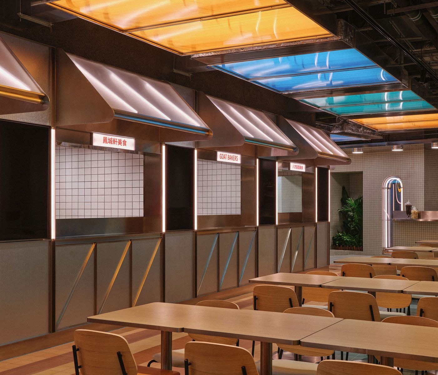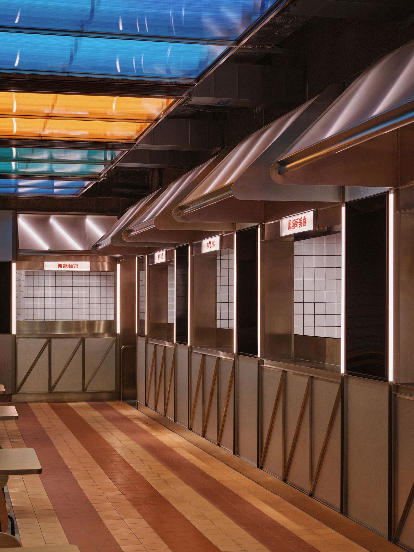 Circulation is animated by strong geometric rhythms: striped floor tiling in green and terracotta references local storefronts and guides movement through the space, while vendor stalls are framed by steel portals with polycarbonate light boxes hovering overhead. These glowing ceiling elements, in shades of amber and aqua, inject colour and energy, serving to evoke the neon lit vibrancy of Macau’s streets. Elsewhere, bare brick walls paired with minimalist timber seating offer moments of warmth and tactility, grounding the market’s atmosphere in material honesty.