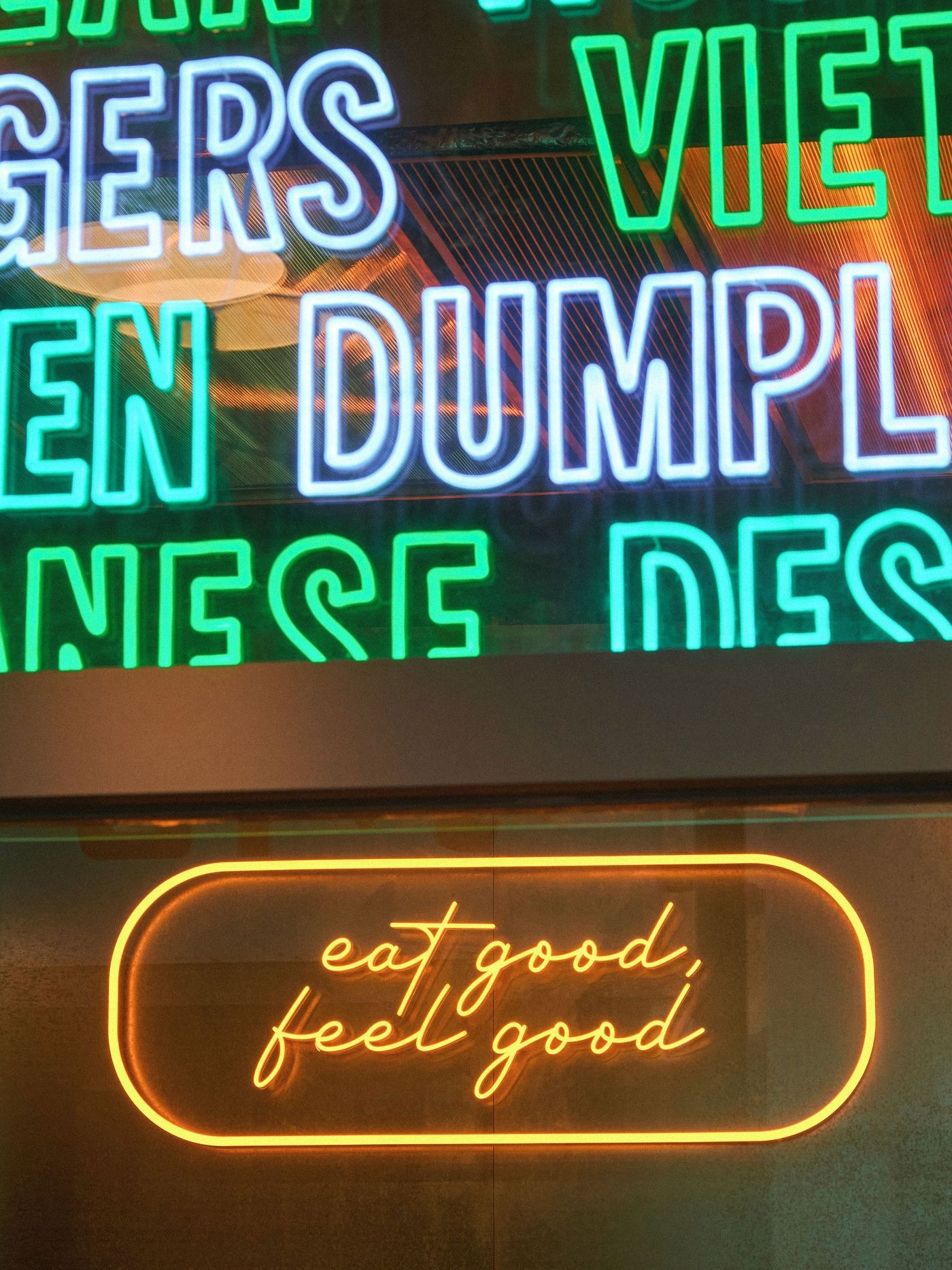 The market unfolds over two levels, with flexible plug-and-play stalls offering an eclectic mix of cuisines Chinese, Portuguese, Japanese, Thai, Taiwanese—mirroring the city’s famous culinary diversity. Communal seating areas encourage mingling, while a playful series of lighting elements, from wall-mounted strips set against raw masonry to glowing signage proclaiming “eat good, feel good”, enhance the sense of urban vibrancy.