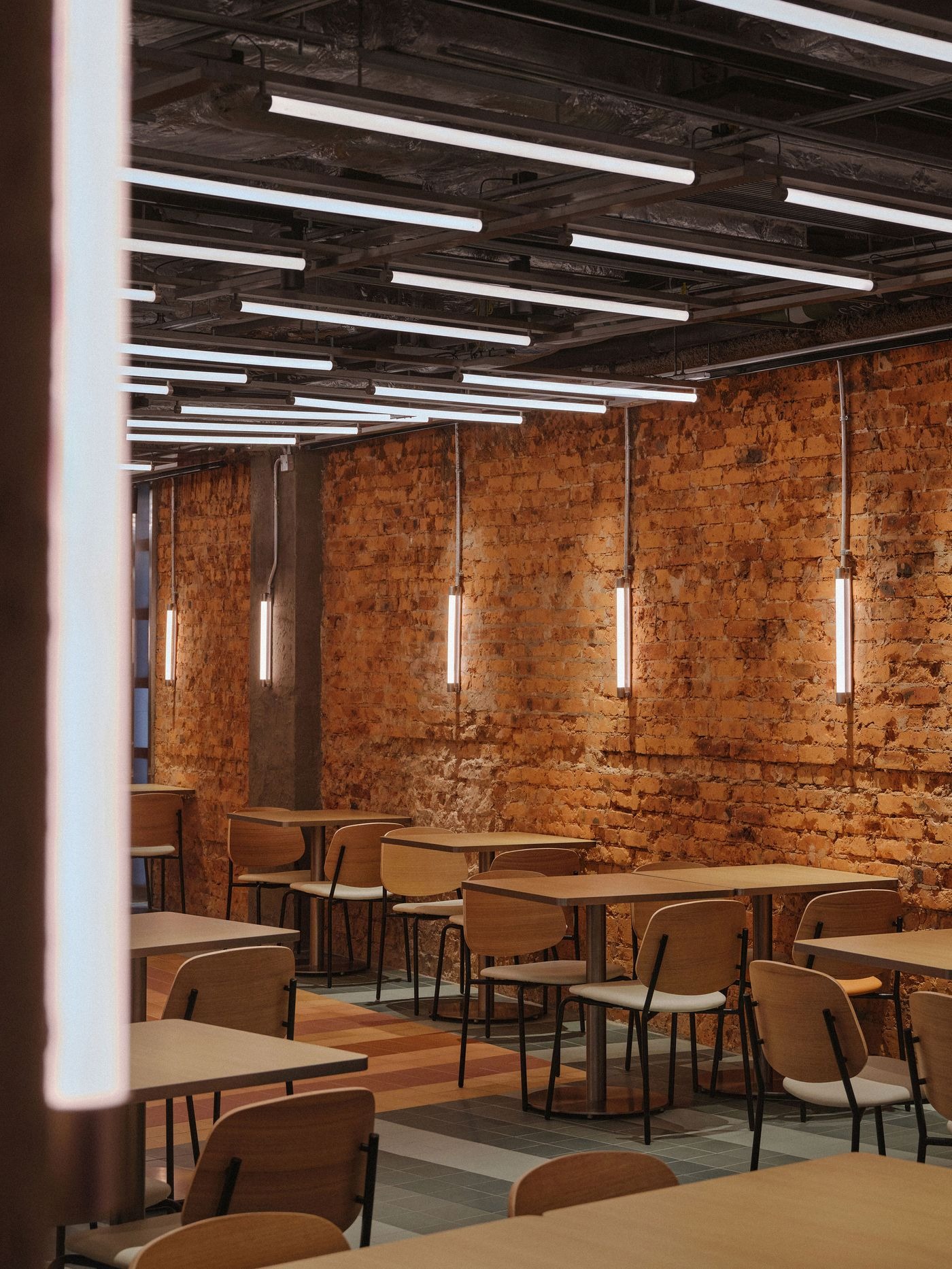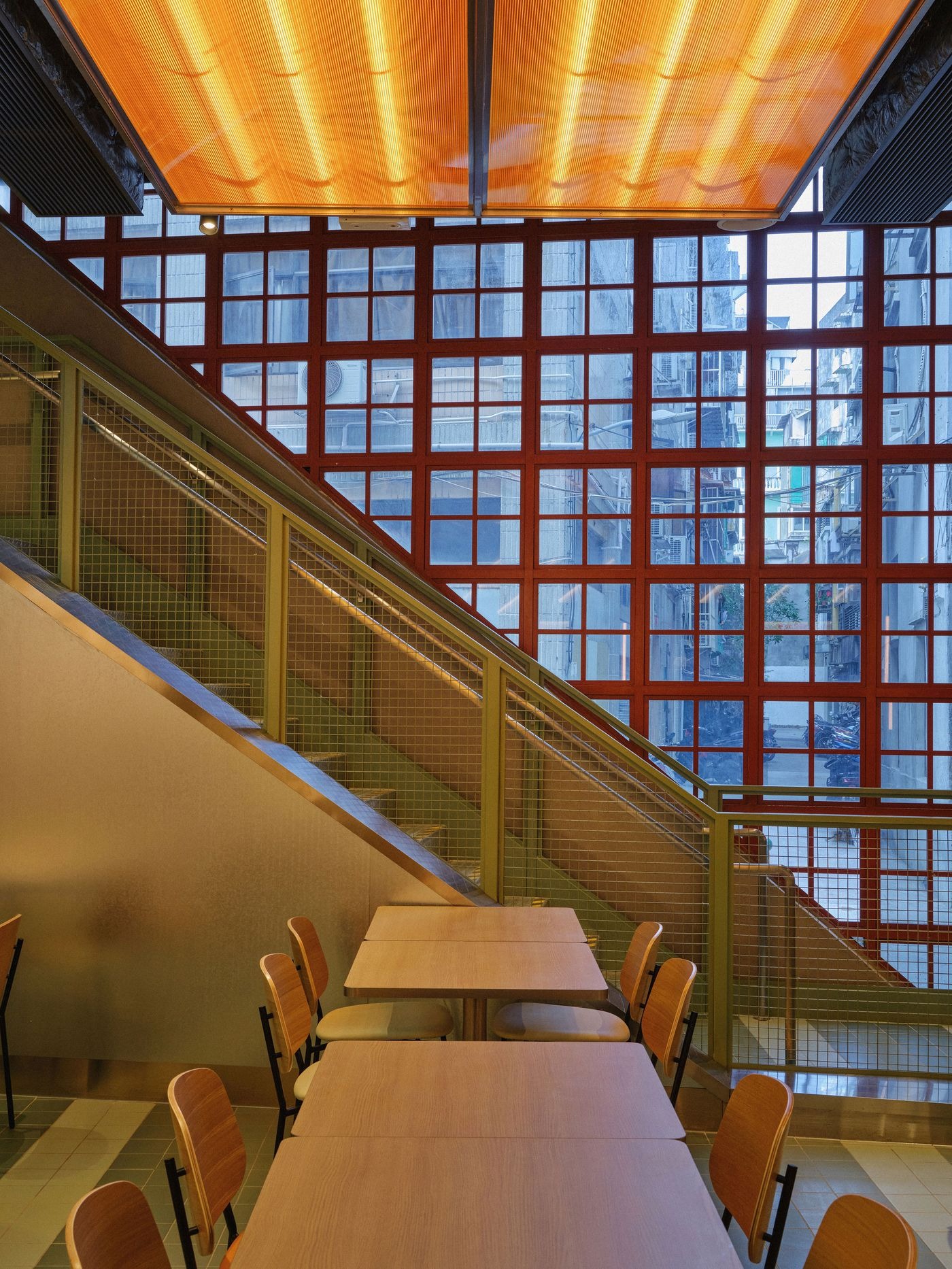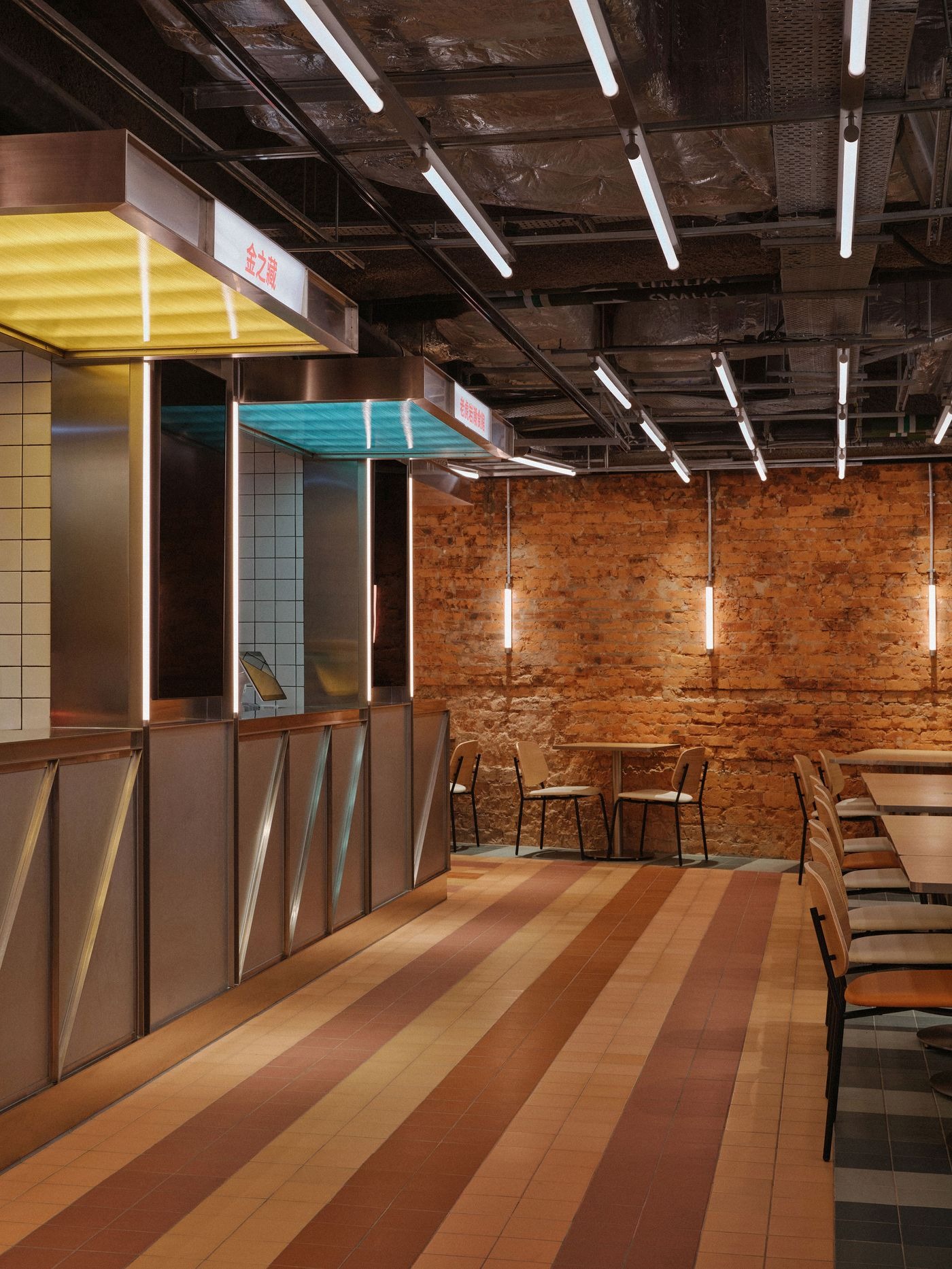 아연 도금 강판, 철망, 세라믹 타일, 콘크리트 벽돌 같은 재료들은 도시의 골목길에서 가져온 것이다. 라인하우스는 정밀한 디테일과 절제된 세련미로 이 겸손한 재료들을 품격 있게 승화시켰다. 동선은 기하학적 리듬감을 따른다. 테라코타 톤의 줄무늬 바닥 타일은 로컬 상점가를 떠올리게 하며 자연스럽게 발걸음을 이끌고, 판매대는 강철 프레임 구조로 둘러싸이며 그 위로는 폴리카보네이트 조명 박스가 떠 있다. 호박색과 청록색으로 은은하게 빛나는 이 천장 요소들은 마카오 거리의 네온 활기를 환기시키며 공간에 색채와 에너지를 불어넣는다. 한편 드러난 벽돌벽과 미니멀한 목재 좌석이 어우러져 따스함과 촉감이 느껴지는 순간을 선사하며, 재료 본연의 물성으로 마켓의 분위기를 단단히 뿌리내린다.