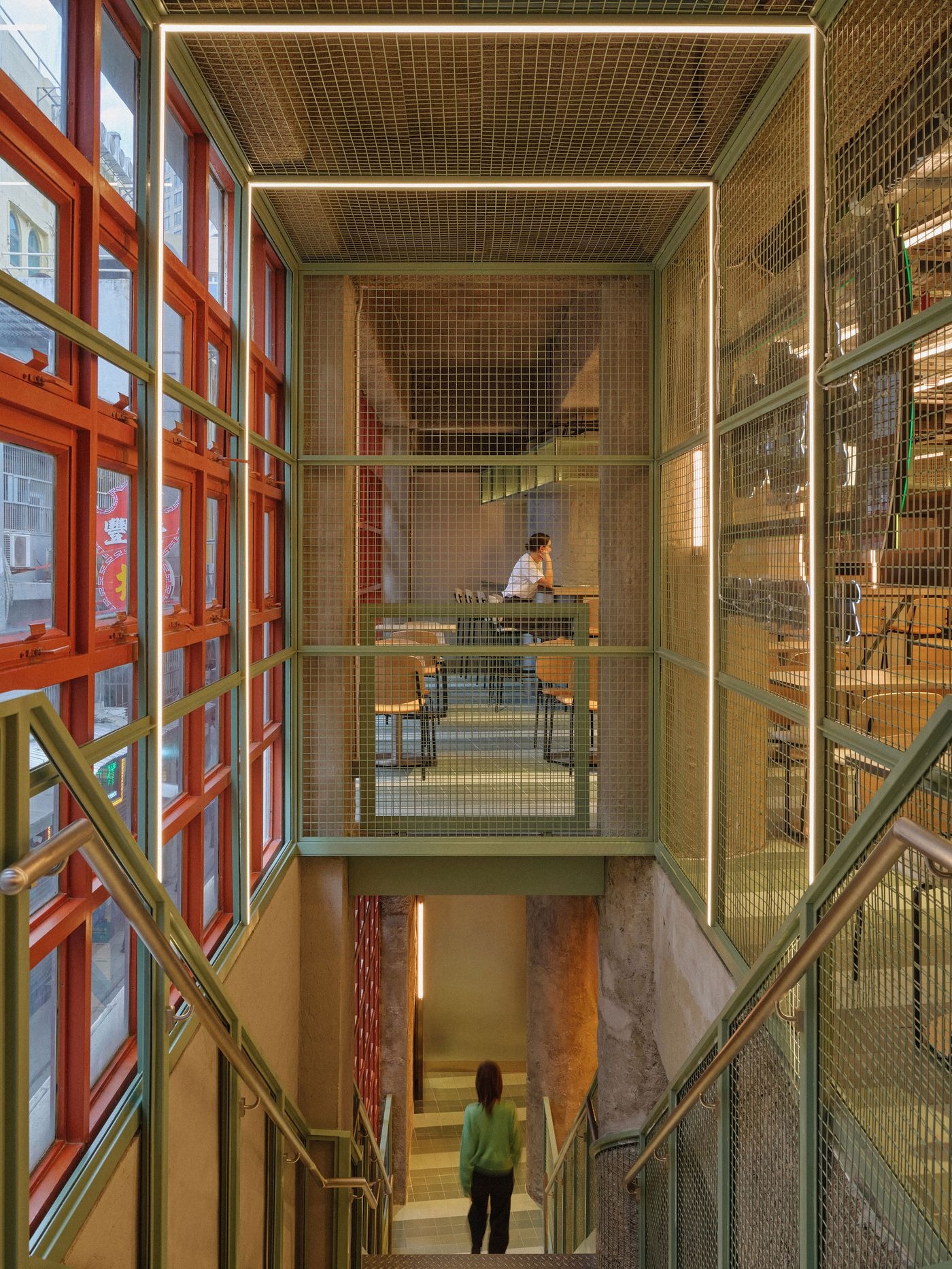 Guided by the developer's philosophy of Preserving Tradition, Embracing the Future, Linehouse embarked on a careful restoration of the building's Art Deco façades, adorning them with luminous Chinese characters that echo the city’s neon-lit streetscape. Inside, they pursued a more audacious vision, paring the structure back to its elemental concrete and masonry bones before introducing a sequence of refined minimalist interventions characterized by crisp rectilinear forms and industrial materials such as galvanized steel, metal mesh, ceramic tiles, and concrete bricks. Drawn from the city’s laneways, the project has successfully elevated these humble through precise detailing and understated refinement.