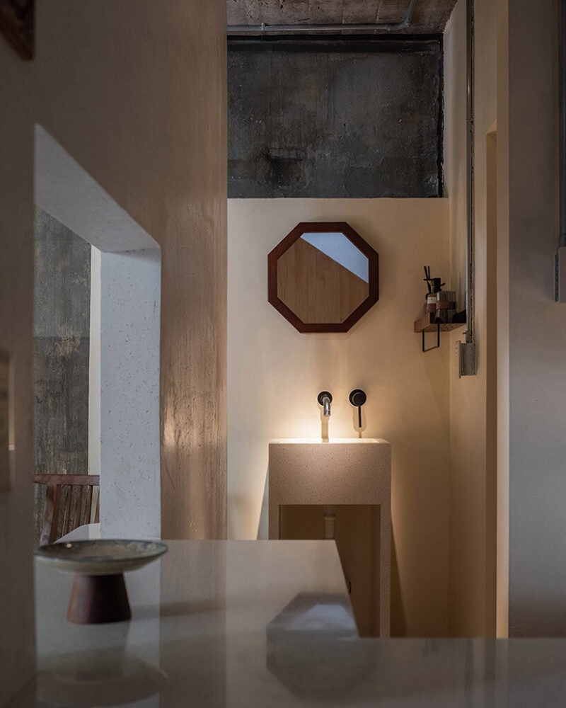 This slow method of making, a resistance to standardized construction, brings a lived character to the building. The rough concrete surfaces, slightly irregular joints, and repaired edges form an honest texture that corresponds to the layered history of the lane.