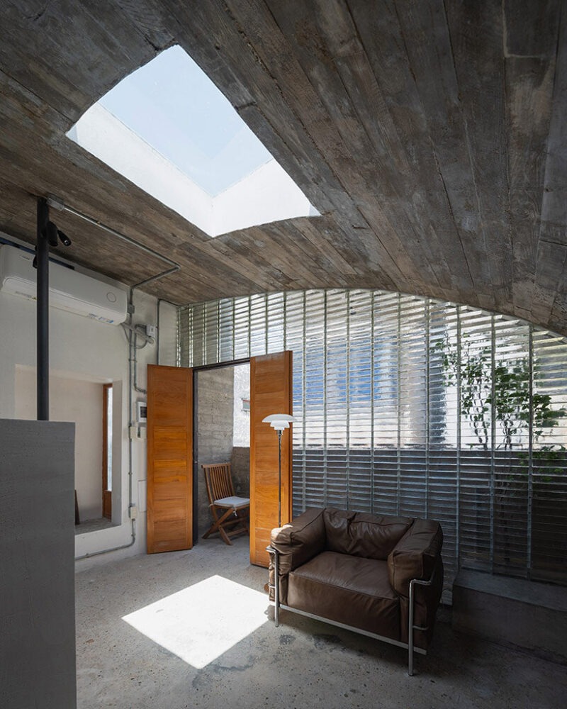 While Xuebei Home is enveloped by its taller neighbors of Guangdong’s Qiaodong Old Town, only a sliver of sky is revealed above. To open the space without disturbing the fragile balance between properties, Huang introduced a sequence of small voids, or punctures that allow light and air to pass through. The interior is organized vertically: a communal room and kitchen occupy the ground floor, two bedrooms sit above, and a reading loft rests beneath the curved roof.