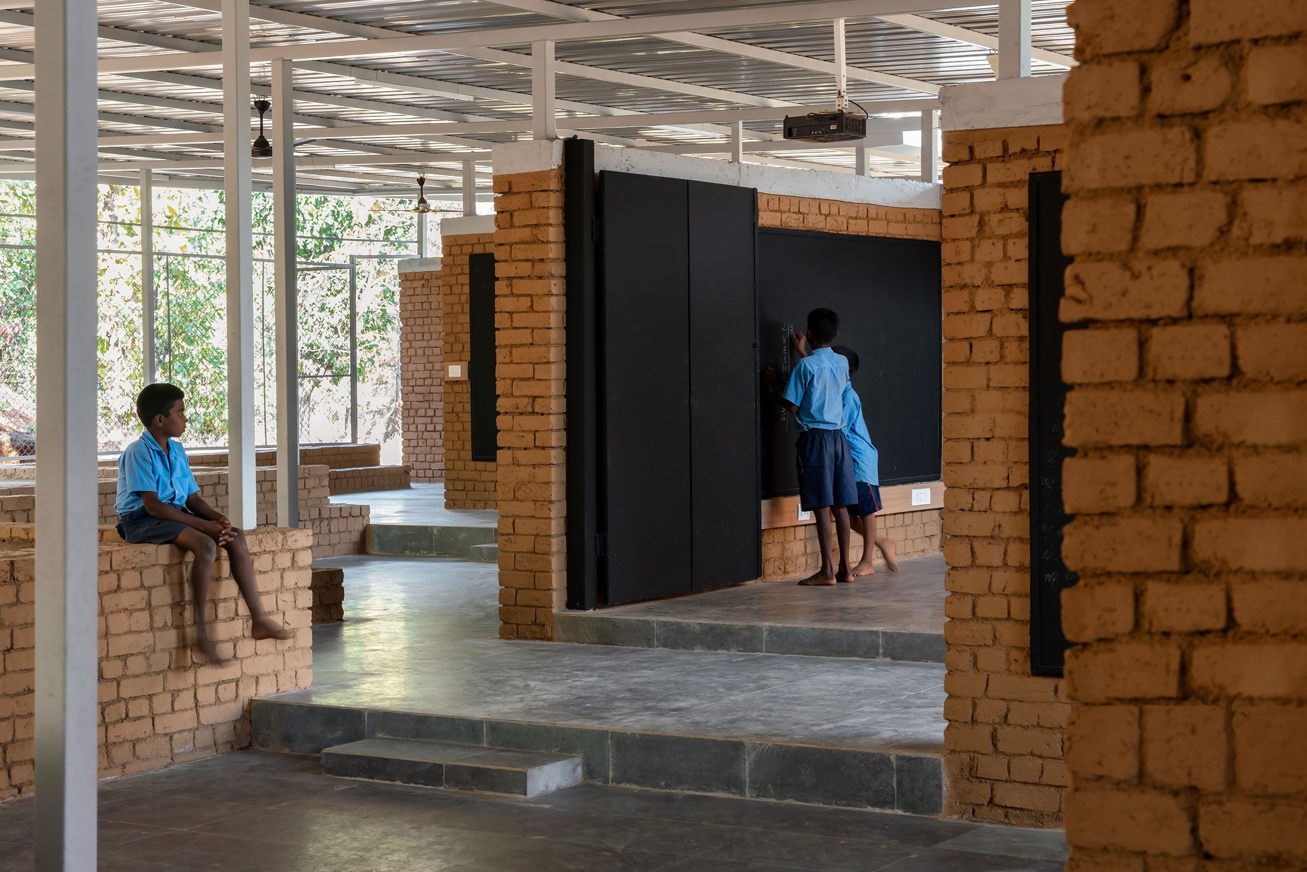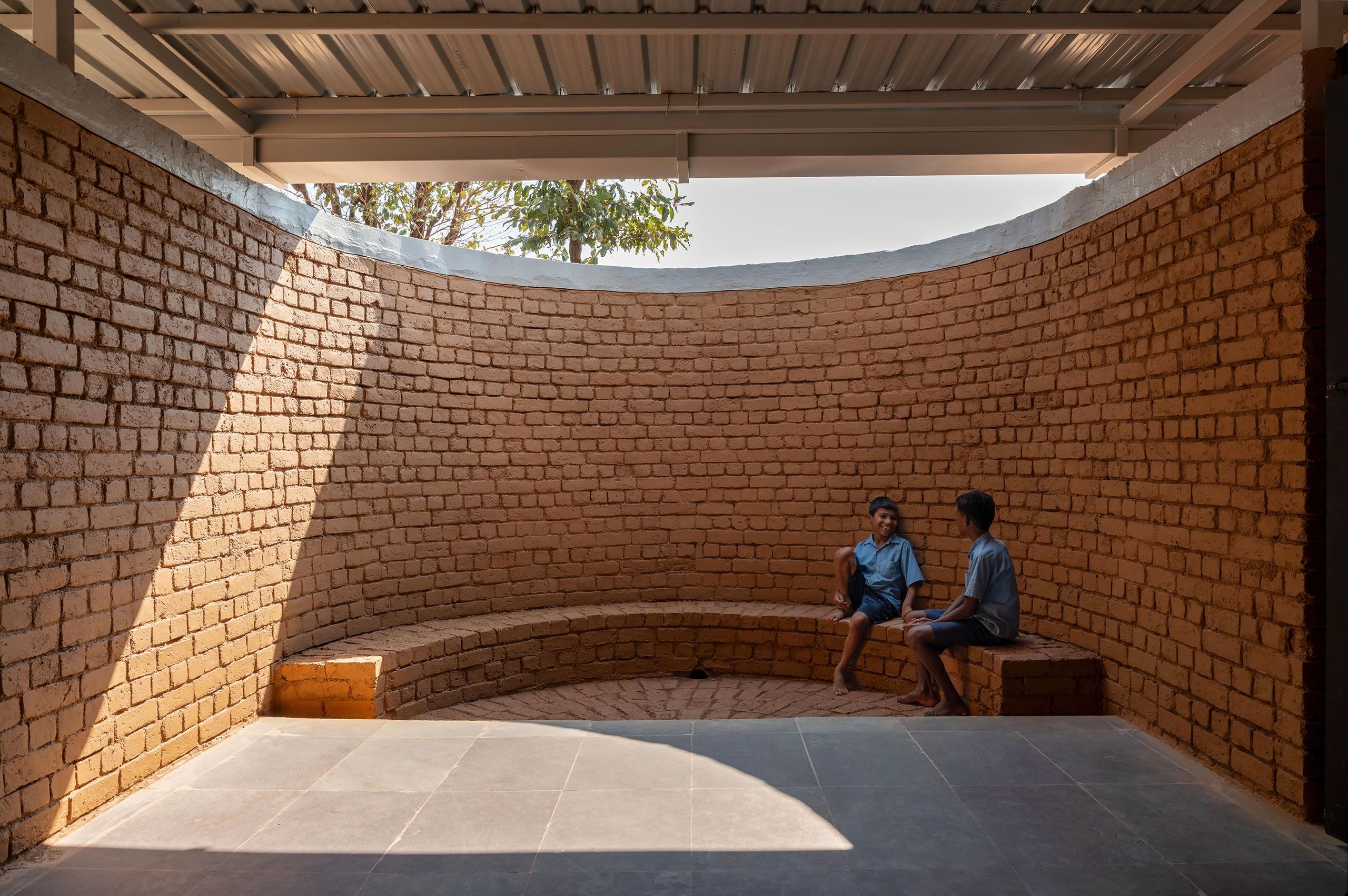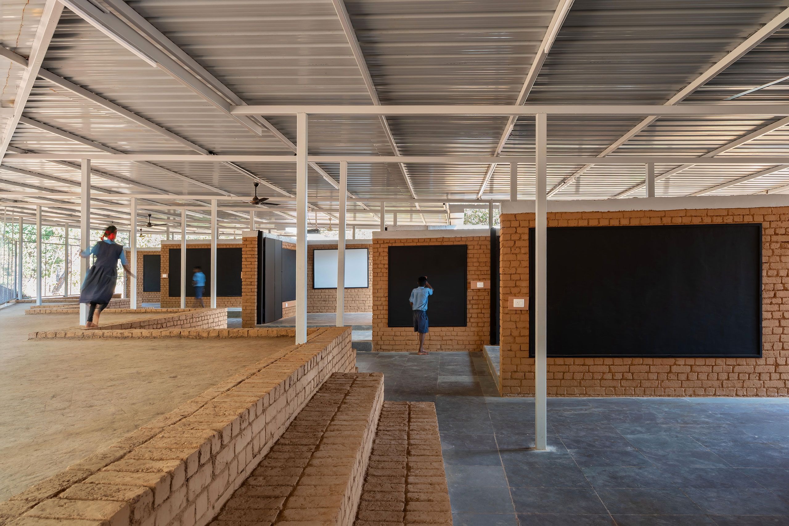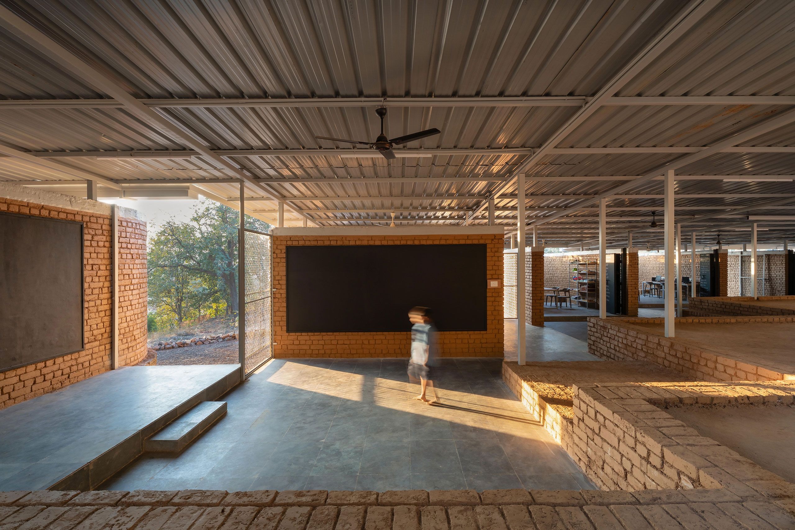 Materially, the school balances pragmatism and tactility. Load bearing walls of exposed brick are warm to the touch and durable, while their surfaces allow for easily mounting writing boards. Stone flooring in formal zones gives way to warmer cow-dung flooring on the elevated plinth, comfortable for sitting on or even napping, while a floating metal roof improves ventilation.