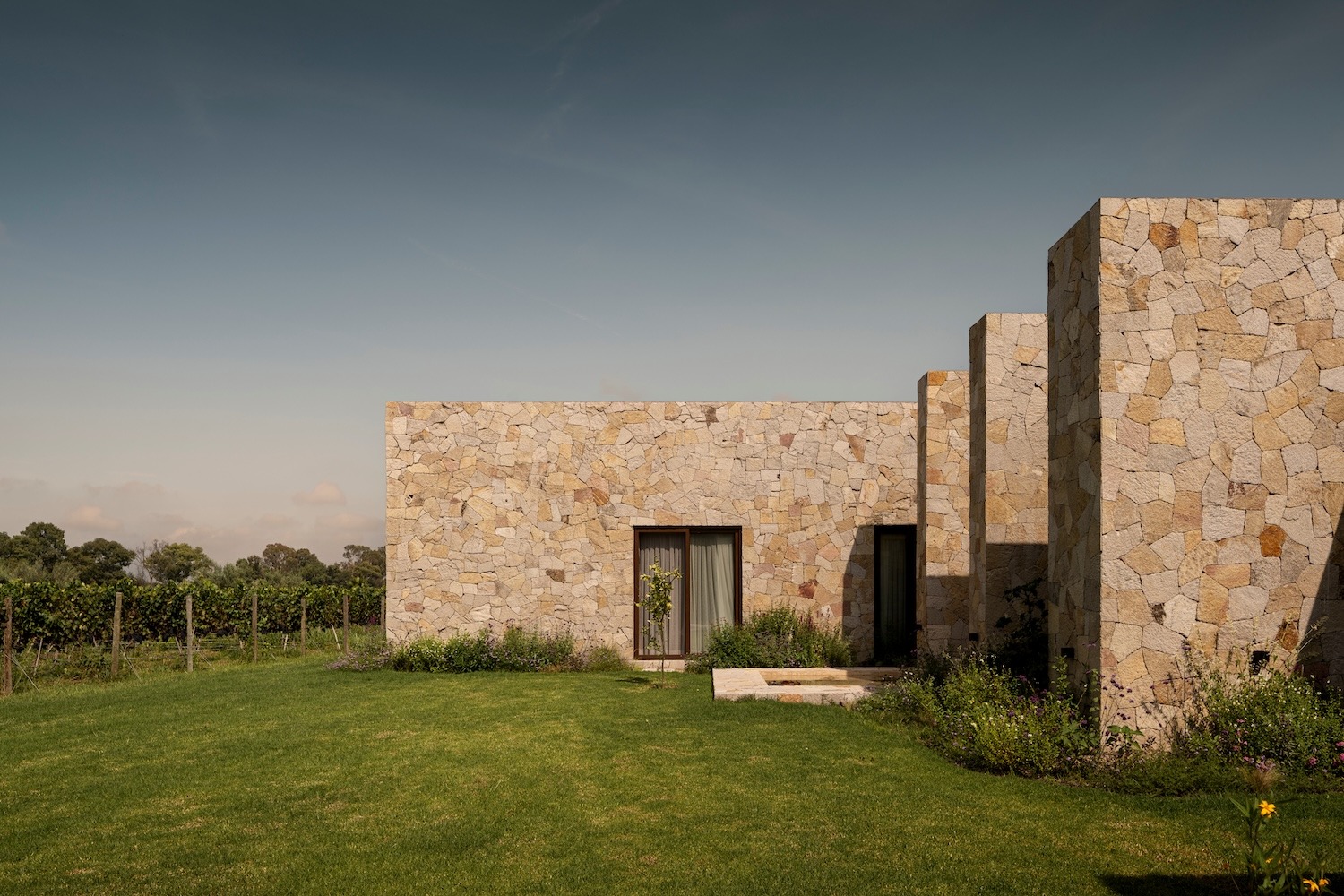 다섯 채의 건물은 각기 다른 조경 영역으로 열려 있으며, 포도밭과 자연 풍경을 향한 명확한 조망을 제공한다. 이들은 건물을 가로지르는 긴 복도로 연결된다. 천장이 두 배로 높은 진입 공간을 통해 들어서는 이 복도는 공용 공간이 모인 서쪽 동과 네 개의 침실이 있는 동쪽 사적 영역을 나눈다. 서쪽에는 식당, 테라스, 주방, 거실, 차고, 서비스 공간이 자리한다. 일직선으로 이어진 이 구조는 기능적 영역을 명확히 구분하면서도, 전략적으로 배치된 창을 통해 풍경을 바라볼 수 있도록 한다.