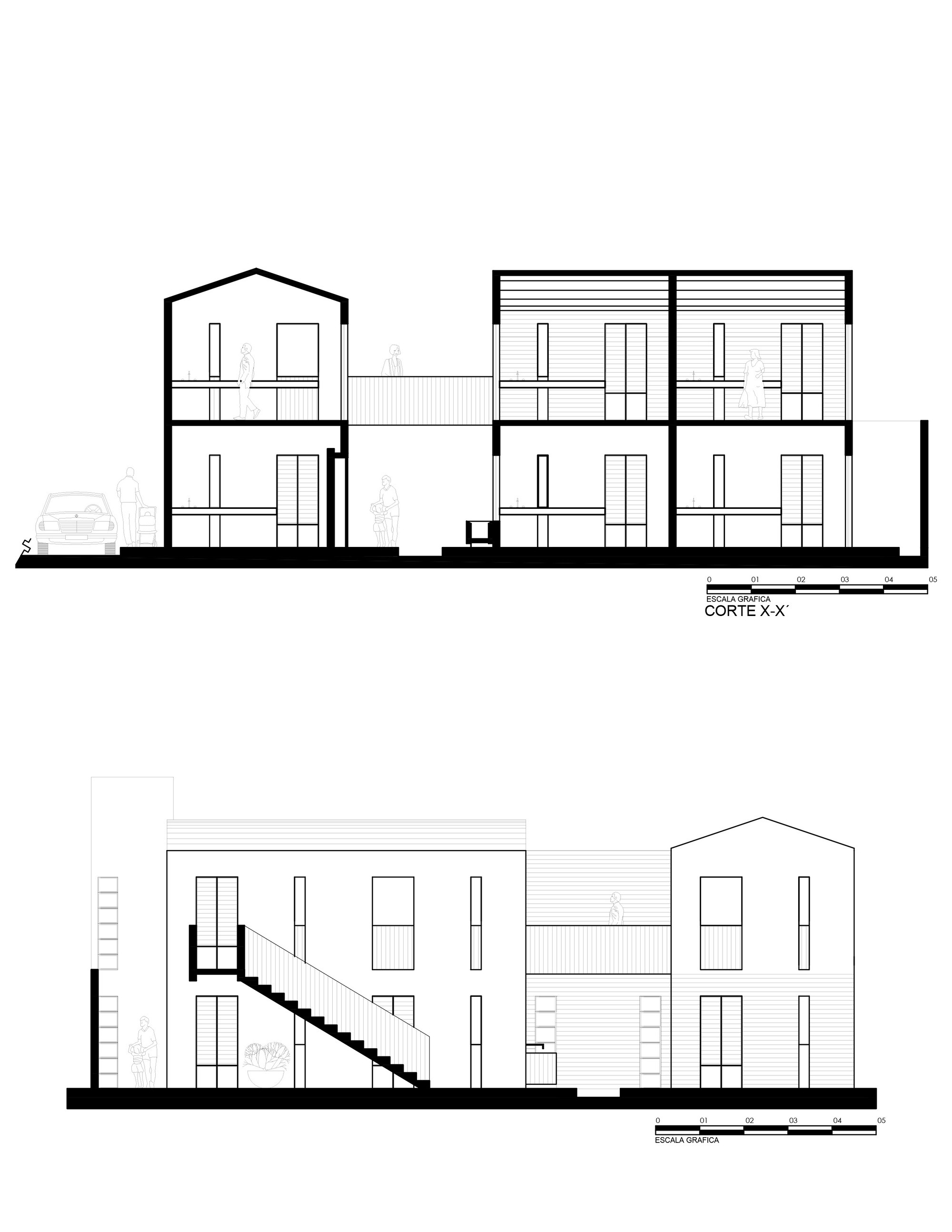The complex consists of two volumes with gable roofs connected by a central bridge that articulates circulation, voids, and visual connections. The sober and monolithic volumetry closes off towards the street and opens up to a central courtyard, generating an introspective architecture that responds to the climate and the traditional urban context.