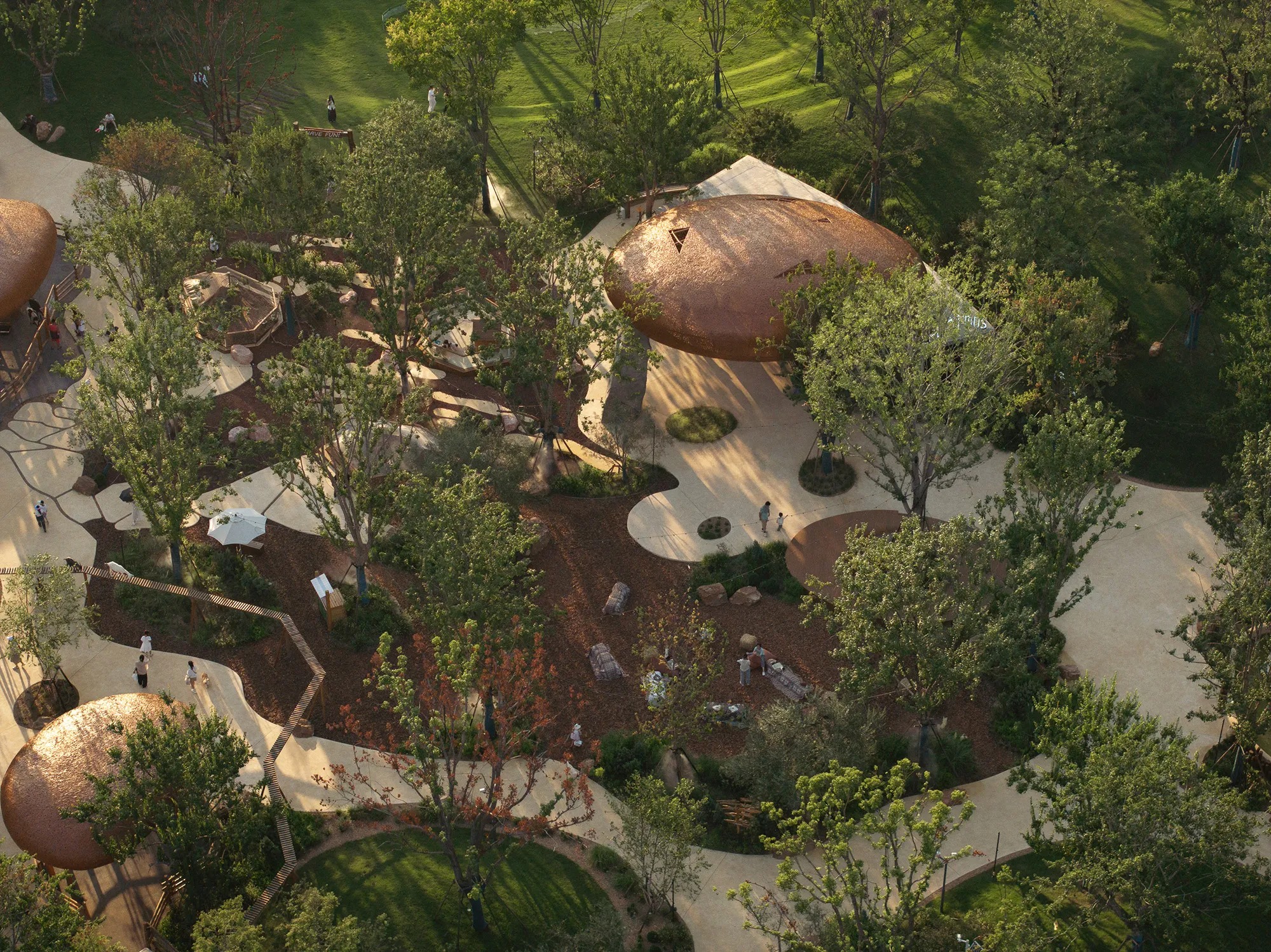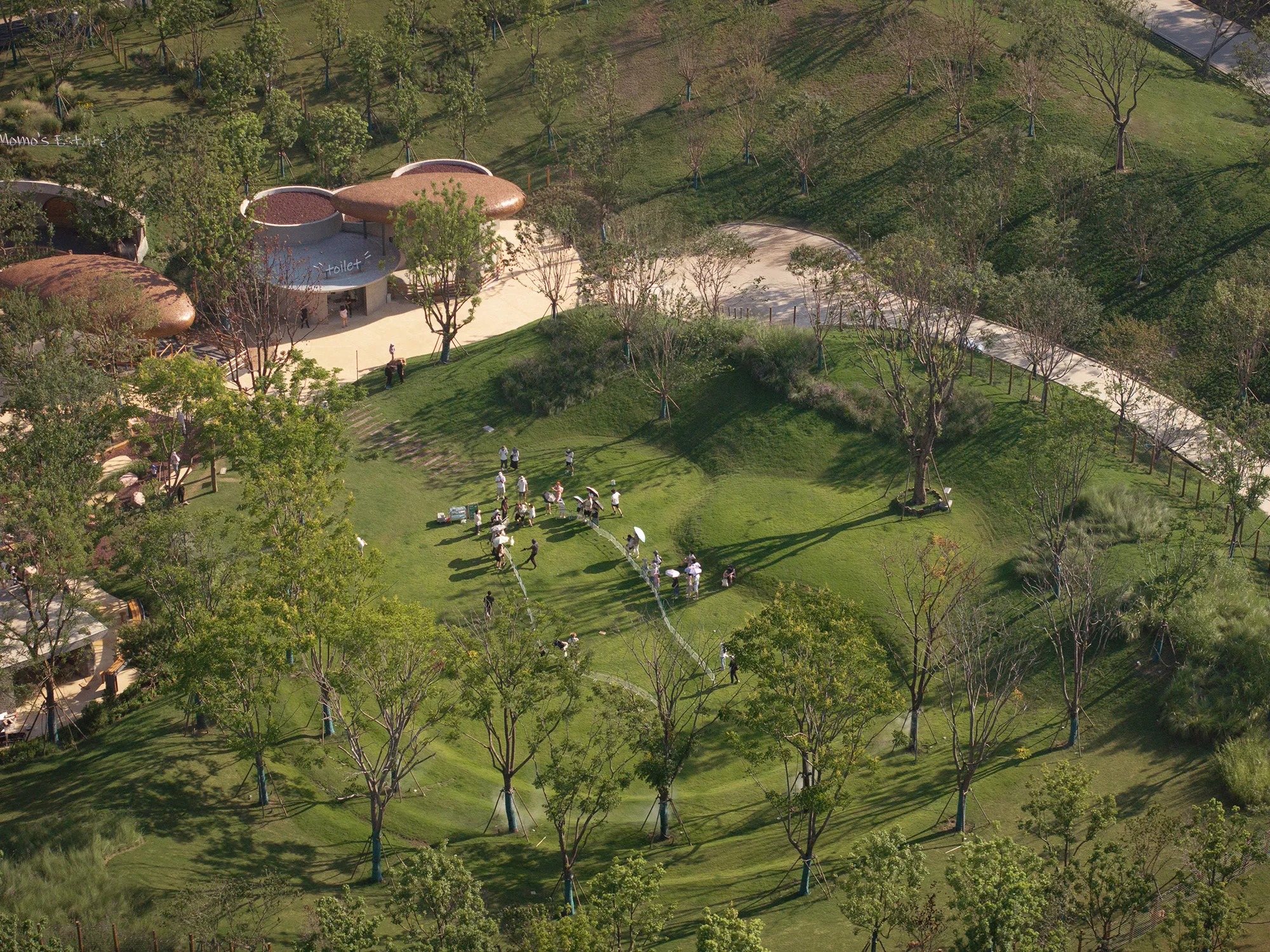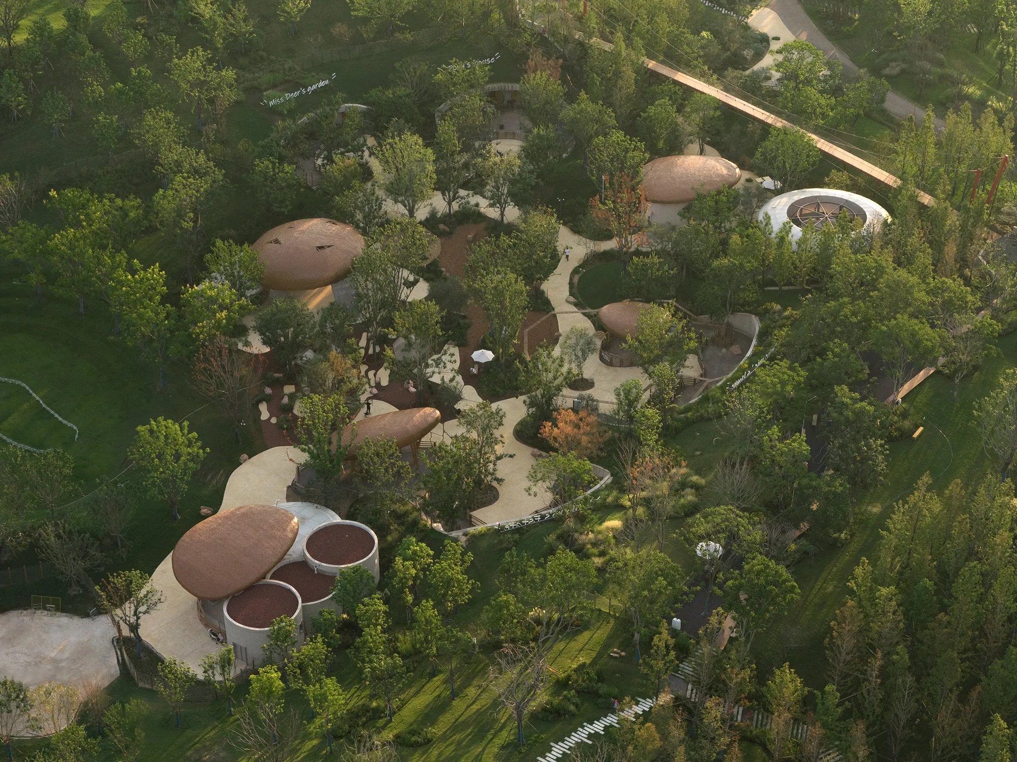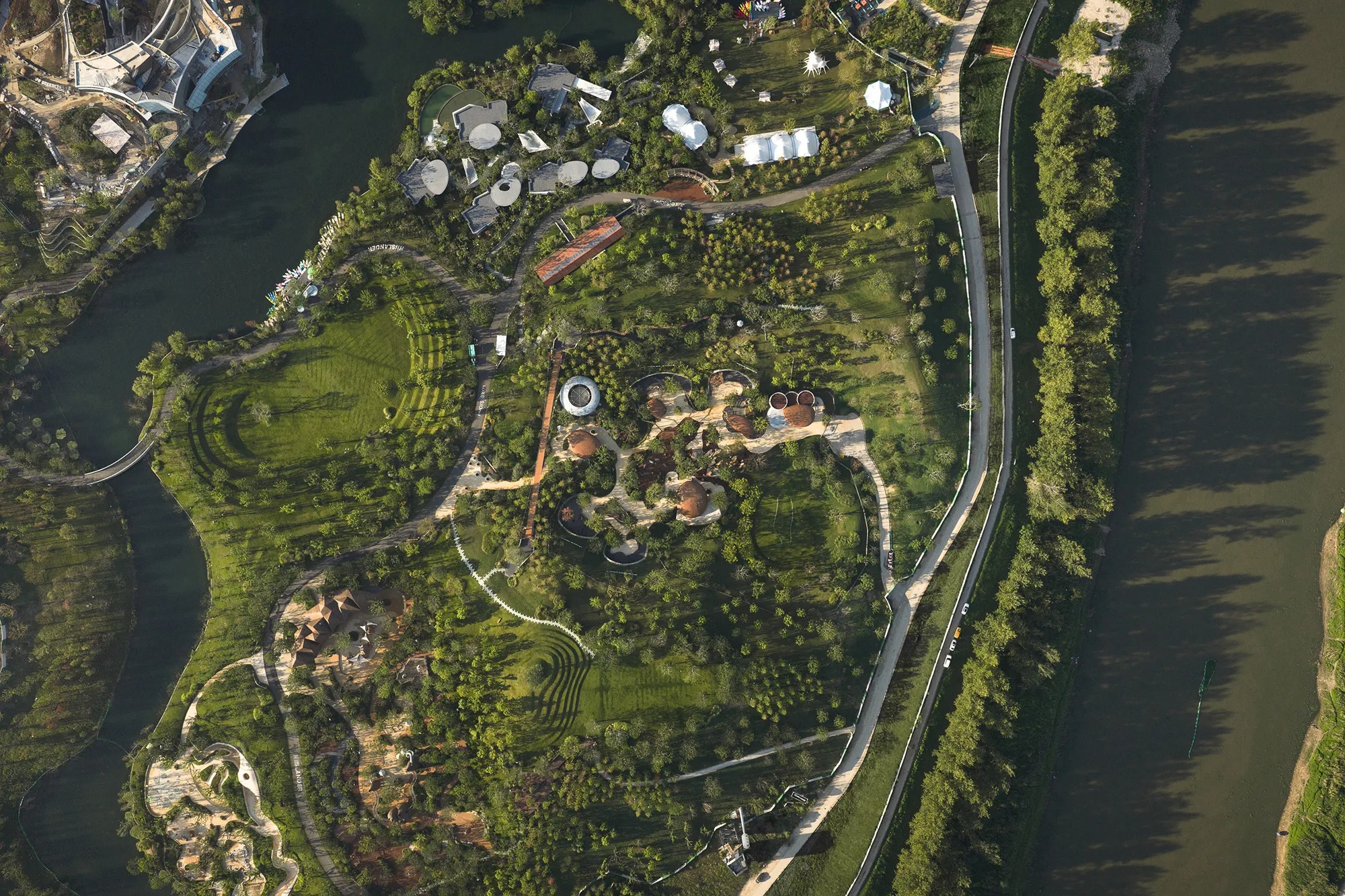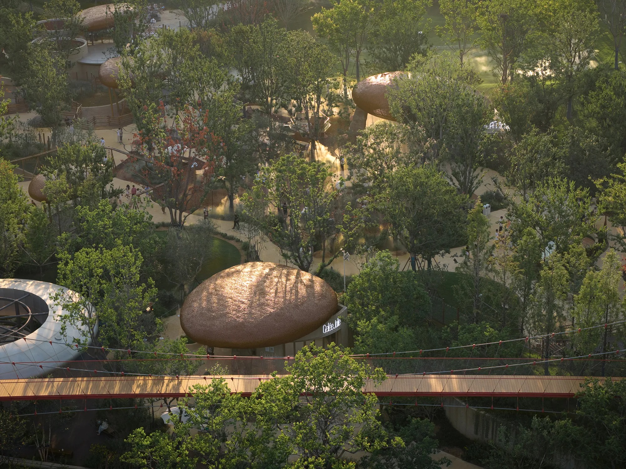 우한의 맥시아일랜드 농장은 주자강을 따라 펼쳐진 소규모 농업 공원이다. Various Associates는 지형을 따르는 전략을 택한다. 작은 건물들을 경사면에 반쯤 묻고, 초록 지붕을 목초지로 이어지게 한다. 순환 동선이 동물 우리, 열린 공방, 작은 음식 파빌리온을 엮어낸다. 대나무를 엮은 캐노피와 돌처럼 둥근 건물들이 계곡의 일부처럼 읽힌다. 절제된 금속 랜드마크가 방향을 안내하되, 장소의 연속성을 깨뜨리지 않는다.